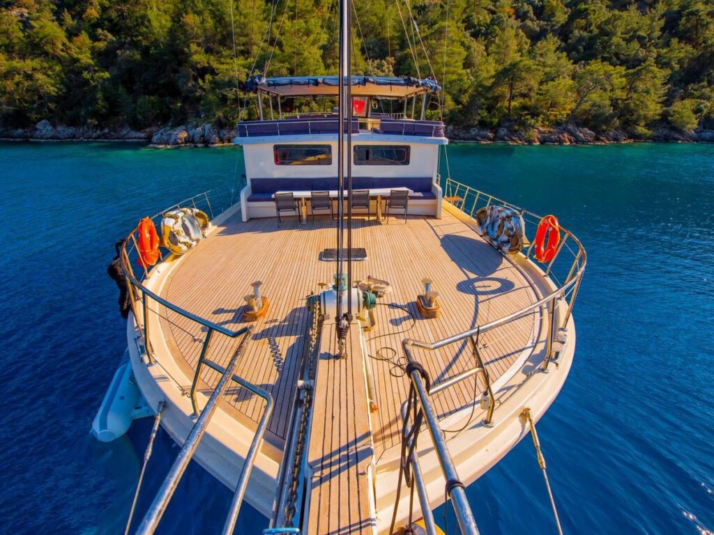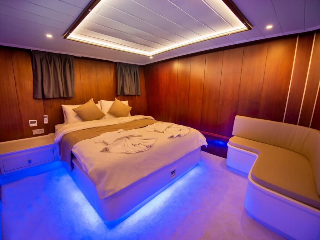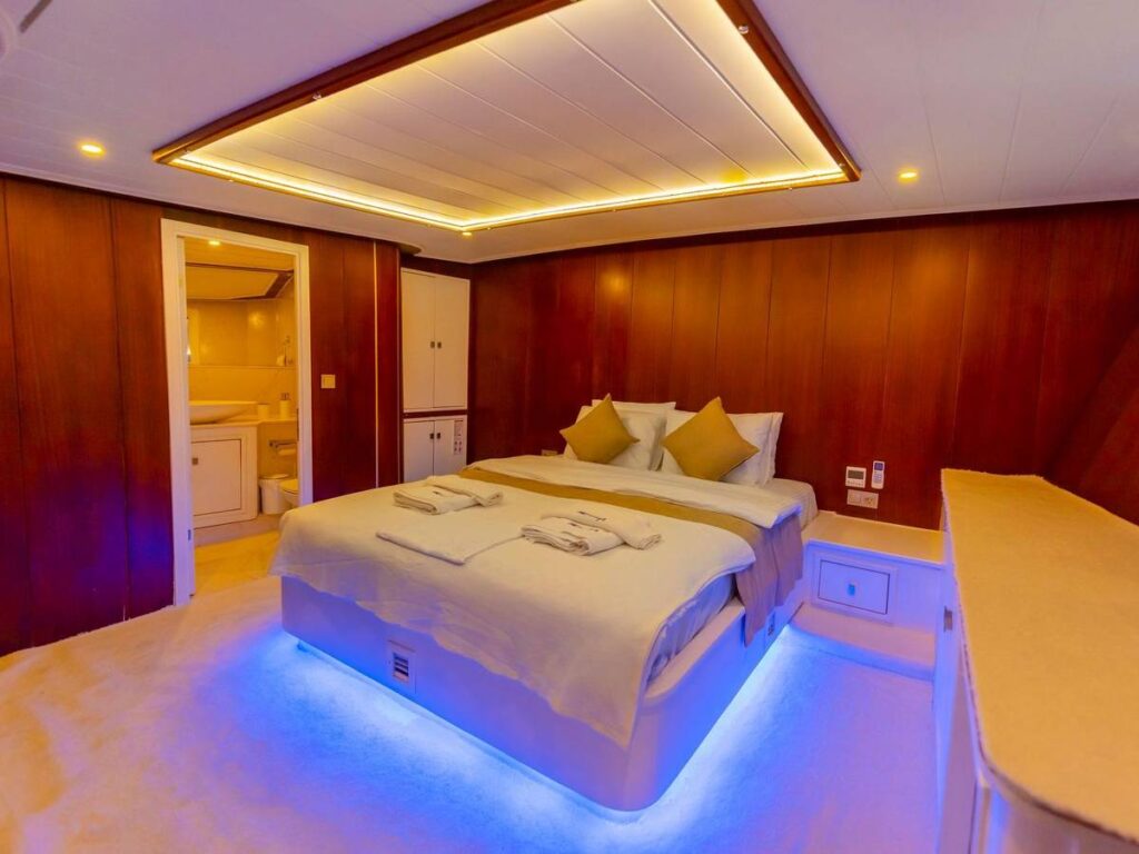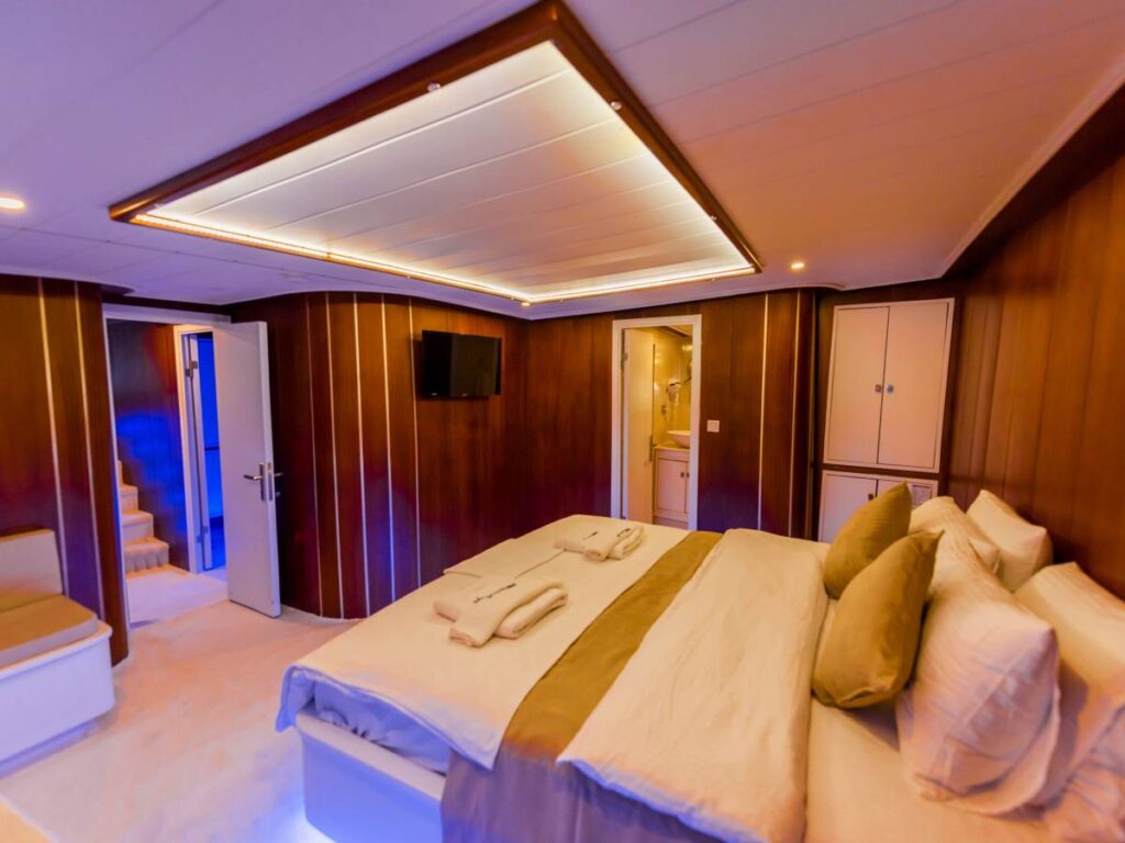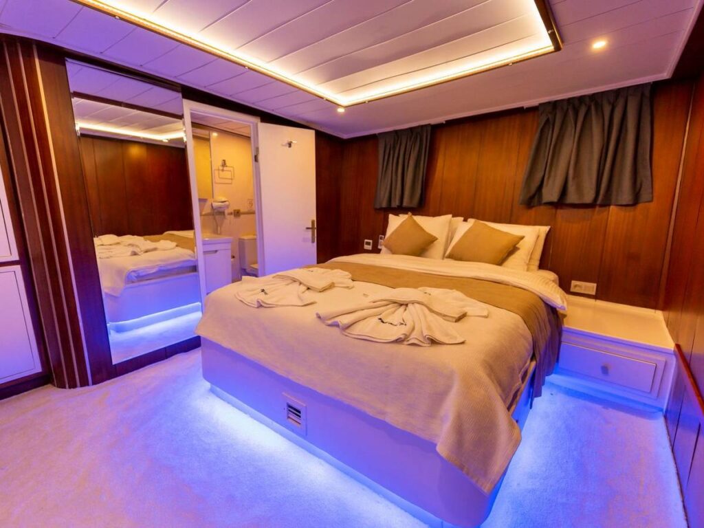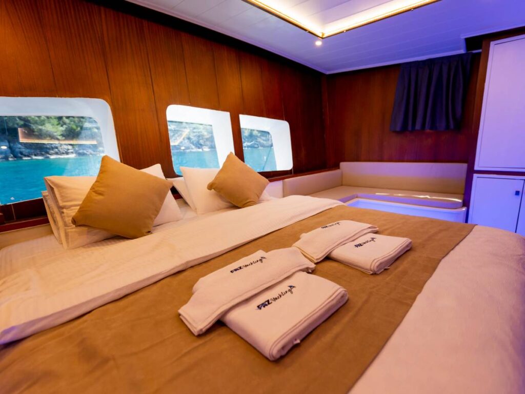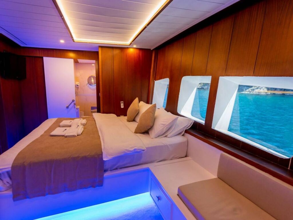 With 5 cabins and a capacity of 10 people, you will have the wide and comfortable facilities of a trawler while breathing the air of the gulet. Comfort has been prioritized and opportunities have been expanded. The comfortable cabins have air conditioning, TV and bathrooms with shower cabins, while the decks have areas to enjoy the sun.