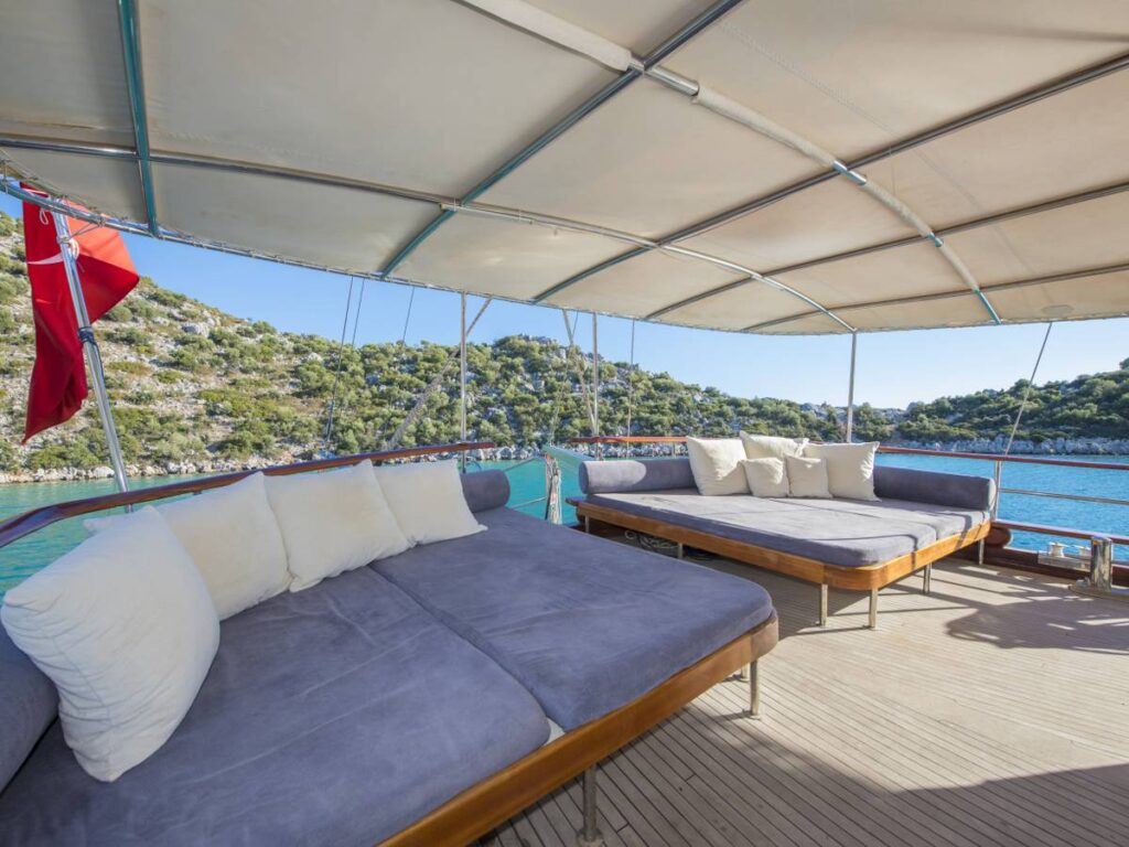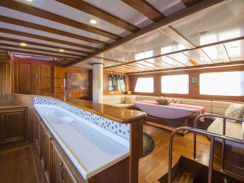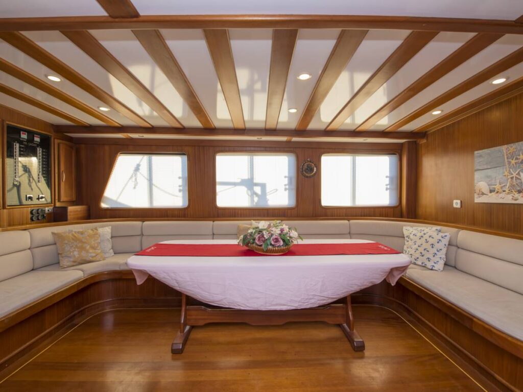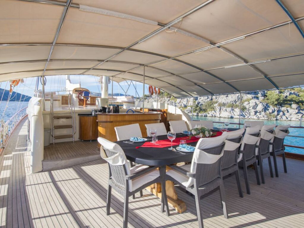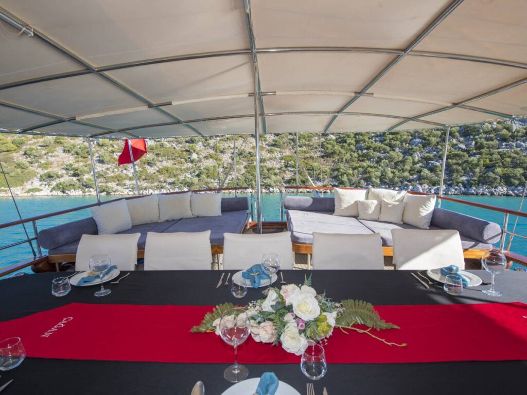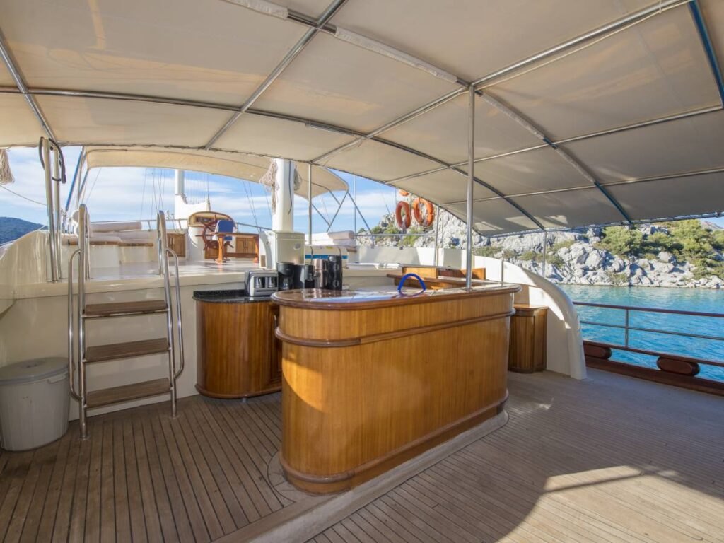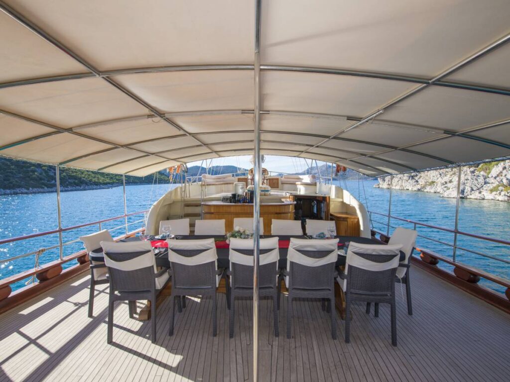 It is a very good choice for a blue voyage with a well-equipped kitchen, elegantly set tables, indoor and outdoor dining areas, comfortable living areas and an experienced crew of 4.