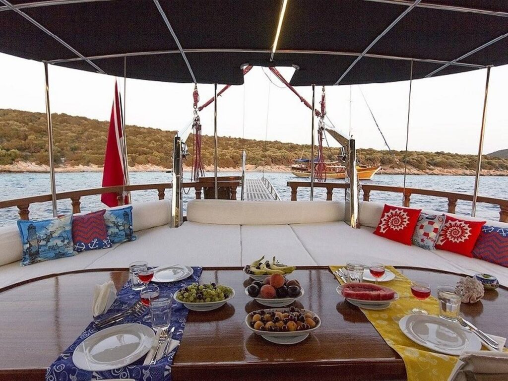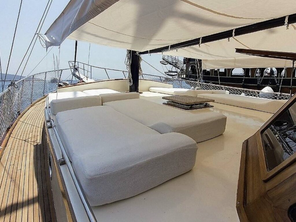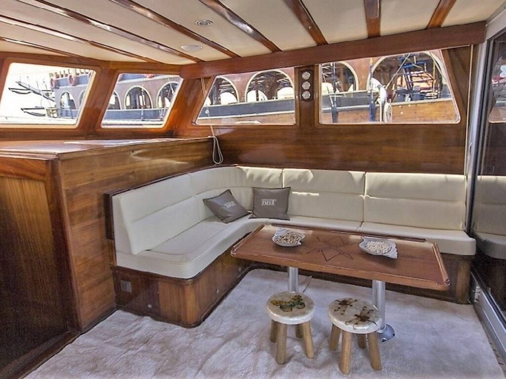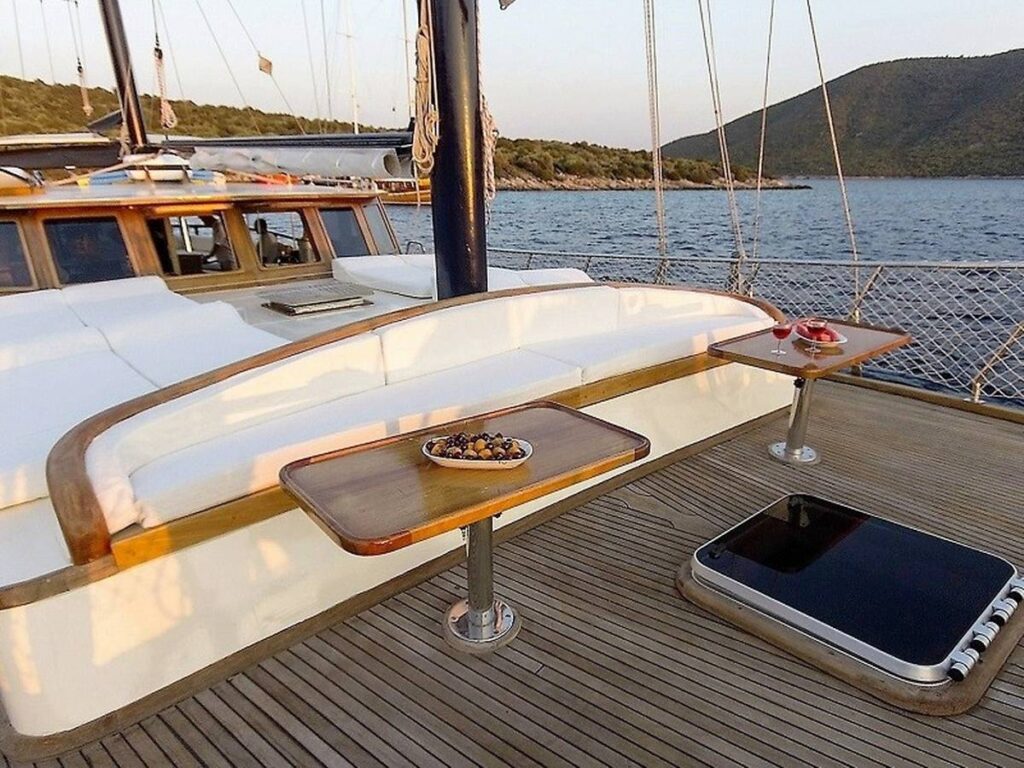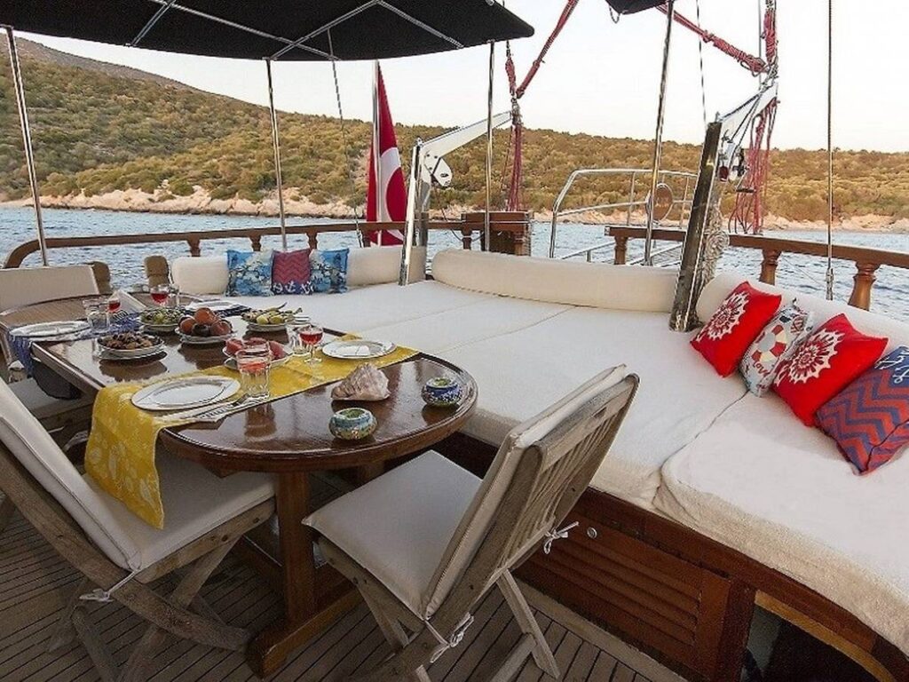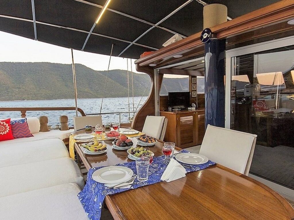 There is a spacious seating area with cushions, a dining table and a dining area at the rear of the boat. There is a separate dining table in the salon and your meals are prepared in a fully equipped separate kitchen. There are also more than enough sun mattresses to laze around and enjoy your private cruise.