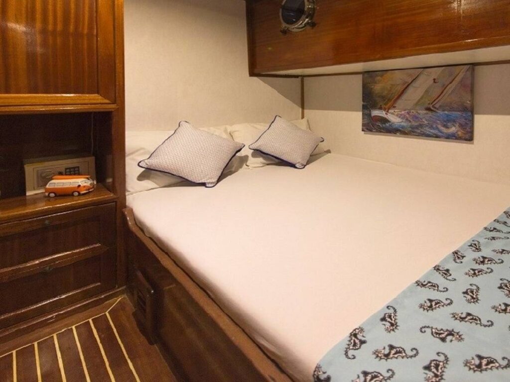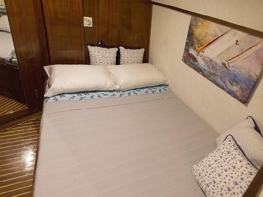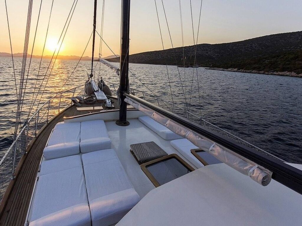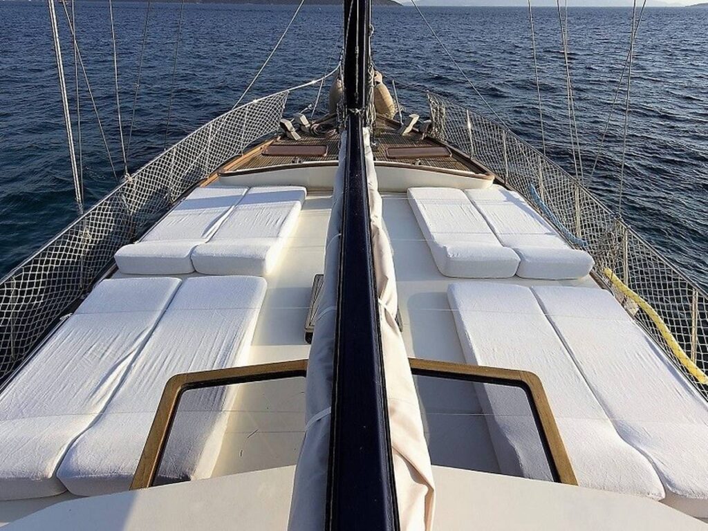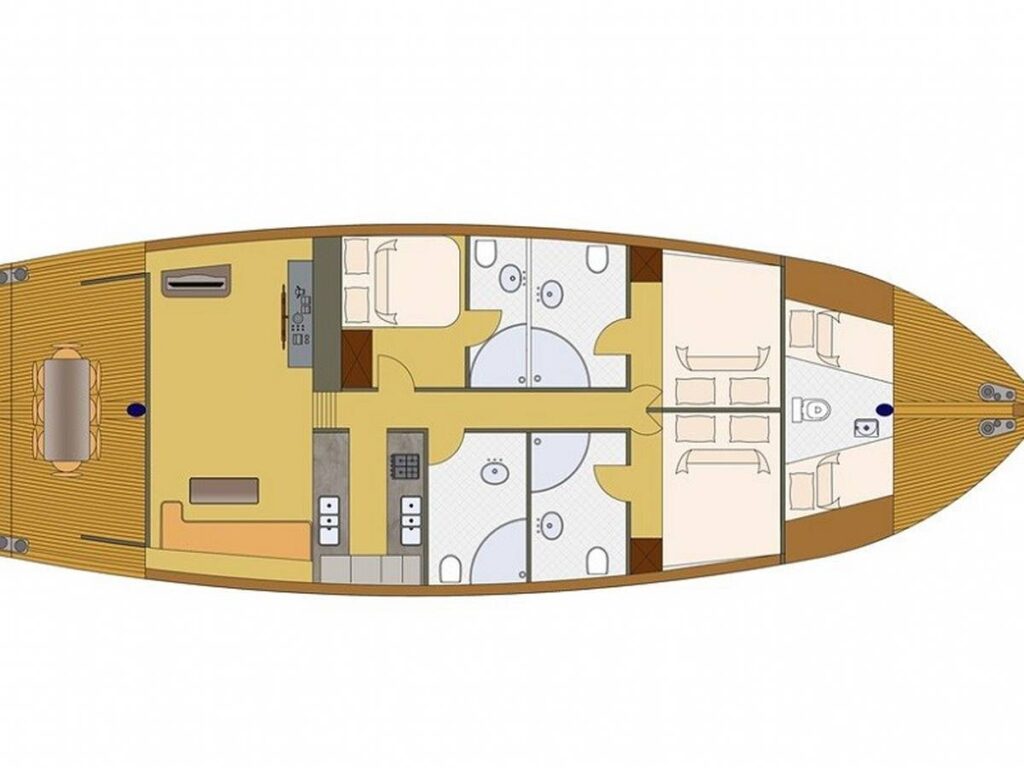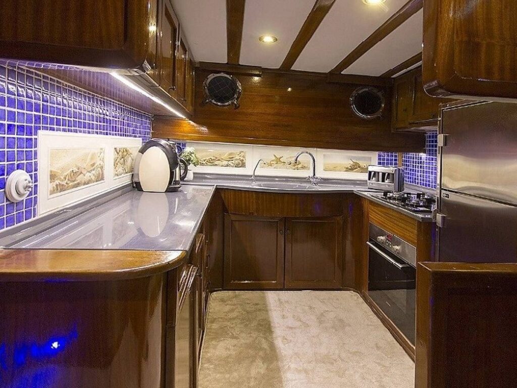 There is a spacious seating area with cushions, a dining table and a dining area at the rear of the boat. There is a separate dining table in the salon and your meals are prepared in a fully equipped separate kitchen. There are also more than enough sun mattresses to laze around and enjoy your private cruise.