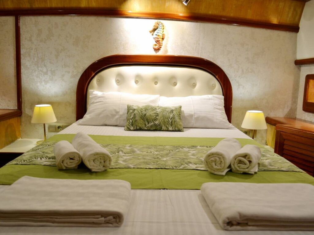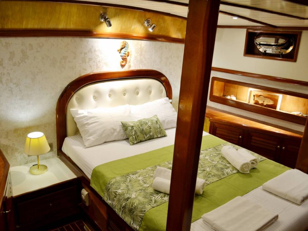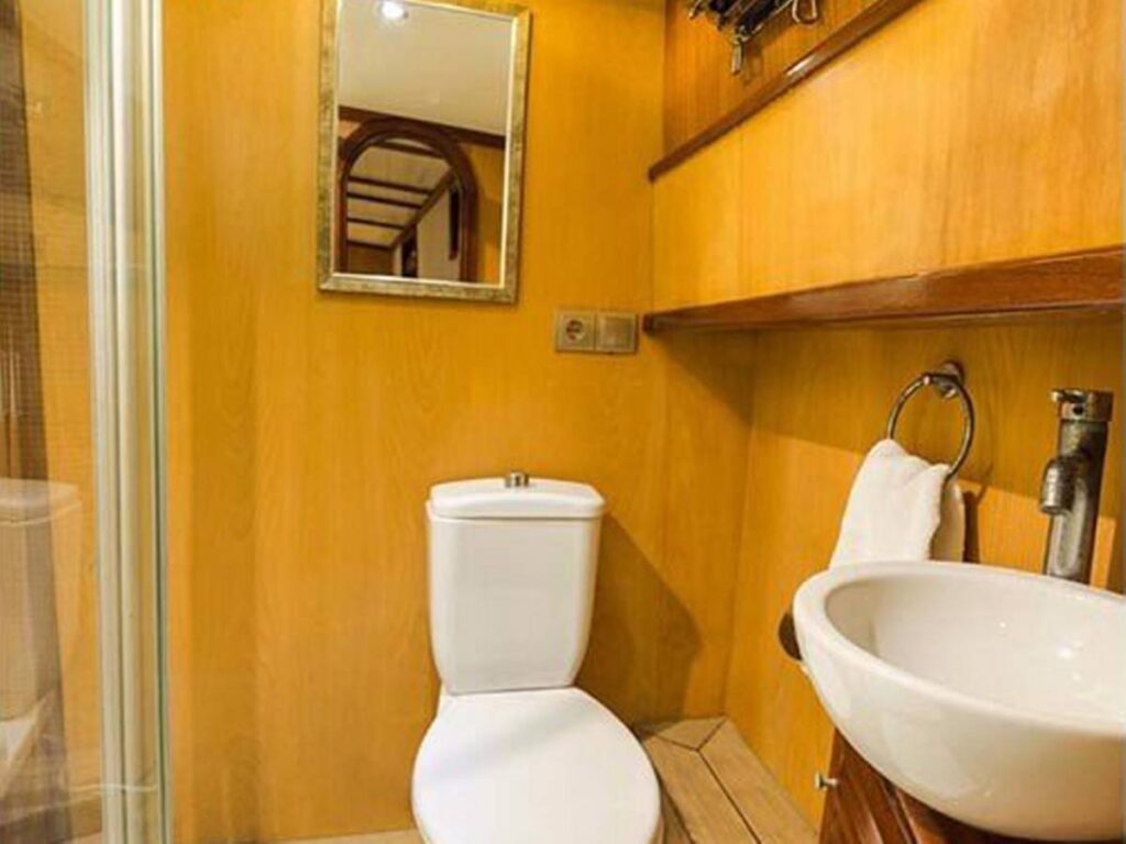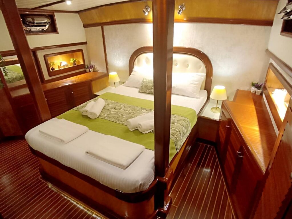 There are 3 cabins on board this romantic yacht and these are very elegant and decorated with care. All cabins have their own shower, toilet and air conditioning.