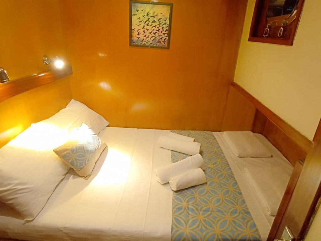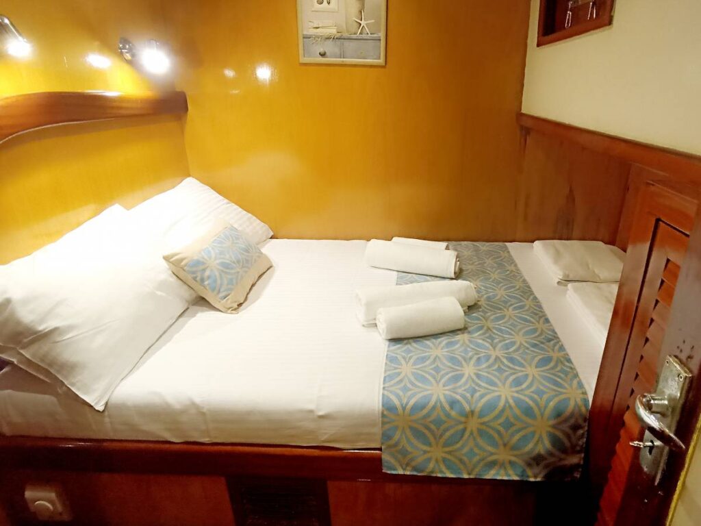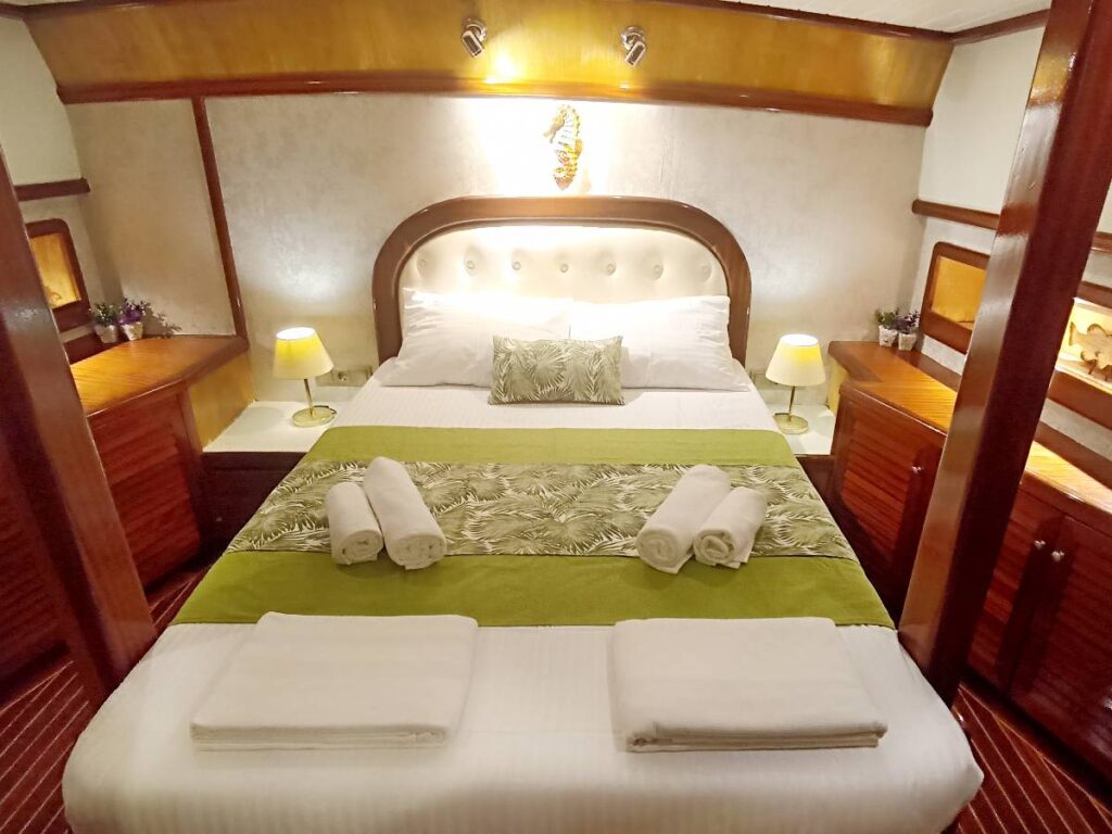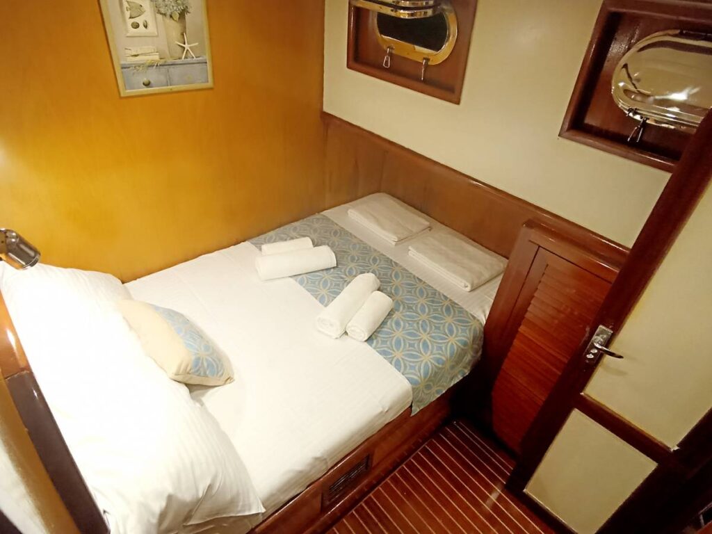 There are 3 cabins on board this romantic yacht and these are very elegant and decorated with care. All cabins have their own shower, toilet and air conditioning.