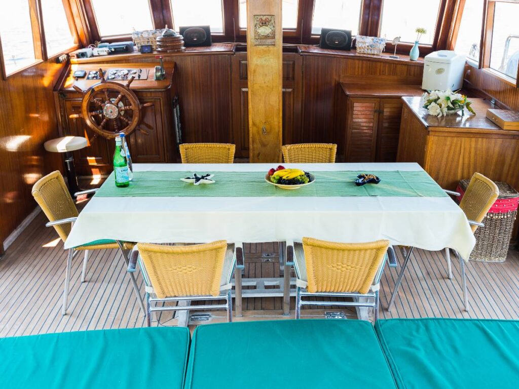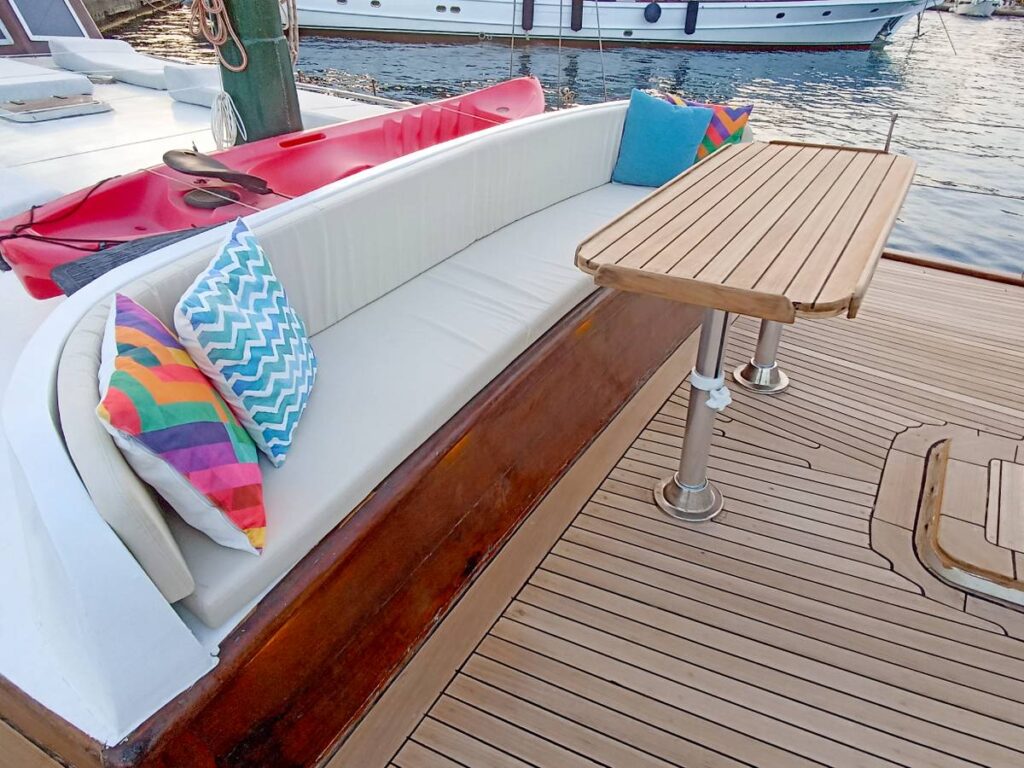 The gulet has plenty of sun mattresses for everyone and there is plenty of space on the decks for lounging. There is a lovely sitting area on the back deck and you can dine al fresco here.