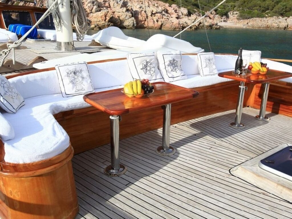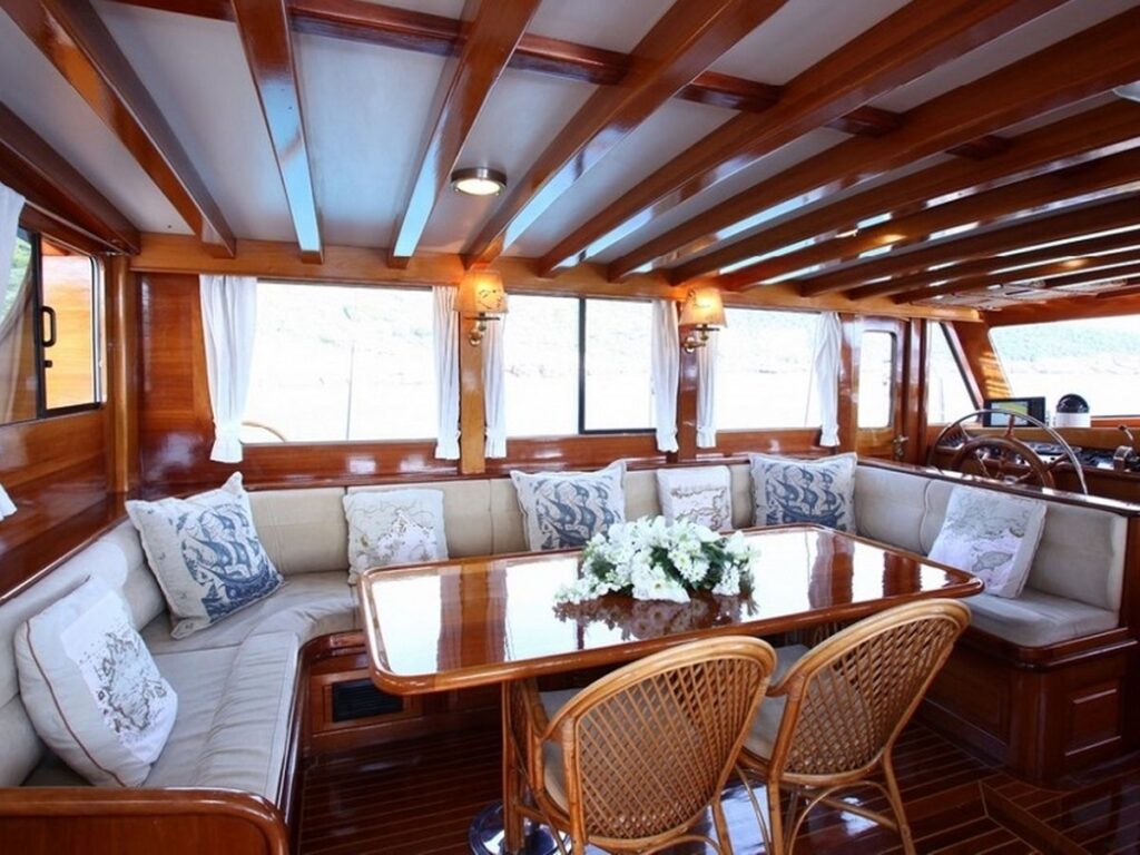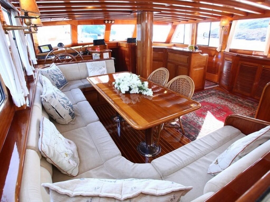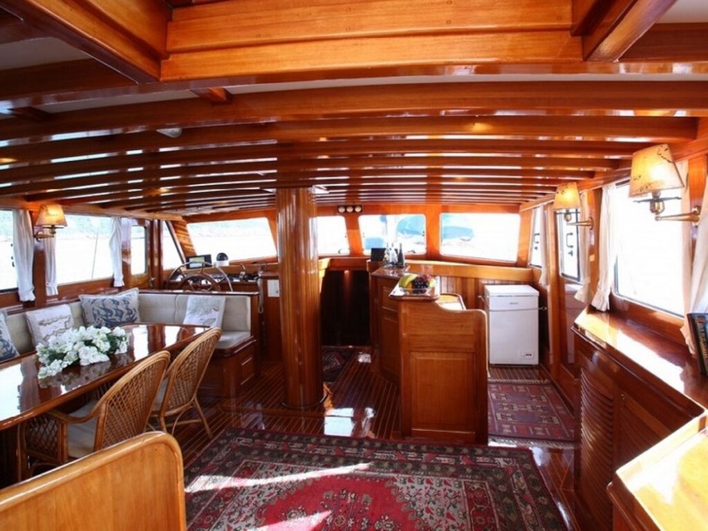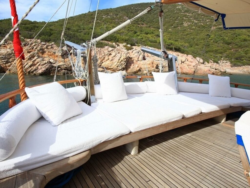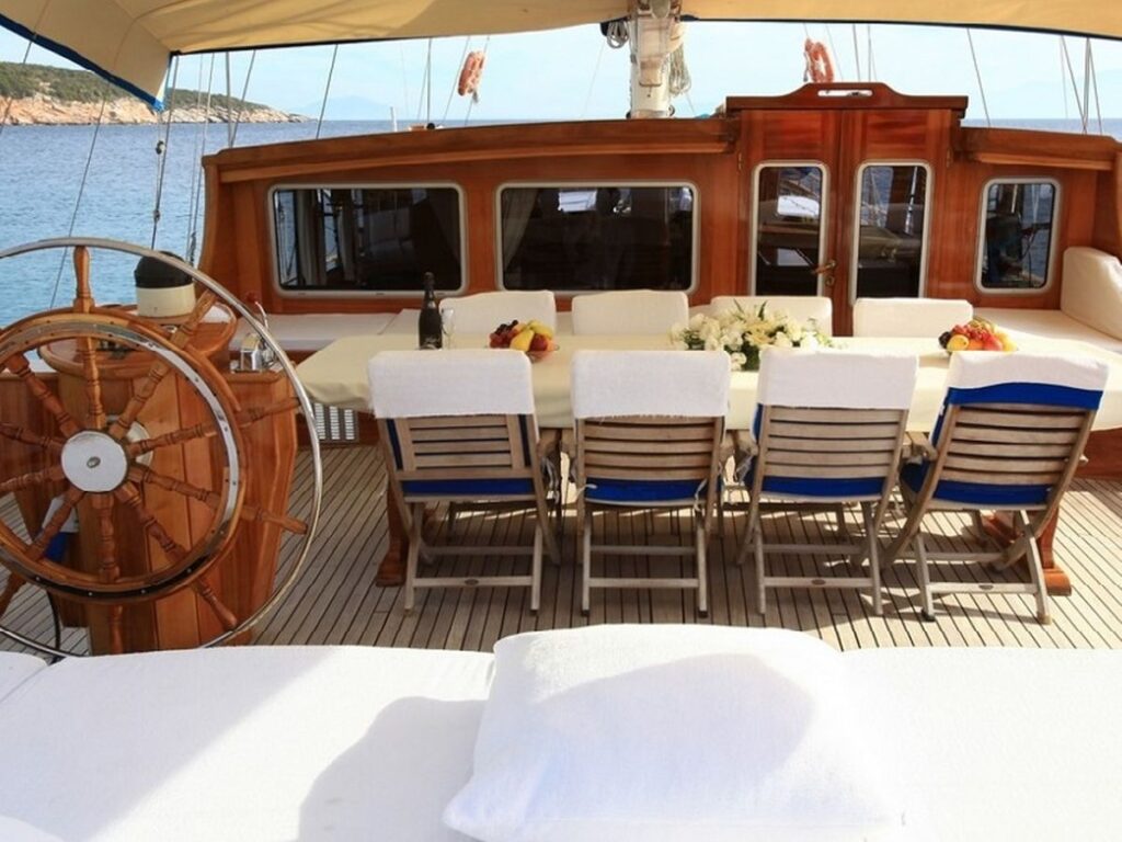 There is a spacious seating area with cushions, a dining table and a dining area at the rear of the boat. There is a separate dining table in the salon and your meals are prepared in a fully equipped separate kitchen. Kaya Guneri 3 Gulet has plenty of lawn mats and space for all guests. There is a TV, DVD and music system in the salon.