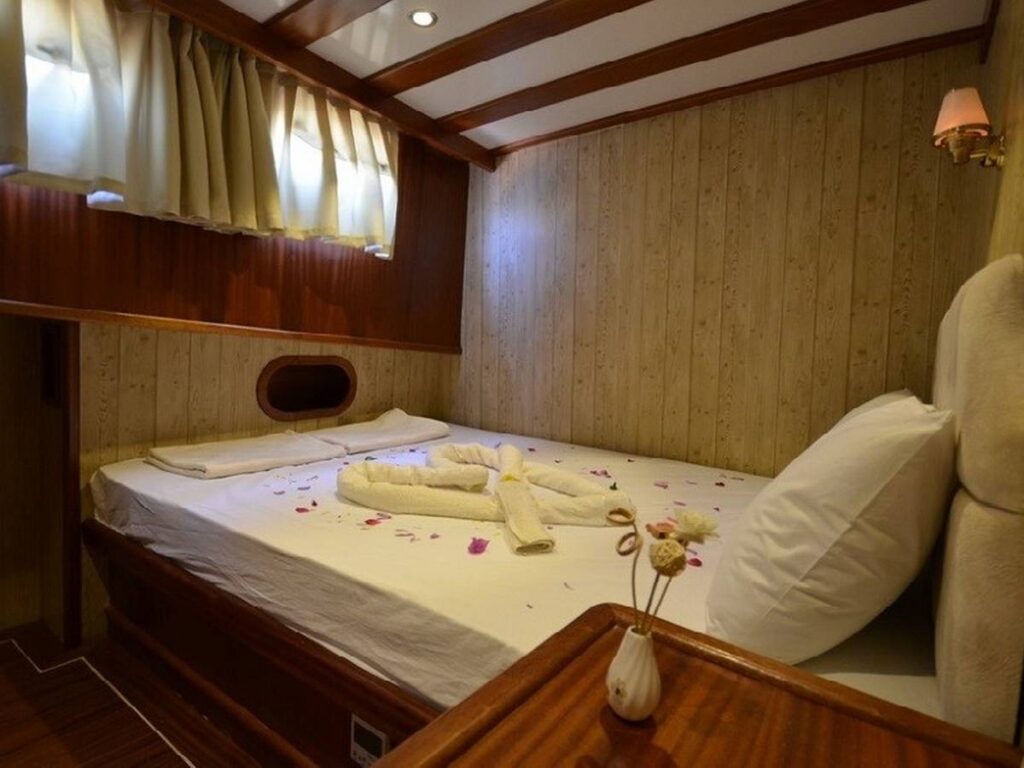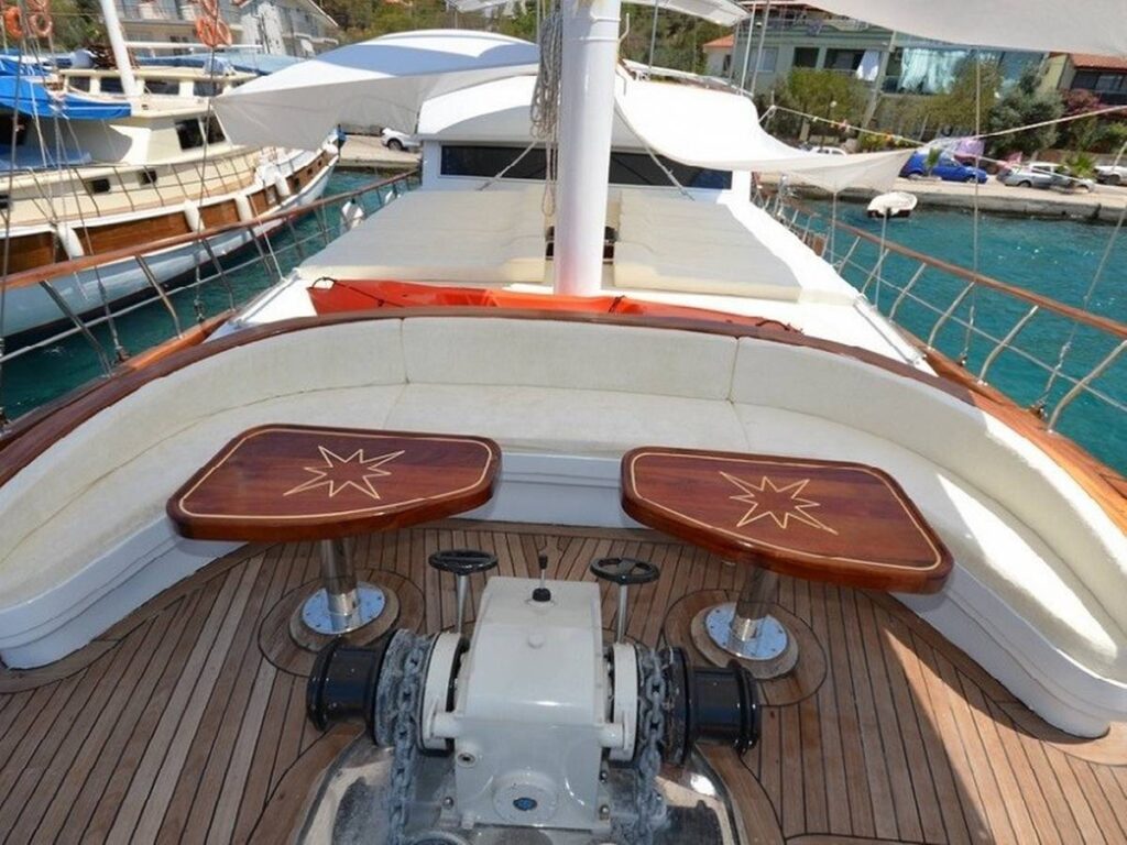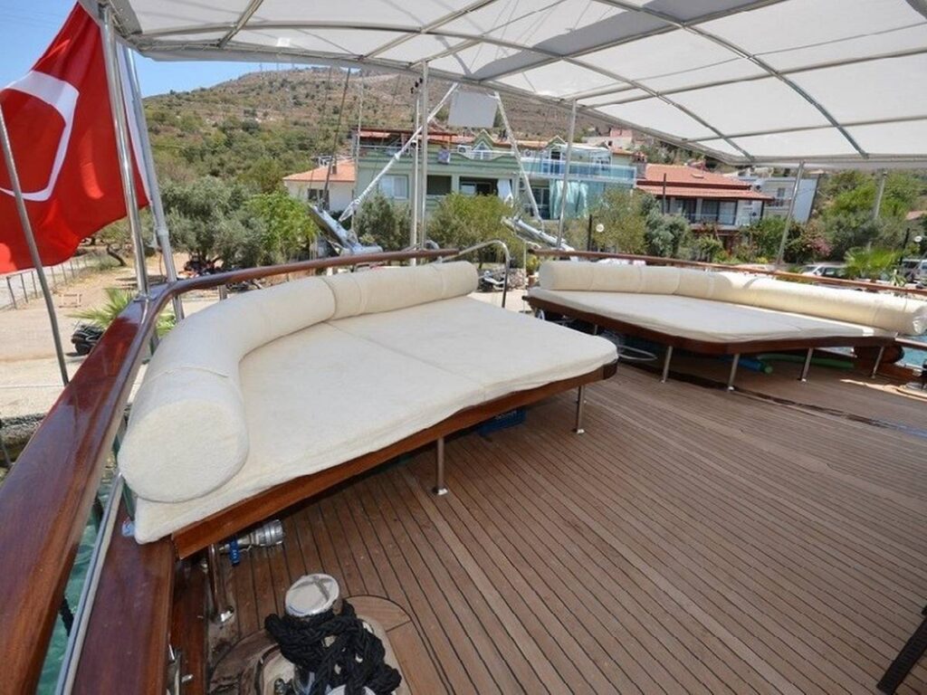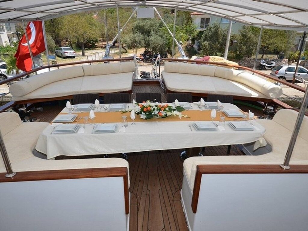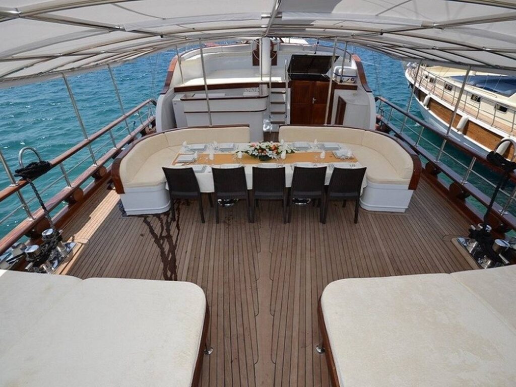 This 28 meter gulet has a capacity of 12 guests with 6 cabins. The gulet has spacious dining and living areas and an upstairs flybridge. All cabins and saloon are air-conditioned. In addition, all cabins have their own shower and toilet.