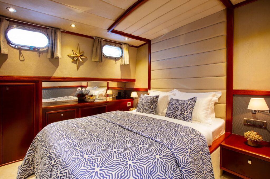 Perdue is a high-quality, elegant gulet of 23 meters long and built in 2017. There are 3 very modern and spacious cabins, all with their own shower, toilet and air conditioning. The master cabin even has its own jacuzzi. This modern gulet can accommodate up to 6 guests and you will not miss anything on board this yacht.