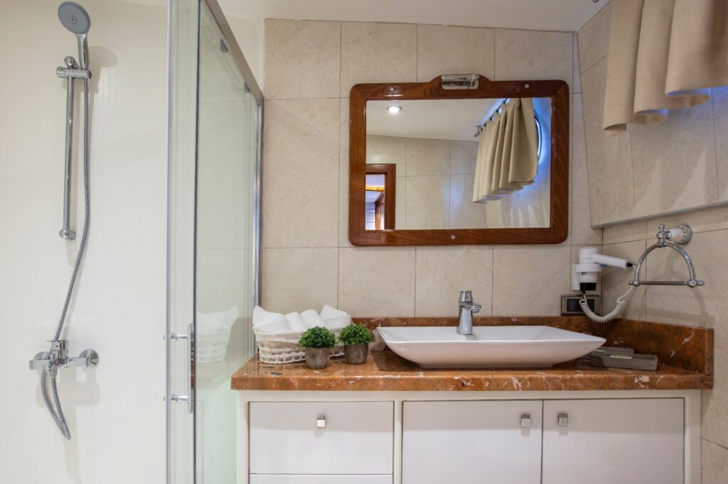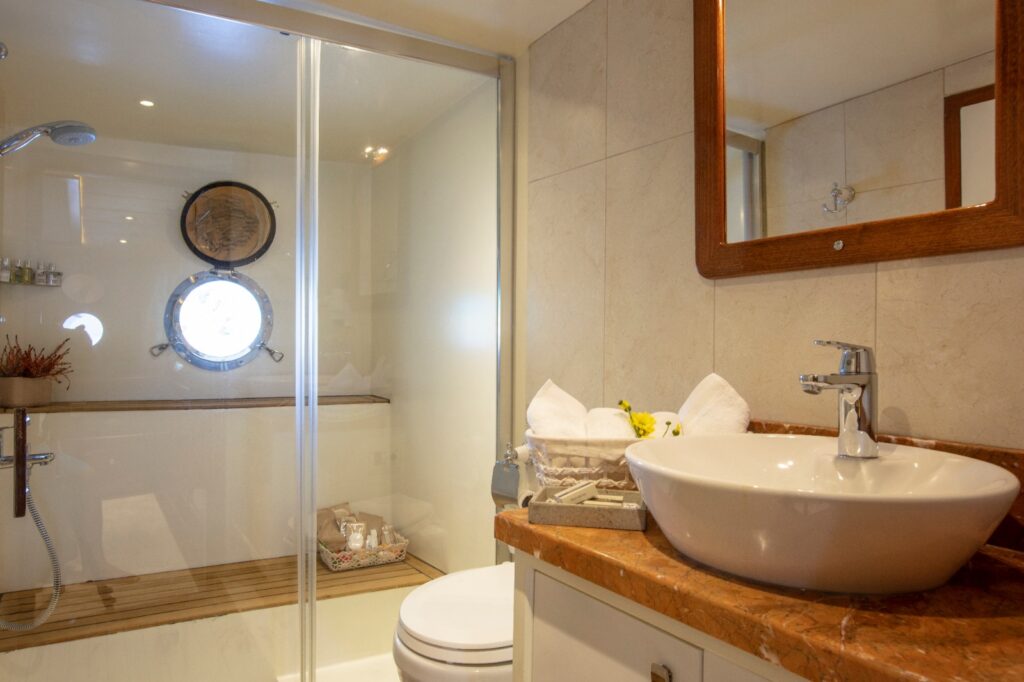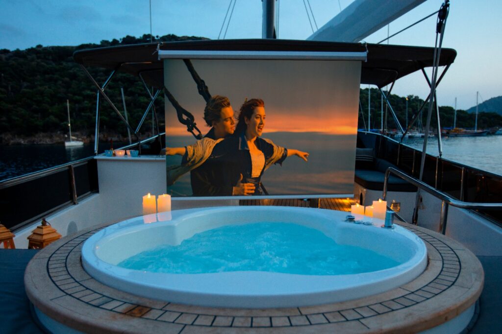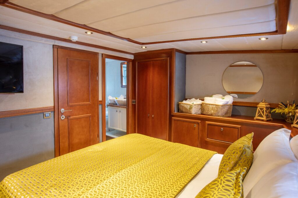There is a fully equipped kitchen, an indoor and outdoor dining area, and an air-conditioned lounge. There is a TV, DVD and music system in the salon. There is also a large sun terrace with plenty of sun loungers for everyone. The jacuzzi on board Perdue gulet offers a very pleasant atmosphere and for a group of 6 people this is a perfect choice. It goes without saying that the 4-person crew is more than professional.