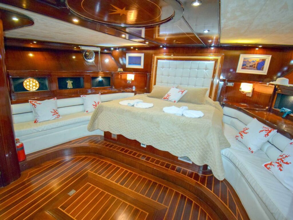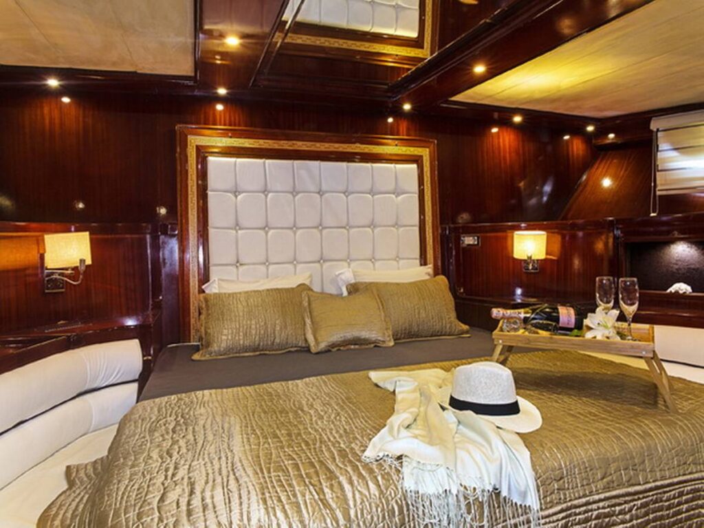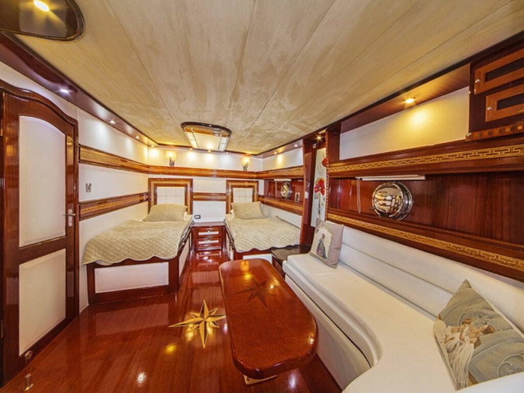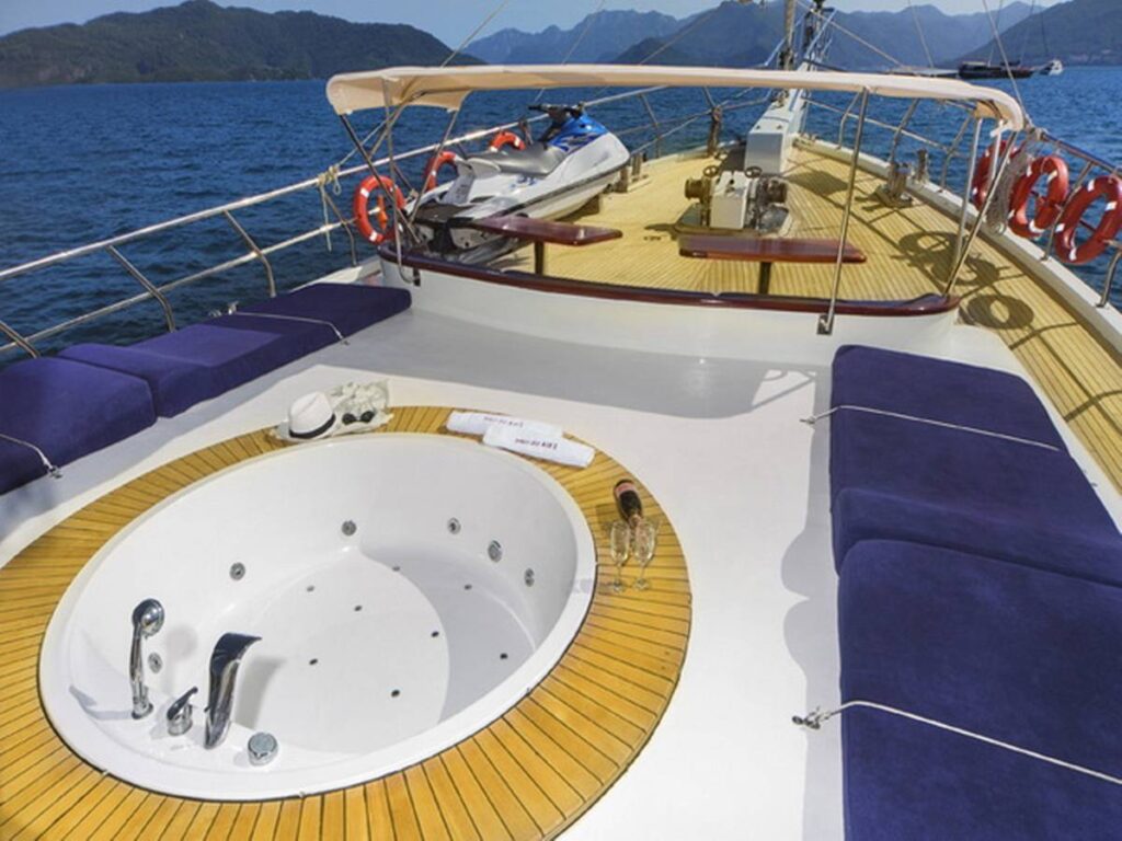 The super luxury yacht is 36 meters long with 2 Master, 2 Double, 2 Twin Cabins, a total accommodation capacity of 12 guests. Each cabin is well-equipped with its own shower and toilet facilities and air conditioning for a comfortable stay on hot summer days. All cabins have TV, DVD and music system. There is also a jacuzzi in the master cabin.