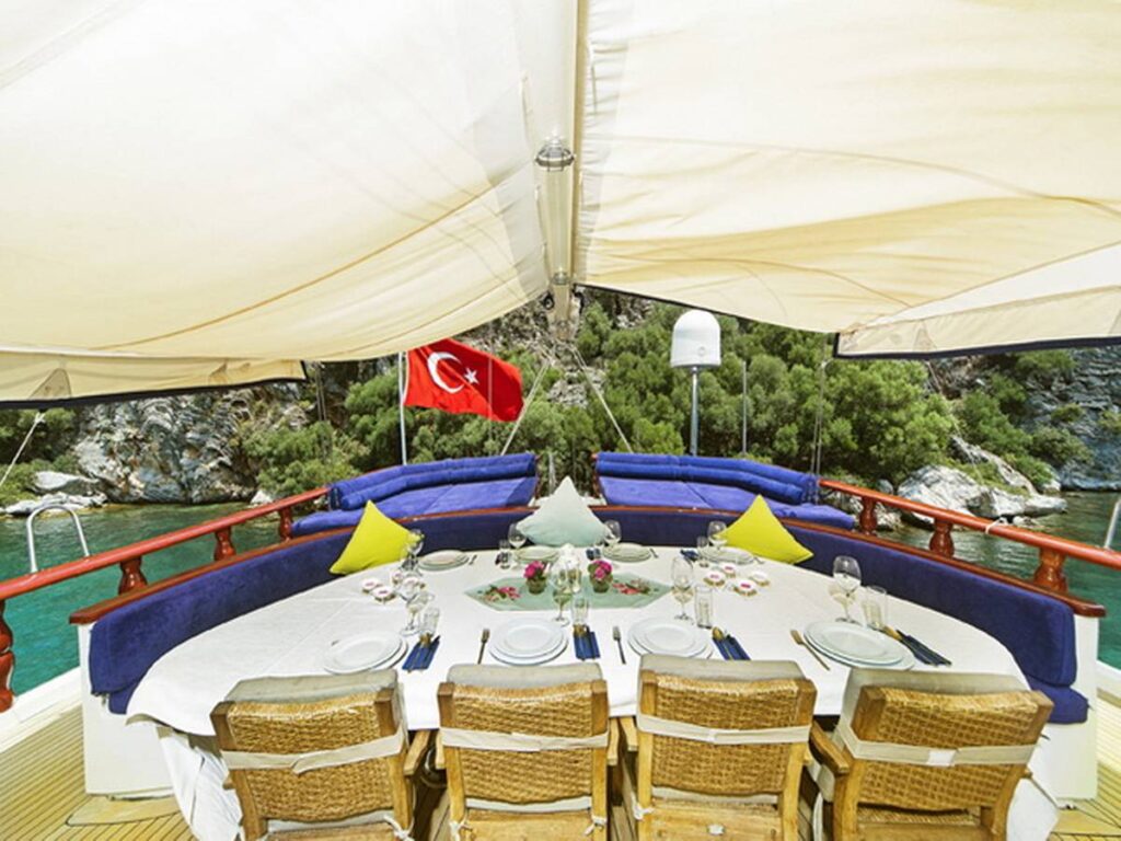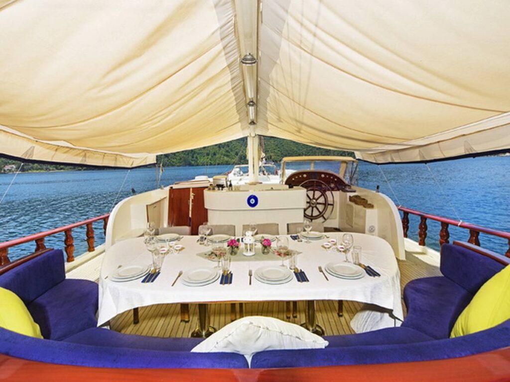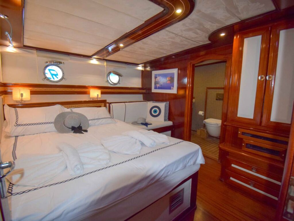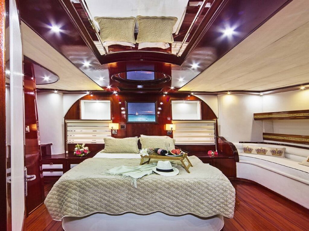 The super luxury yacht is 36 meters long with 2 Master, 2 Double, 2 Twin Cabins, a total accommodation capacity of 12 guests. Each cabin is well-equipped with its own shower and toilet facilities and air conditioning for a comfortable stay on hot summer days. All cabins have TV, DVD and music system. There is also a jacuzzi in the master cabin.