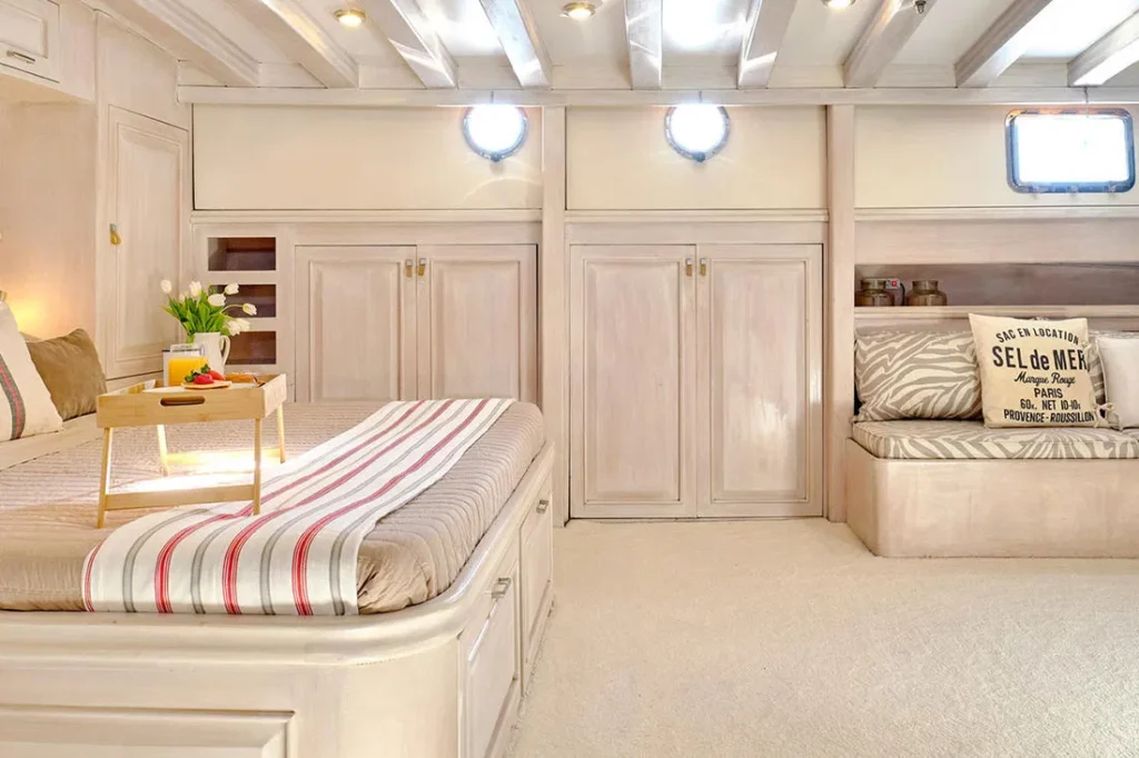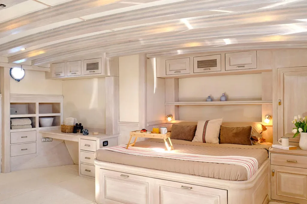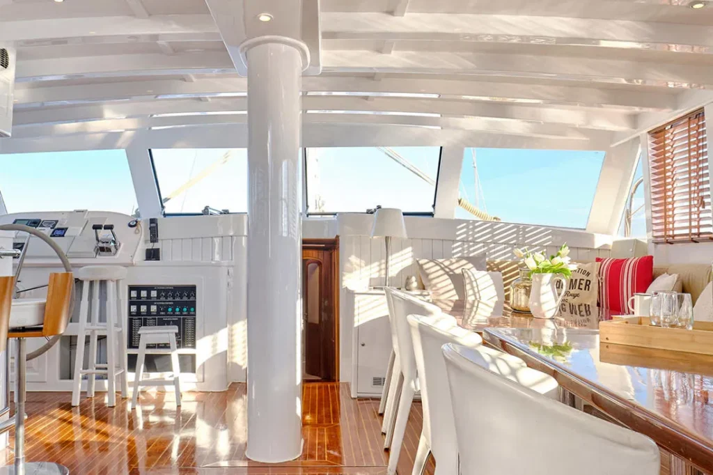 As evening falls, the bright and contemporary saloon—with its generous bar—becomes the ideal space for socializing, conversation, and late-night cocktails. When it is time to retreat, guests can relax in six exquisite cabins, including one Master cabin with a king-size bed, and 5 doubles, all designed for comfort and privacy.