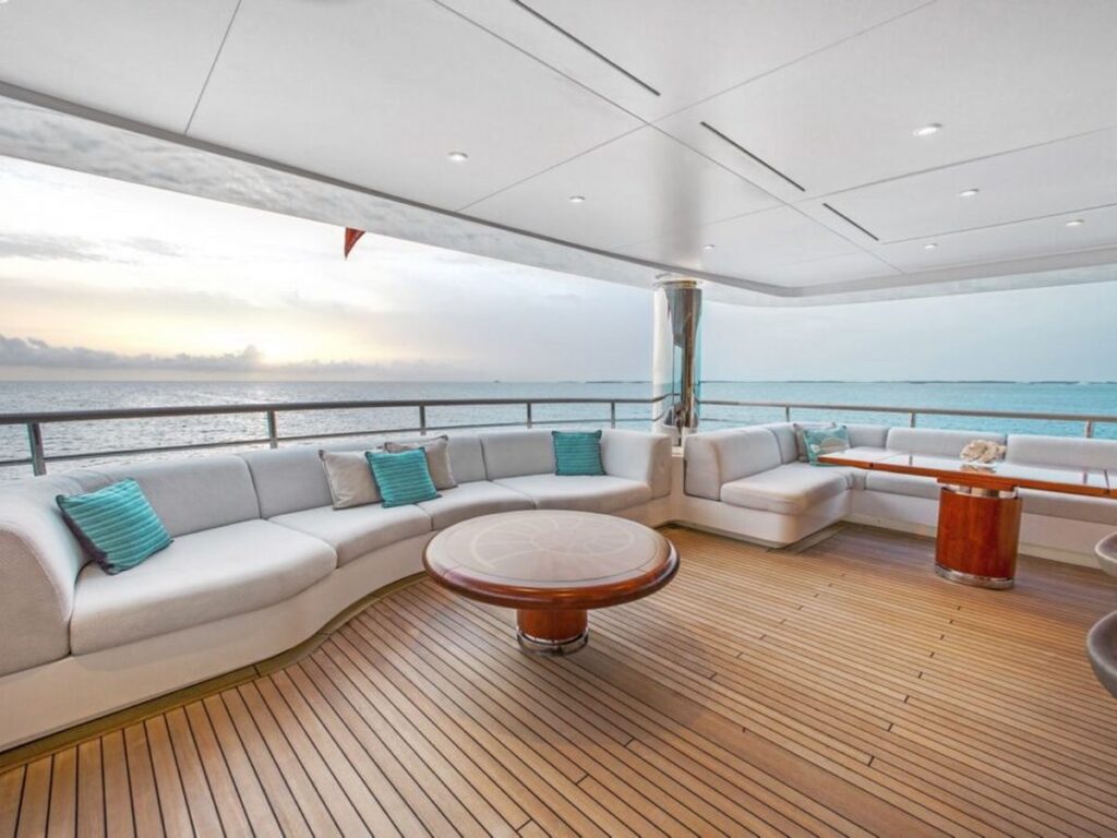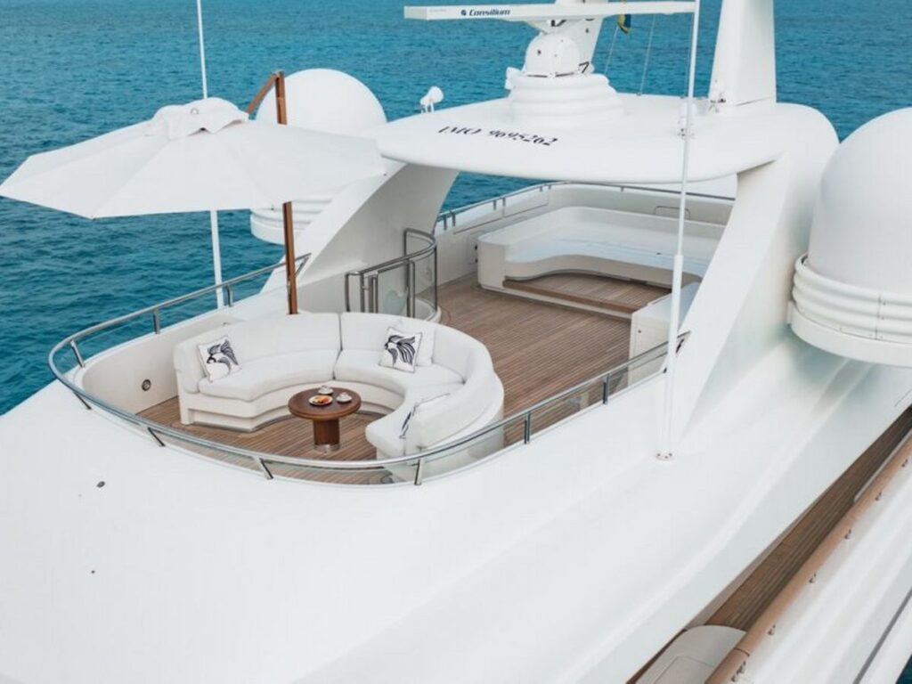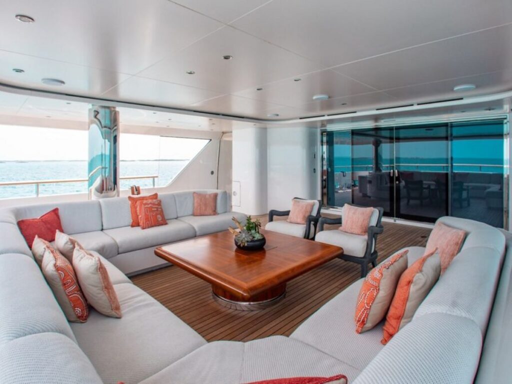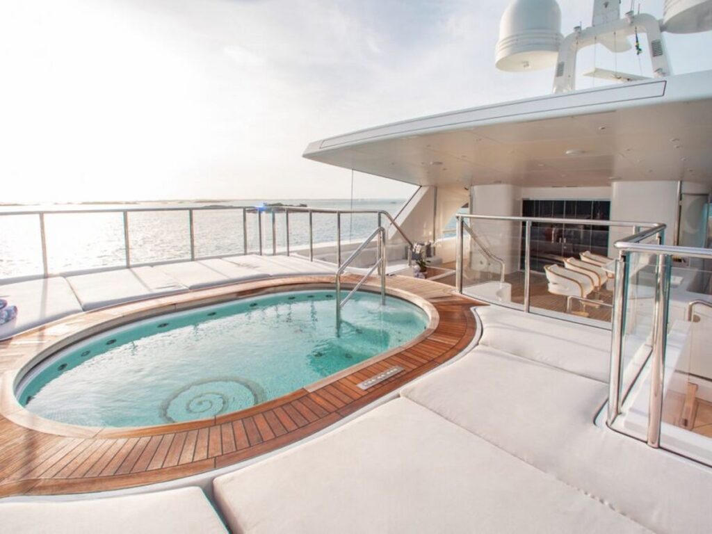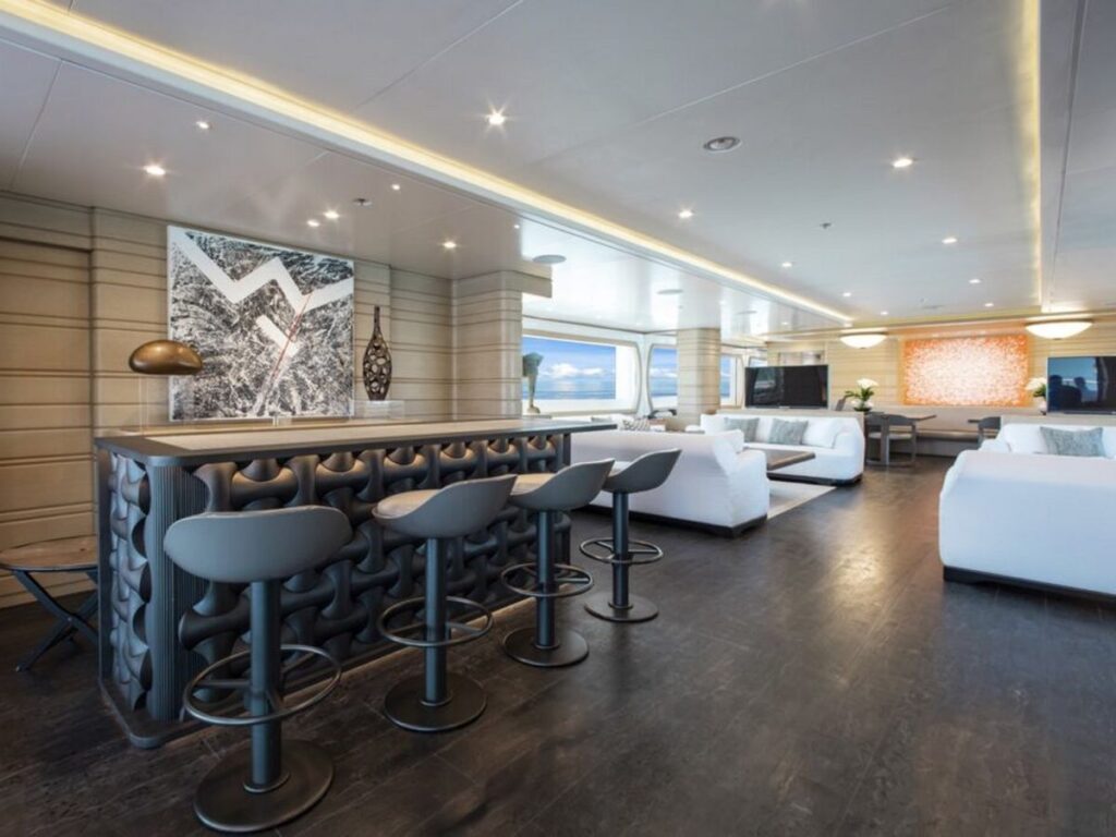 Her highlights include a fantastic bridge deck complete with bar and dining area, a Jacuzzi on the sun deck and her striking elevator serving the lower, main, bridge and sun decks.