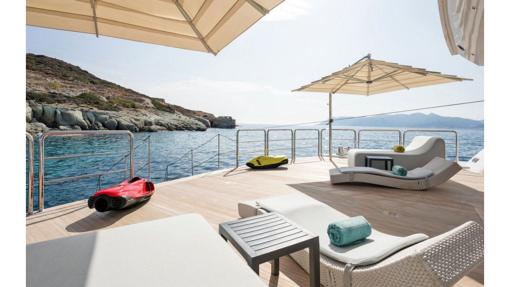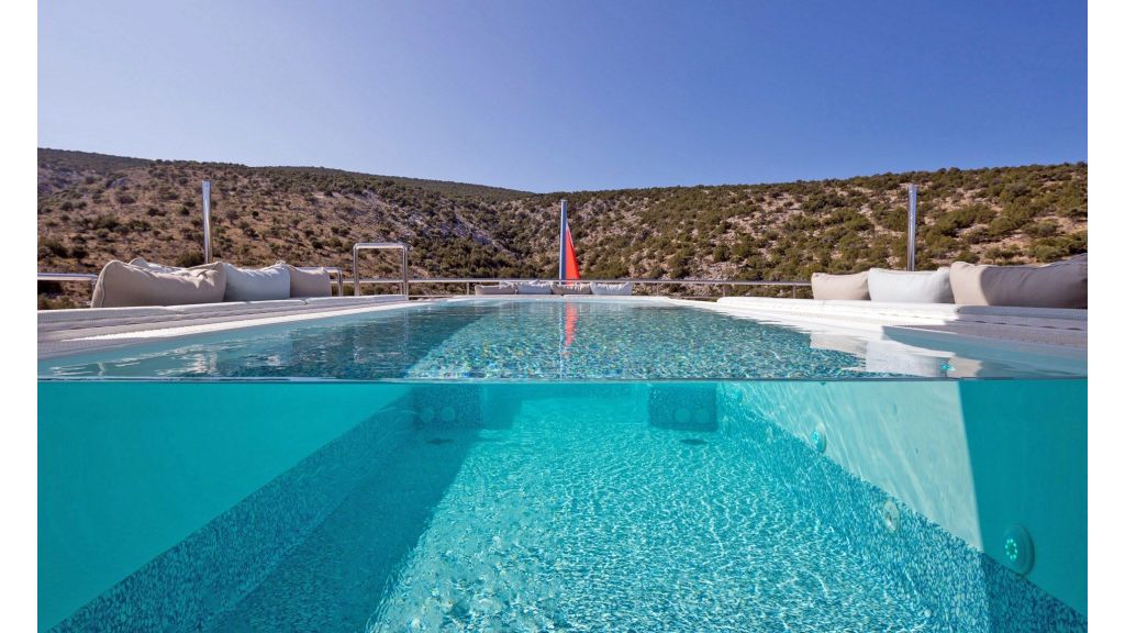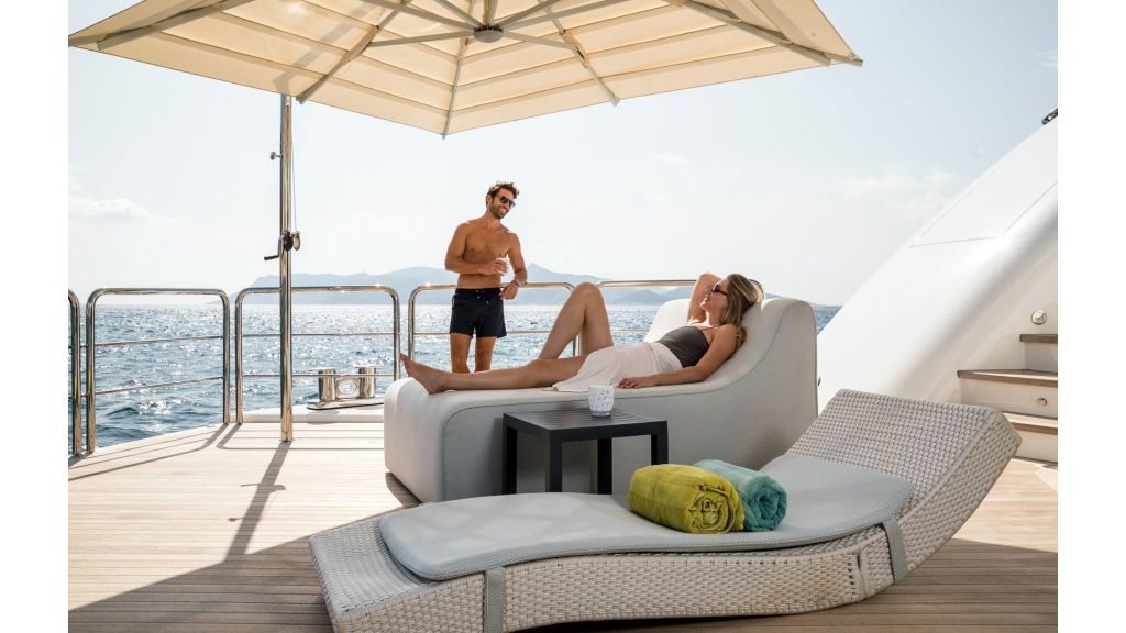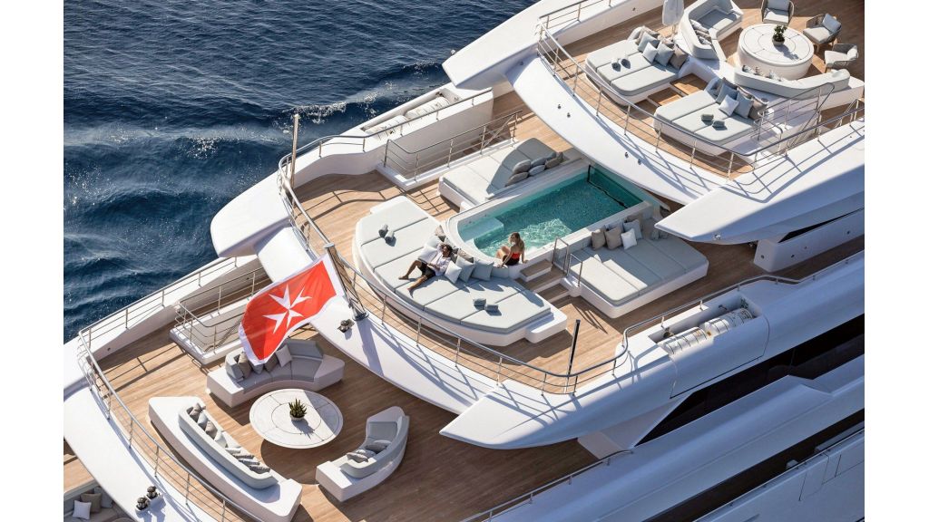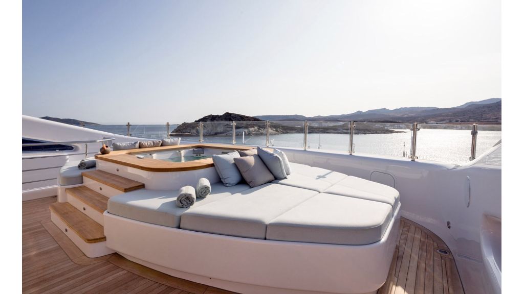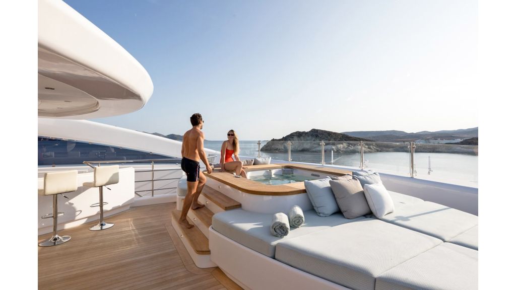 The sundeck offers a unique space for meeting and relaxing moments with a cozy special cinema projector in the open bar. On Bridge Deck there is a generous Jacuzzi pool with a handmade mosaic bed.