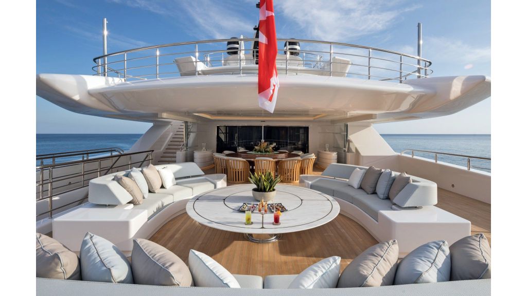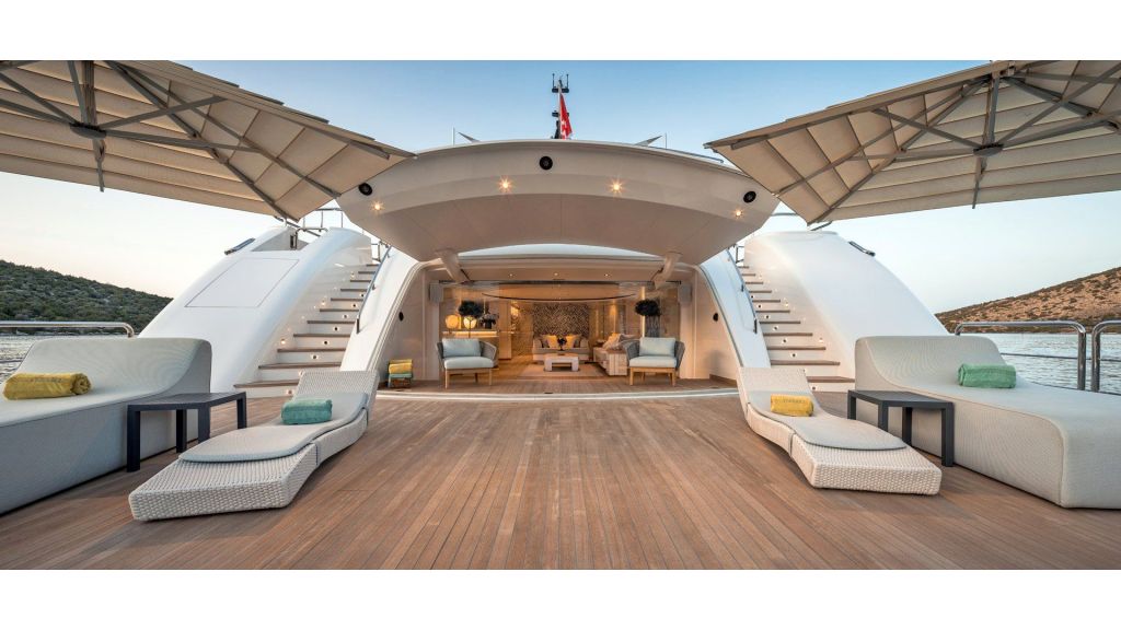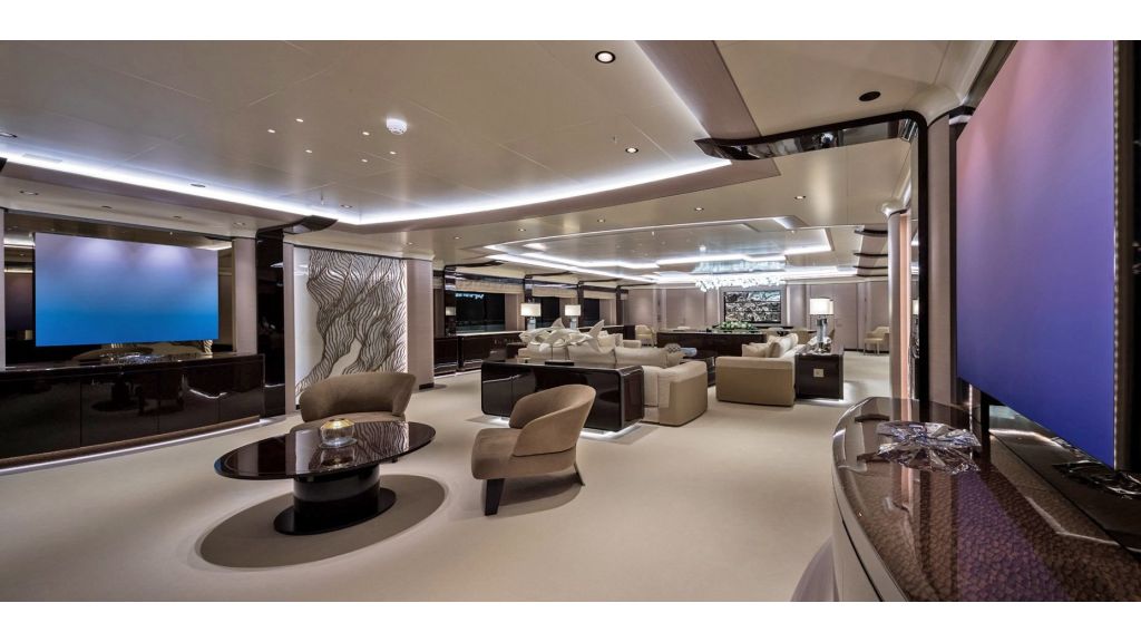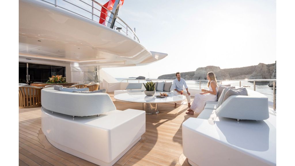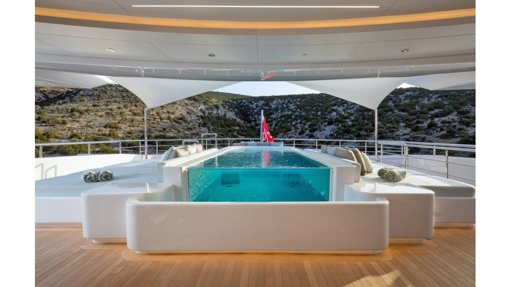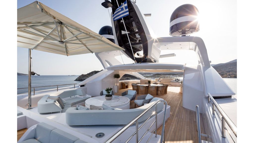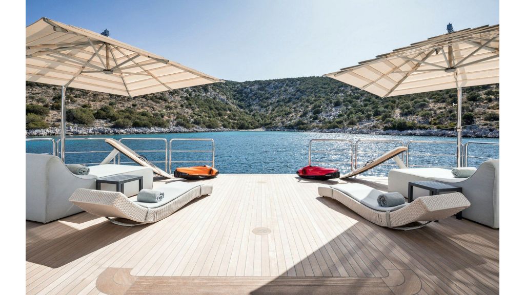 The sundeck offers a unique space for meeting and relaxing moments with a cozy special cinema projector in the open bar. On Bridge Deck there is a generous Jacuzzi pool with a handmade mosaic bed.