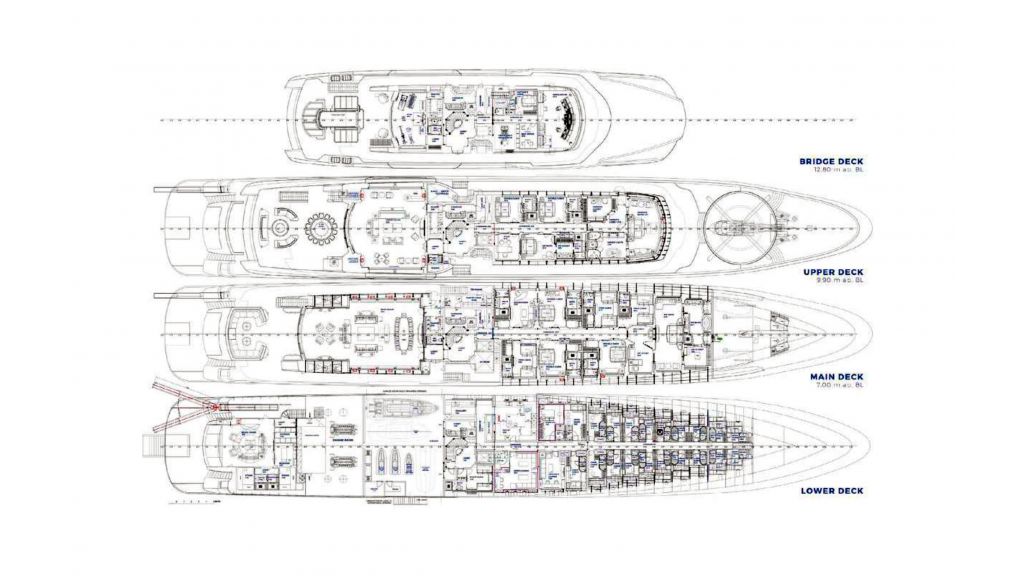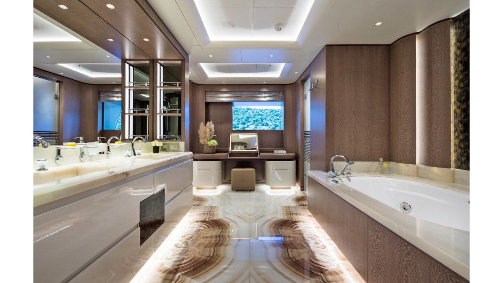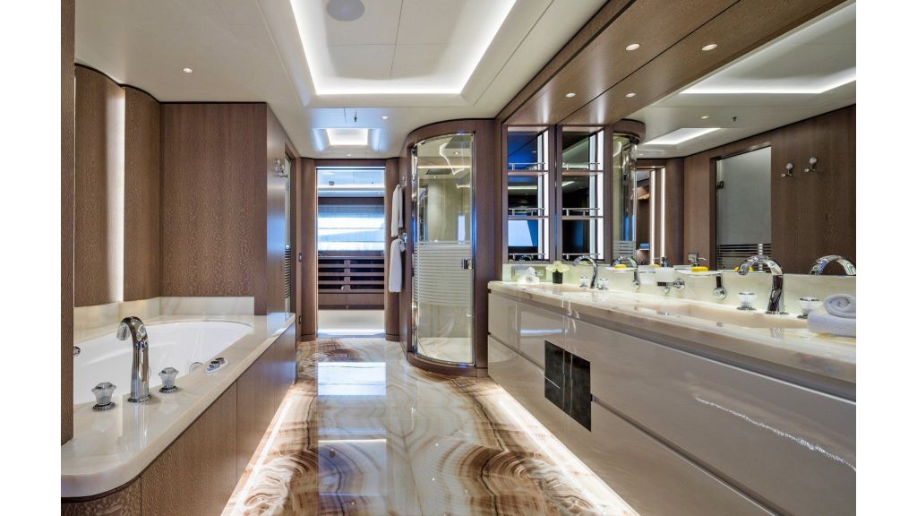 She is dedicated to a maximum of 12 guests in her 13 custom staterooms. The owner’s suite is located on the upper deck with completely different decorative schemes. The suite gives a feeling of panoramic sea view, with the king size bed, a walking closet and a luxurious jacuzzi. Furthermore, there is a full width VIP suite on the main deck with a king size bed and his and hers dressing room and marble bath with mosaic details.