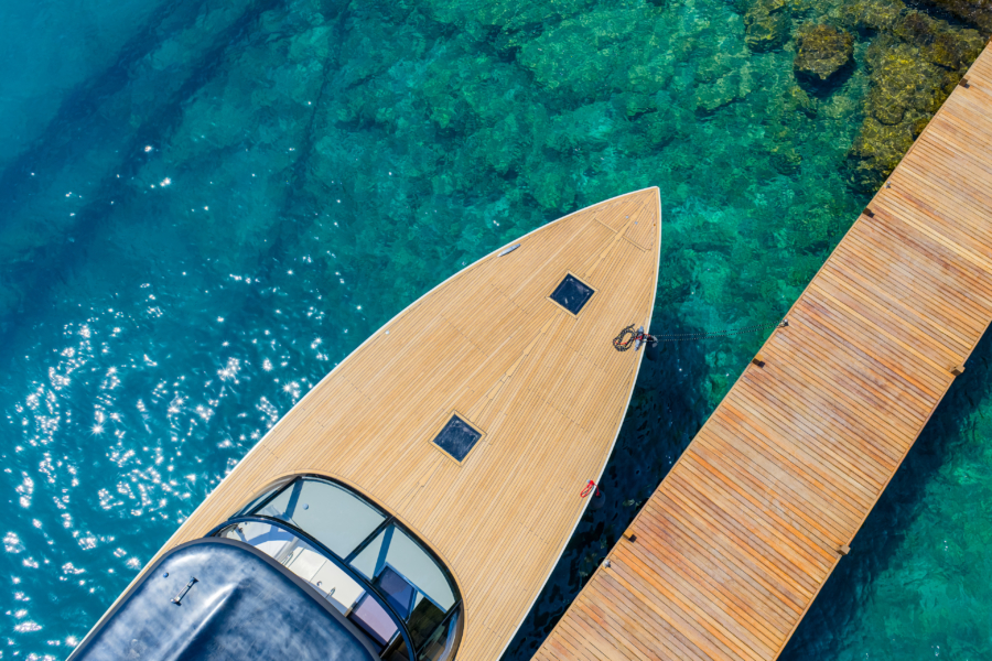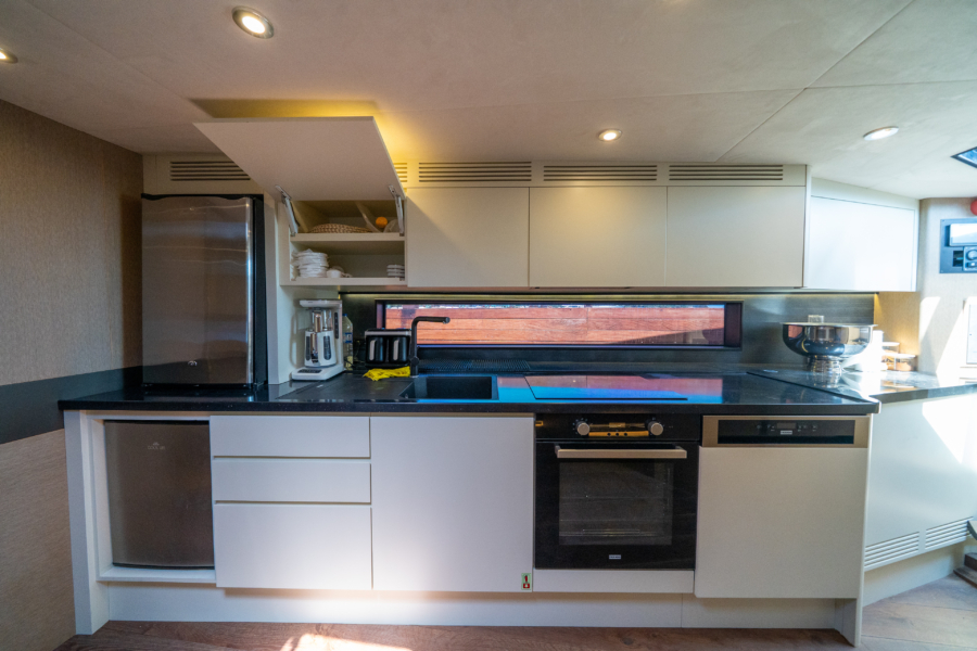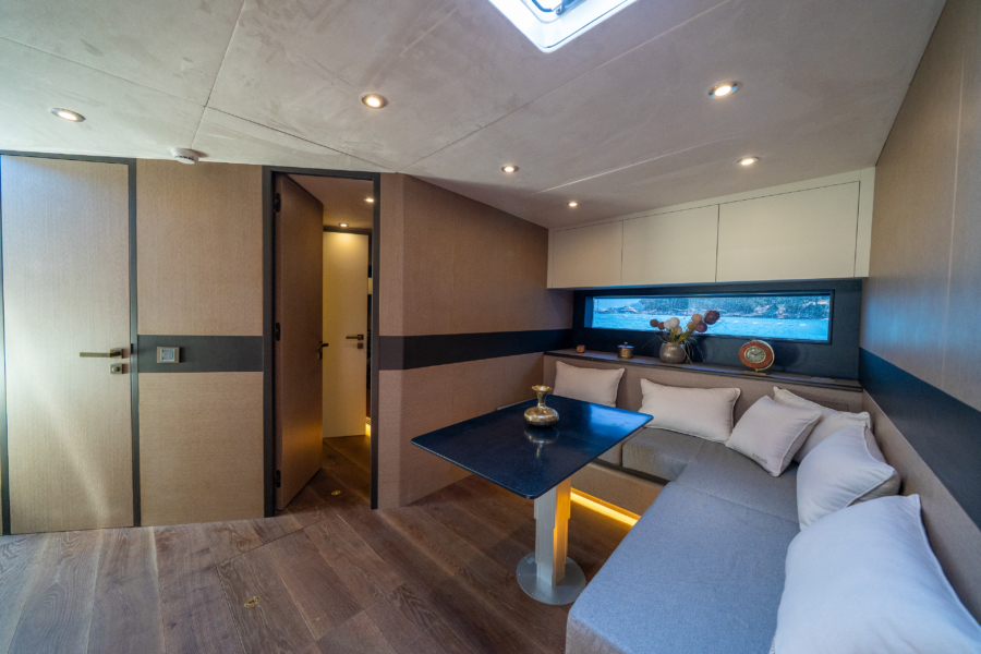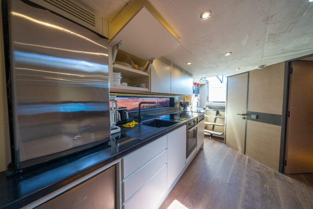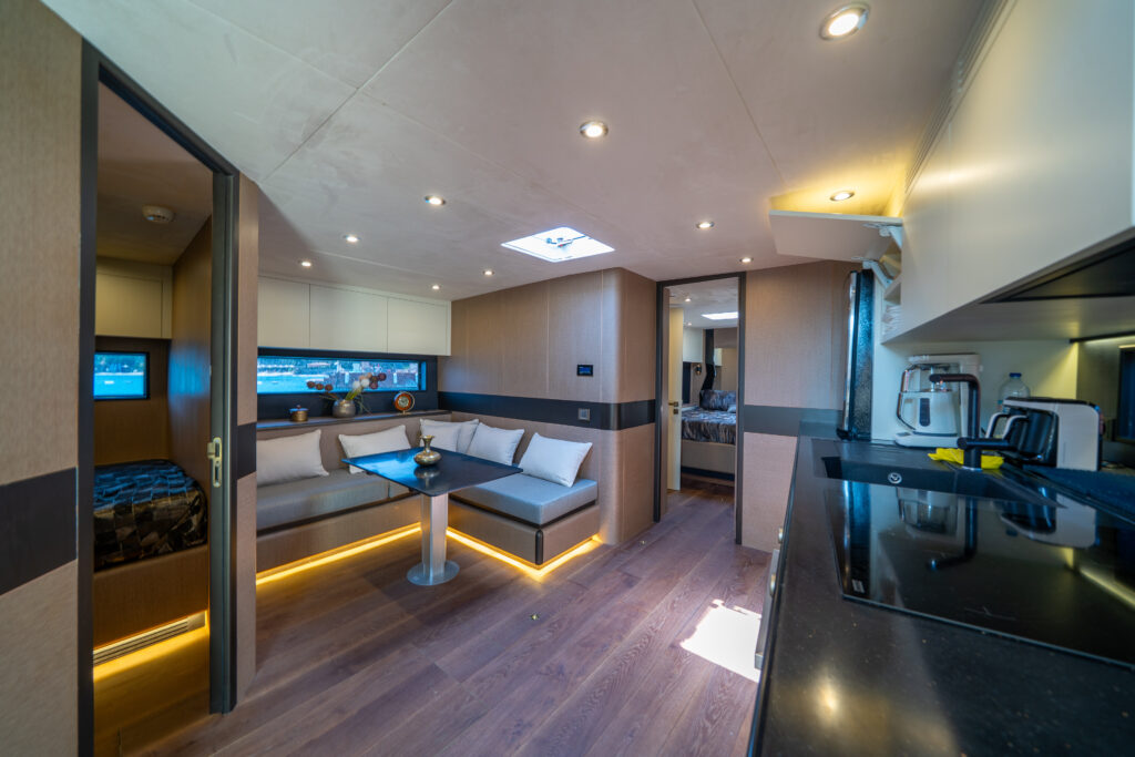 Inside, two en-suite guest cabins, a modern galley, and a spacious saloon create a refined living space, while the Burmese teak deck adds timeless elegance and durability.