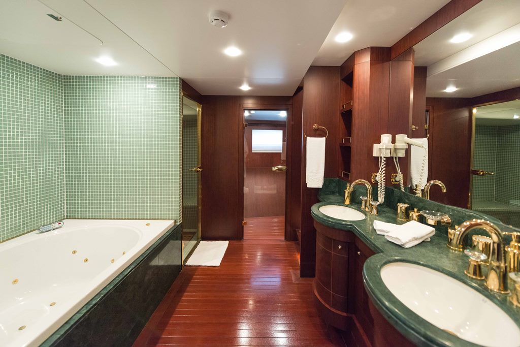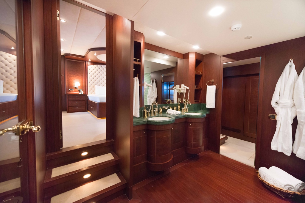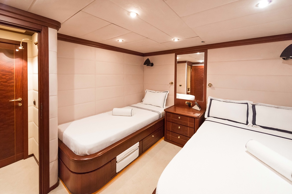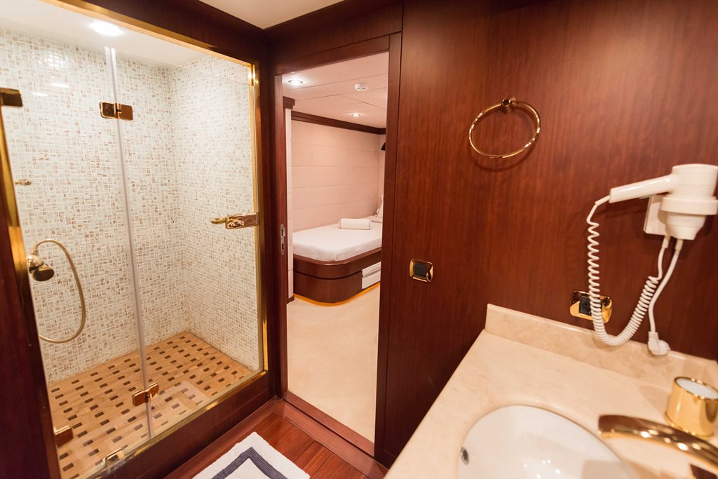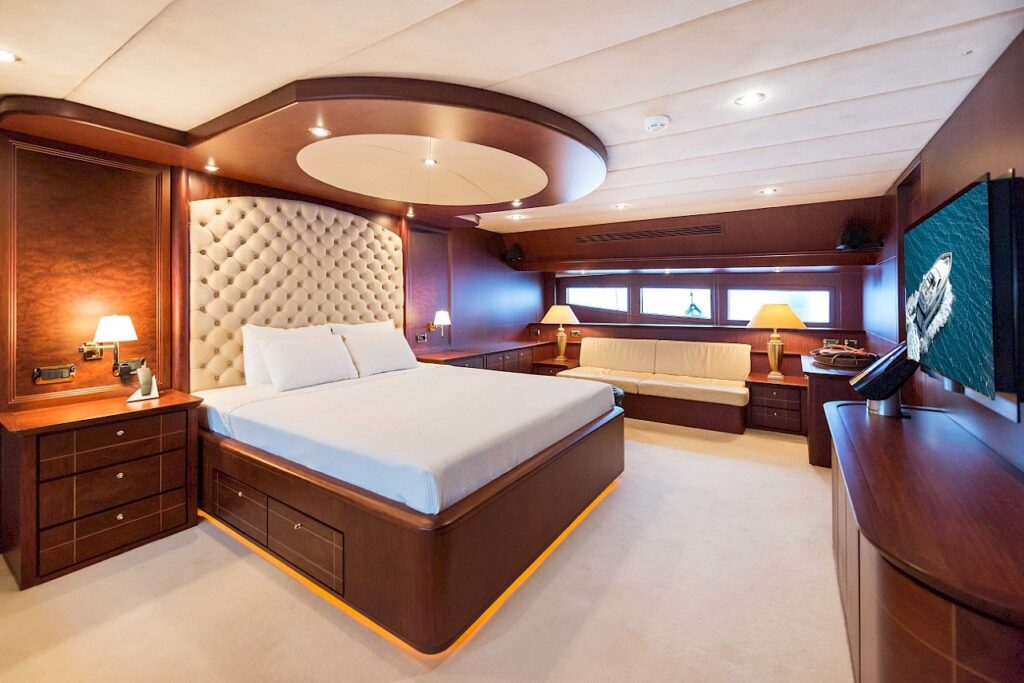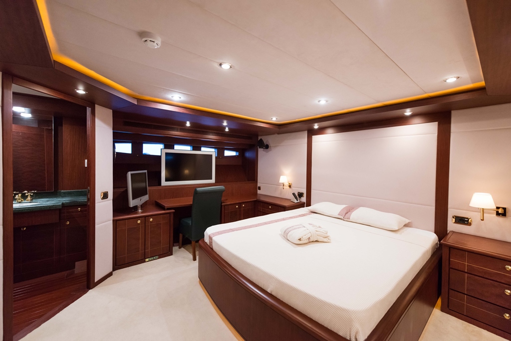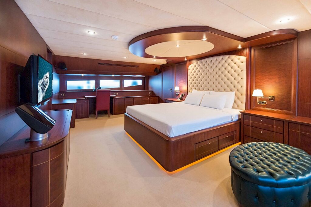 Motor yacht TURKUAZ has 4 comfortable and spacious guest cabins – 1 master, 1 VIP, and 2 twins. A full beam master cabin is located on the main deck with a walk-in wardrobe and spacious bathroom. The main deck of TURKUAZ also features a study room.