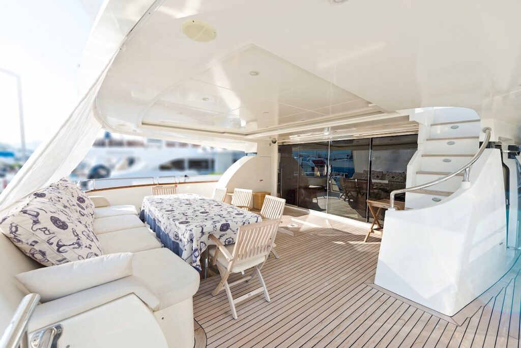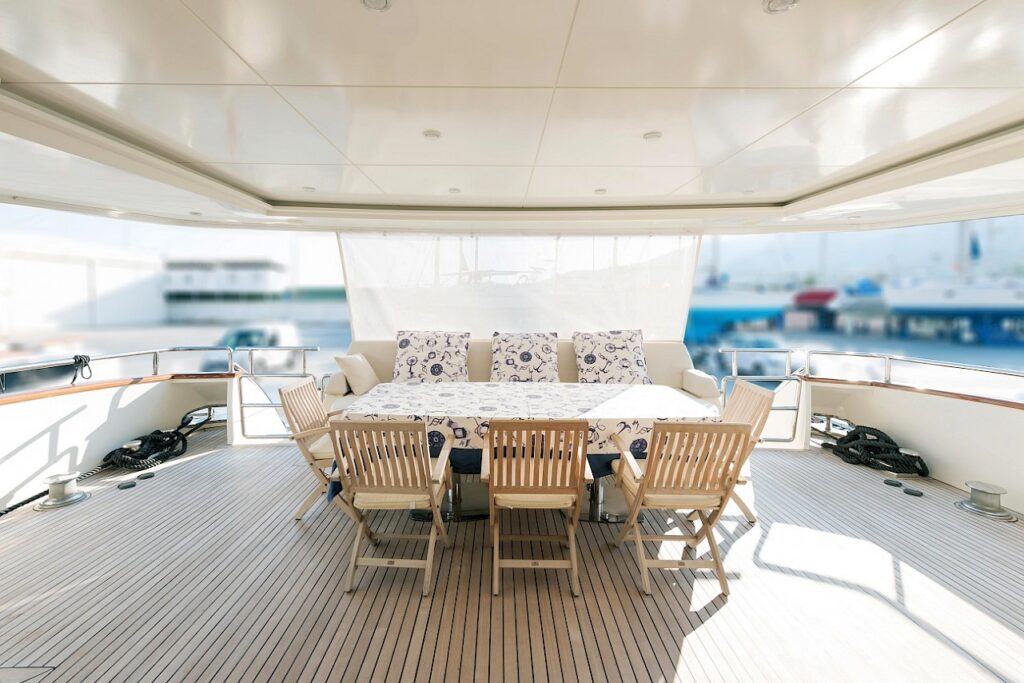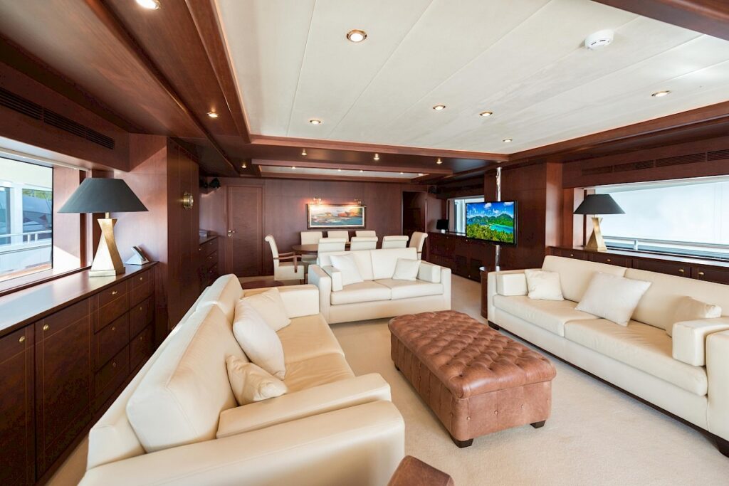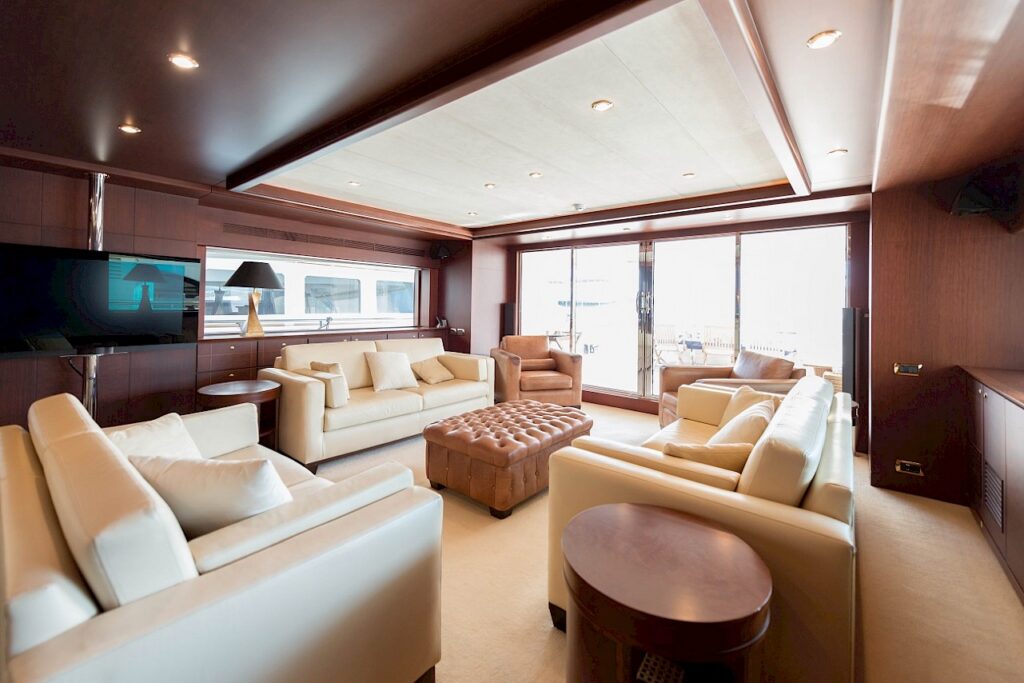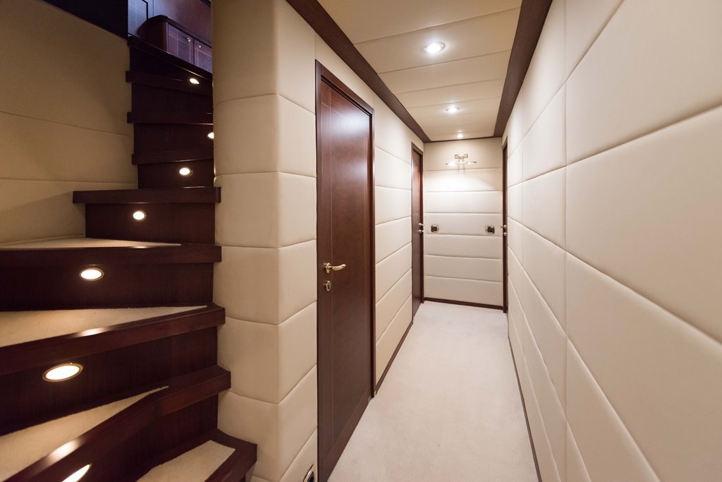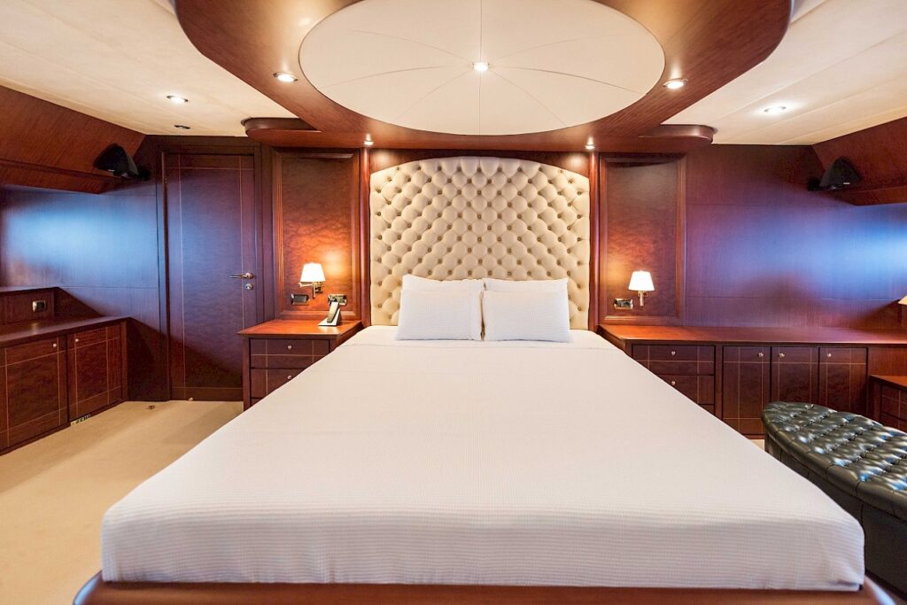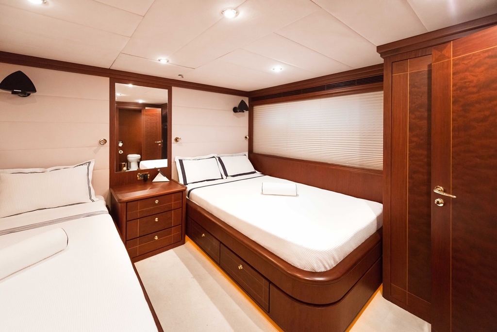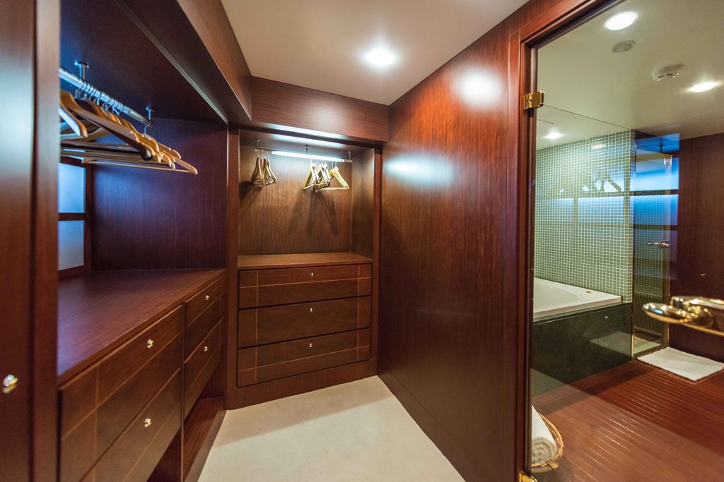 Motor yacht TURKUAZ has 4 comfortable and spacious guest cabins – 1 master, 1 VIP, and 2 twins. A full beam master cabin is located on the main deck with a walk-in wardrobe and spacious bathroom. The main deck of TURKUAZ also features a study room.
