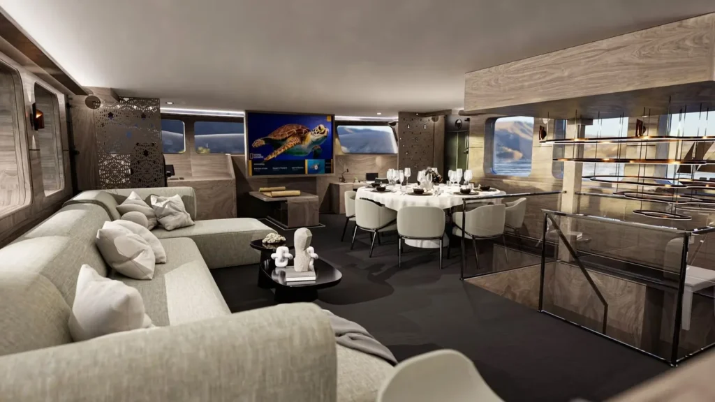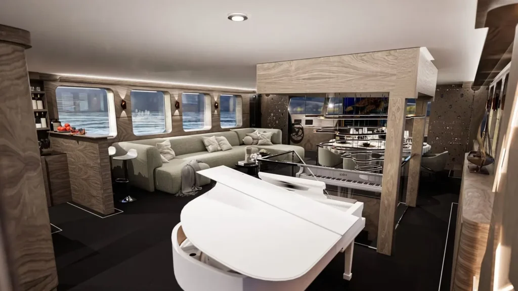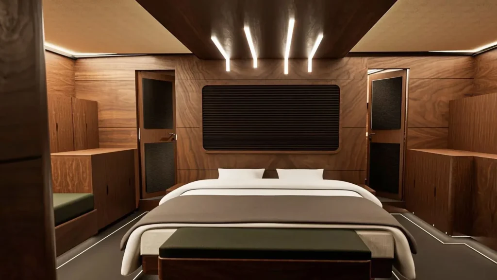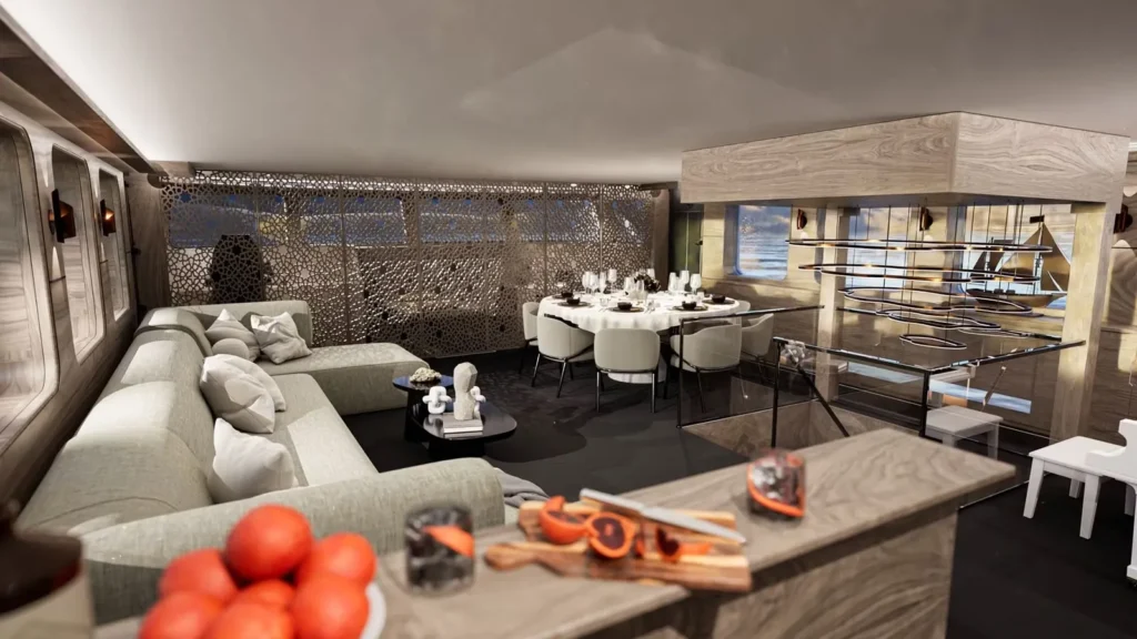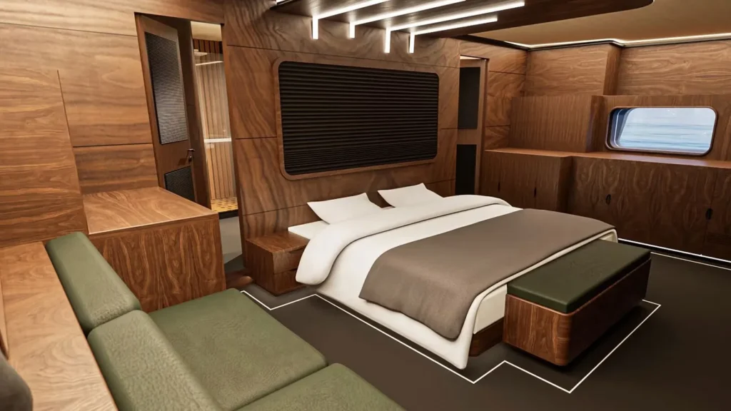 The boat has six cabins: a 50 m² master cabin, a dressing room, a Turkish bath, and a steam room. The boat has three guest cabins with a double bed and two guest cabins with a single bed. The portholes in the cabins measure 100 cm x 50 cm. Guests seated in chairs can look out through the portholes.