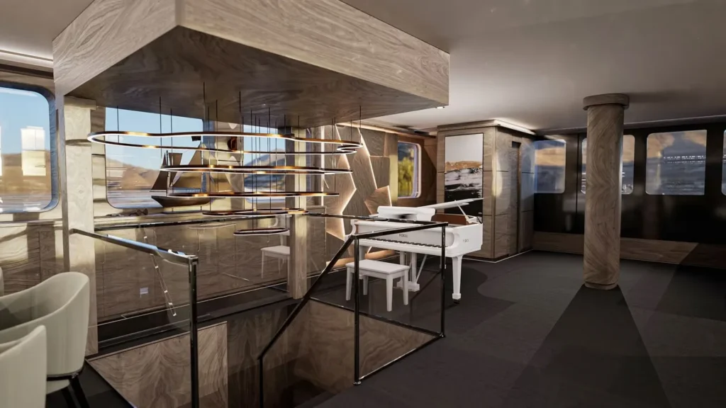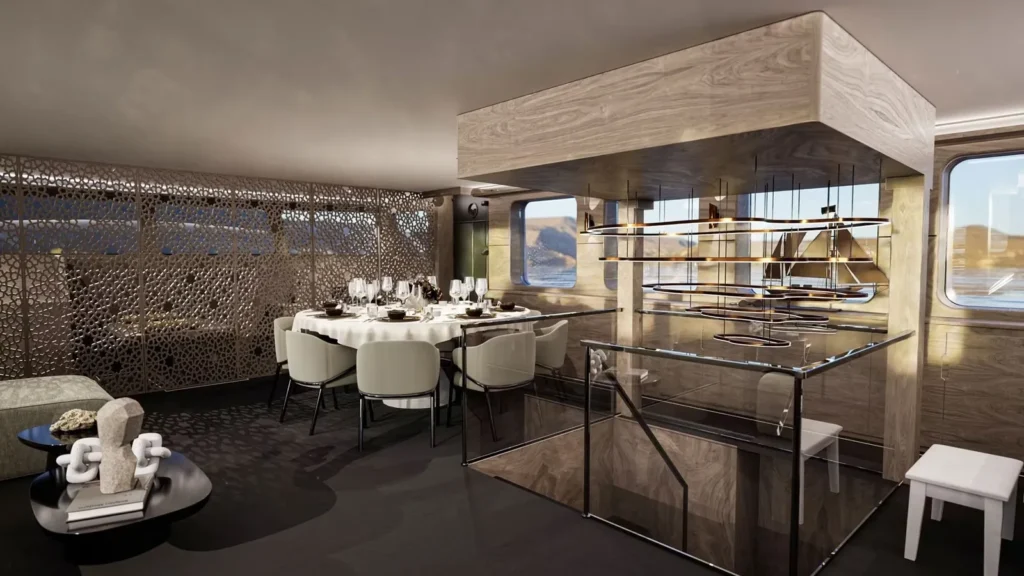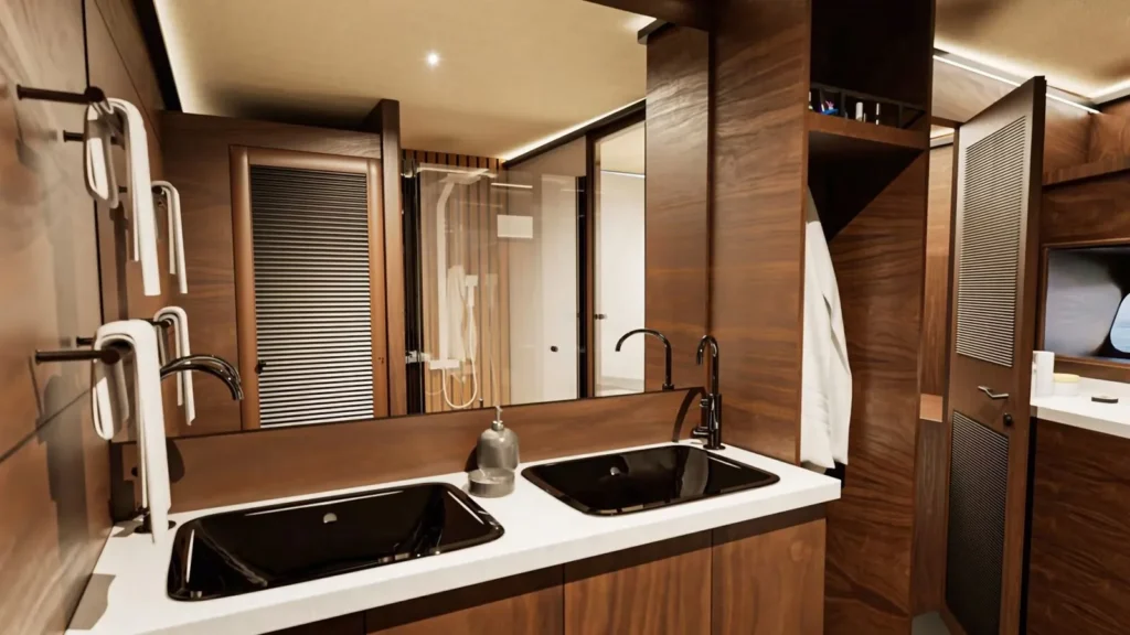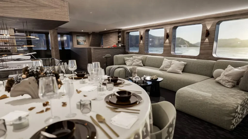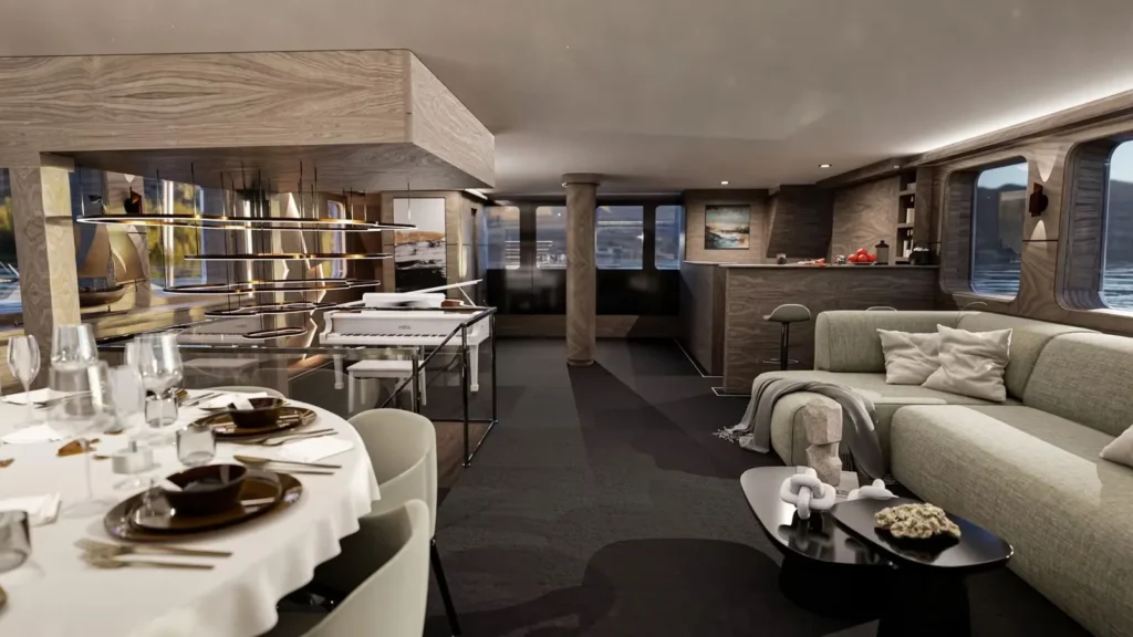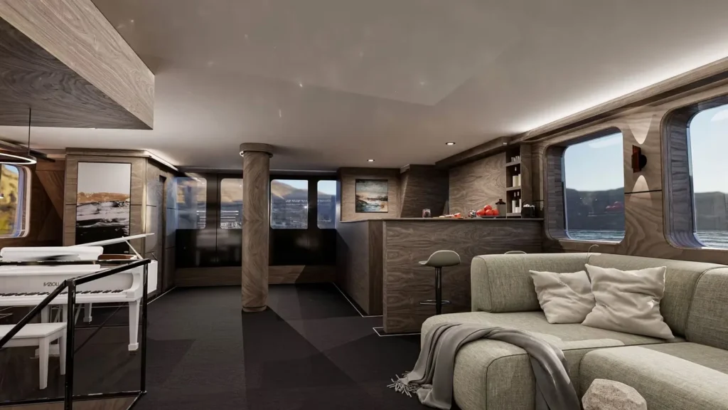 The boat has six cabins: a 50 m² master cabin, a dressing room, a Turkish bath, and a steam room. The boat has three guest cabins with a double bed and two guest cabins with a single bed. The portholes in the cabins measure 100 cm x 50 cm. Guests seated in chairs can look out through the portholes.