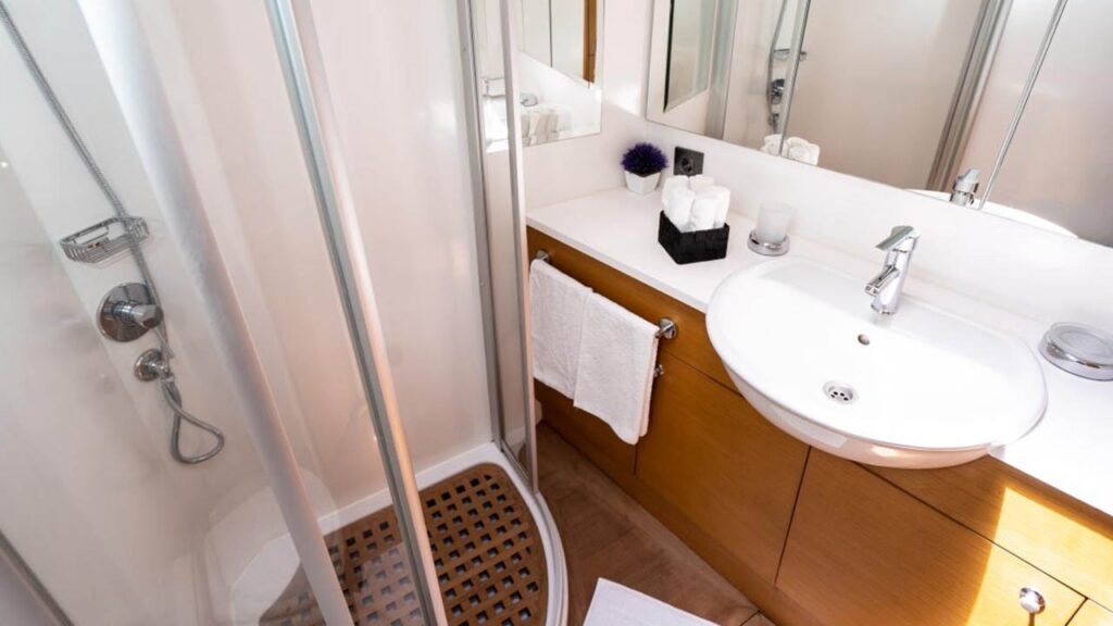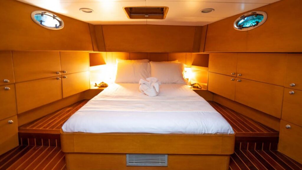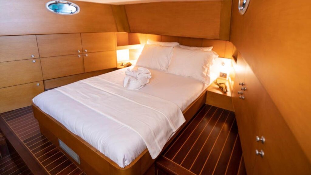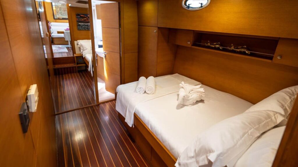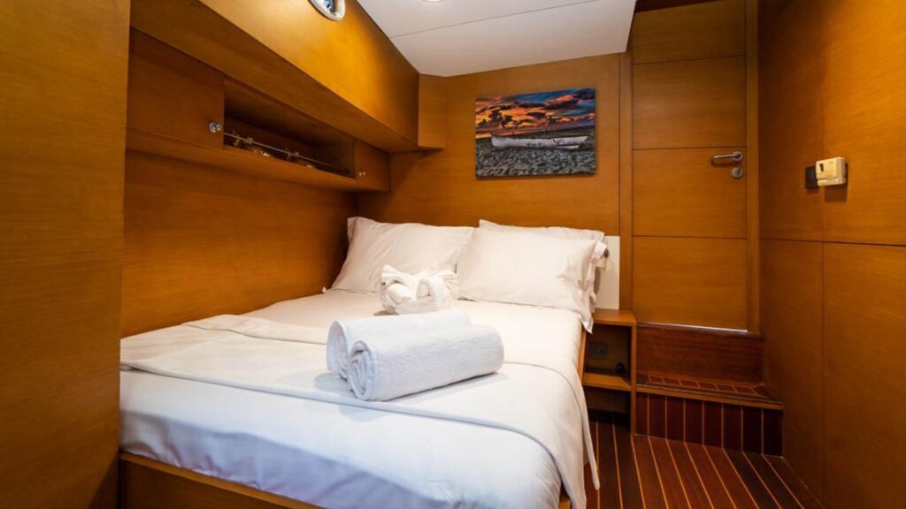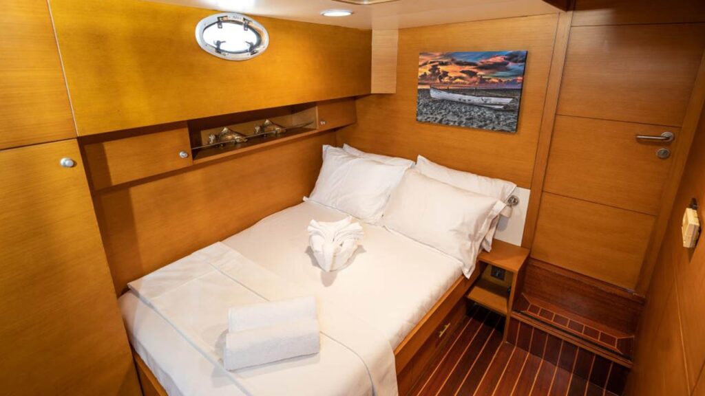 3 kabini ile 6 kişilik kapasiteye sahiptir. Tüm kabinleri klima ile donatılmış olup, oldukça şık yaşam alanları bulunmaktadır. Modern tarzda tasarlanan teknemizde 3 mürettebat hizmet vermektedir.