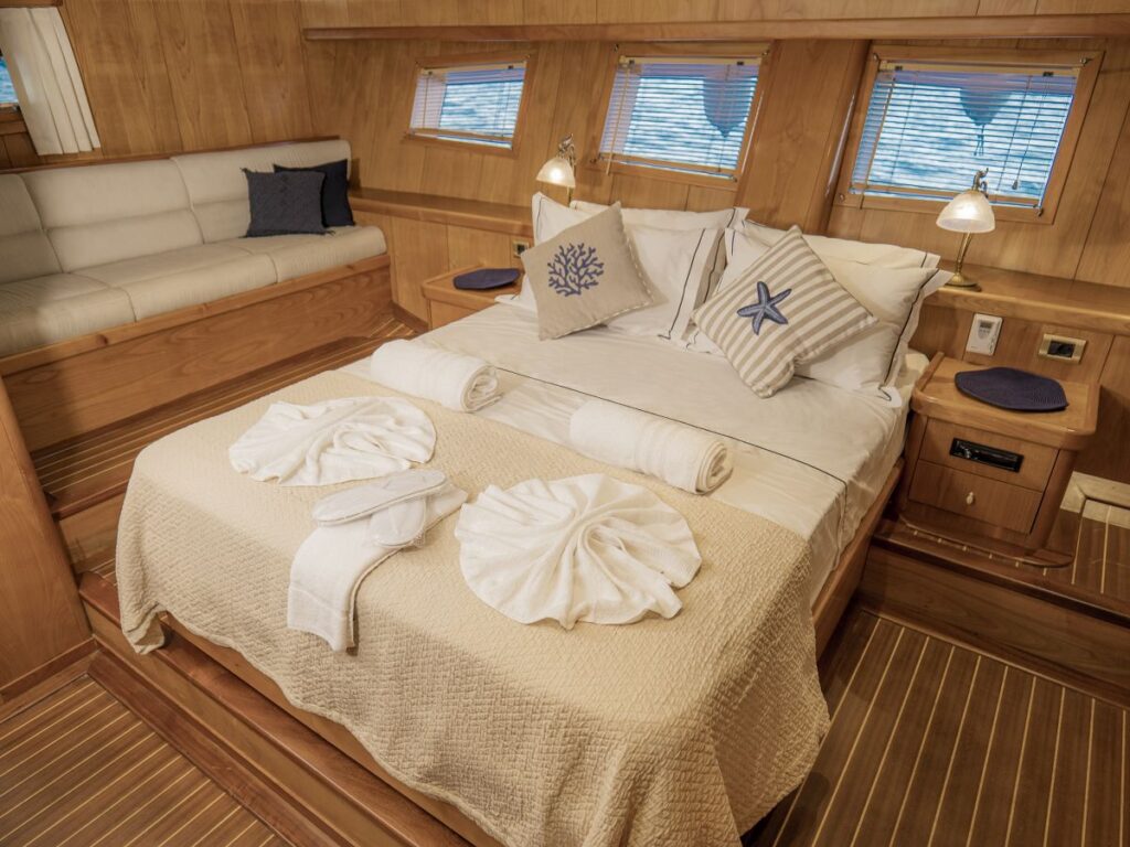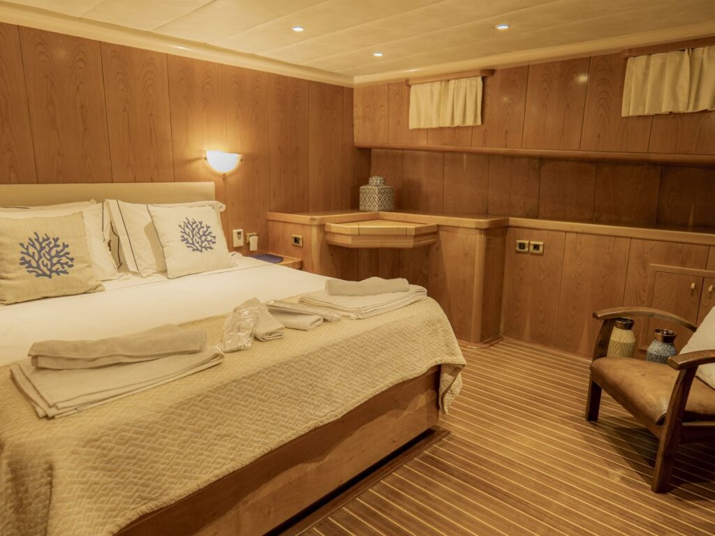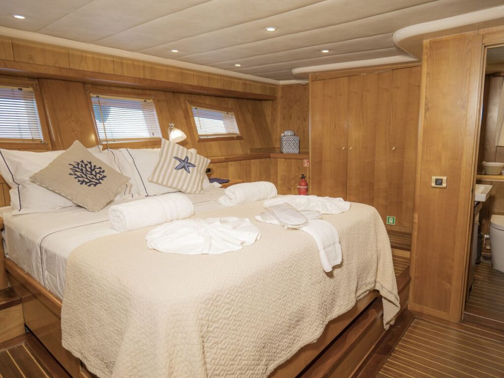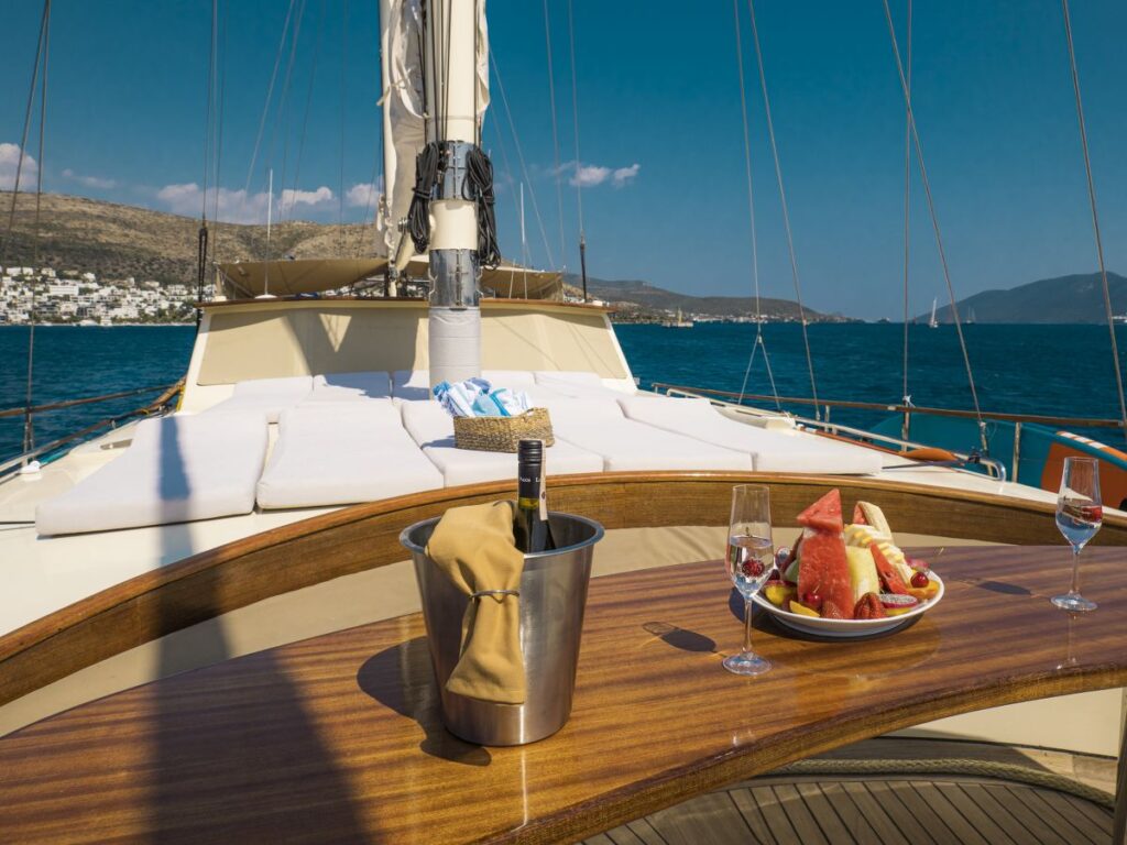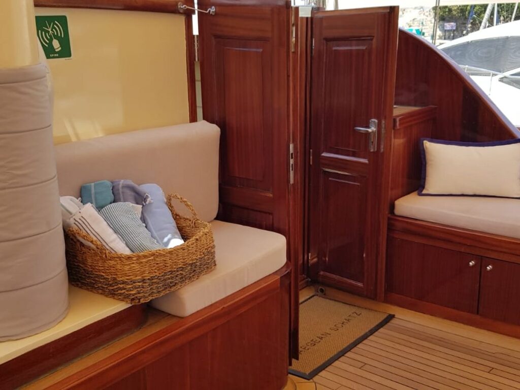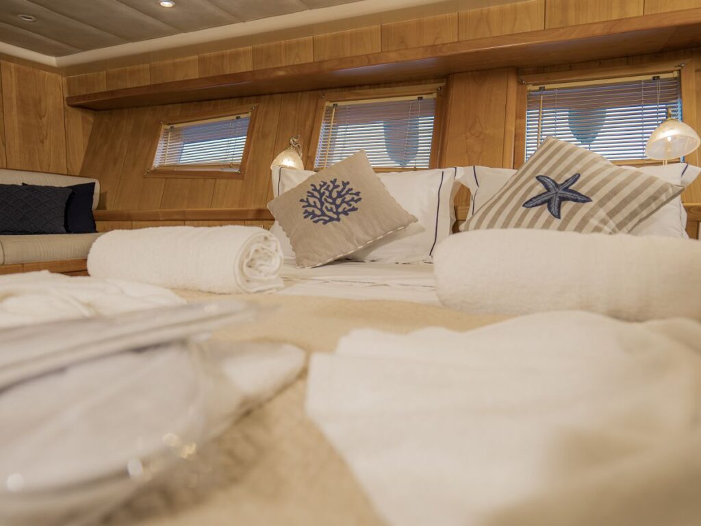 Gulet Aegean Schatz, 10 misafirinin her zaman en üst düzeyde özenle bakılmasını sağlamak için en kaliteli malzeme ve işçilikle Bodrum’da inşa edilmiştir, 5 kişilik ekibi çok yüksek hizmet kalitesini sürdürmektedir.