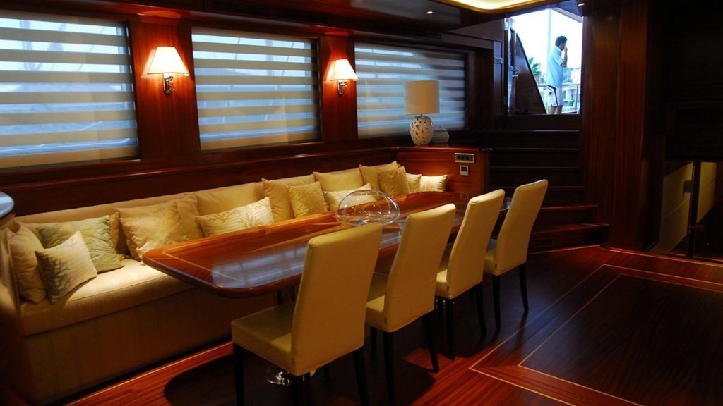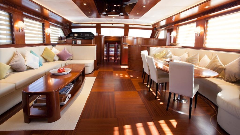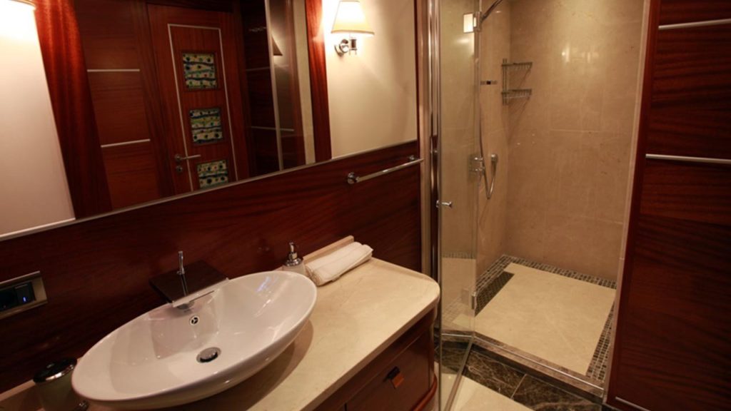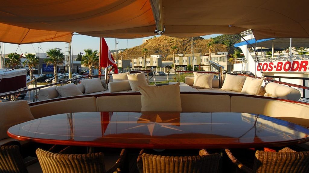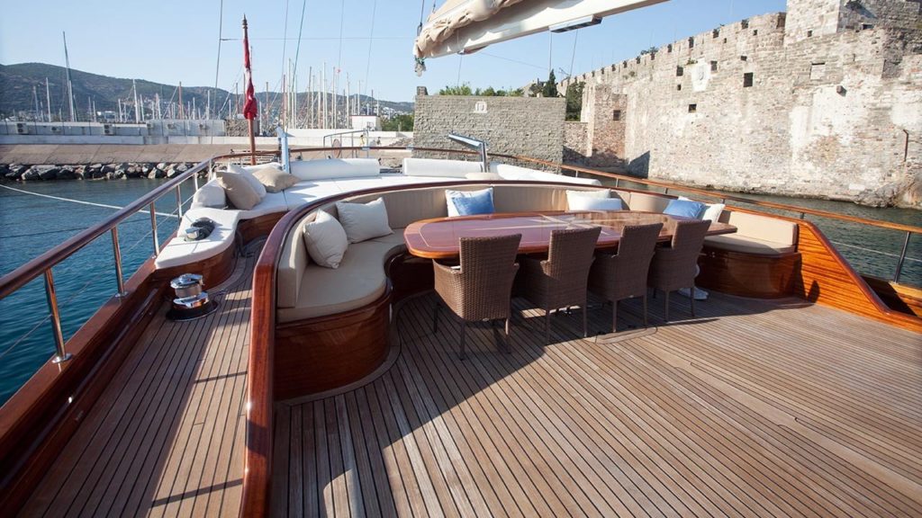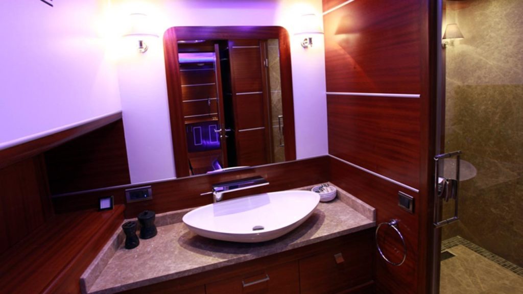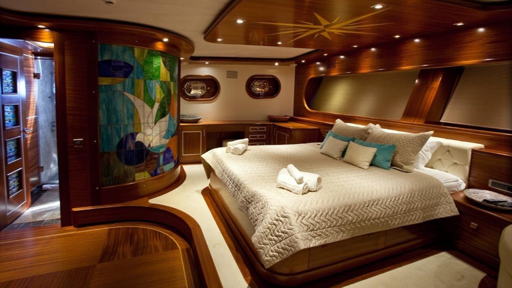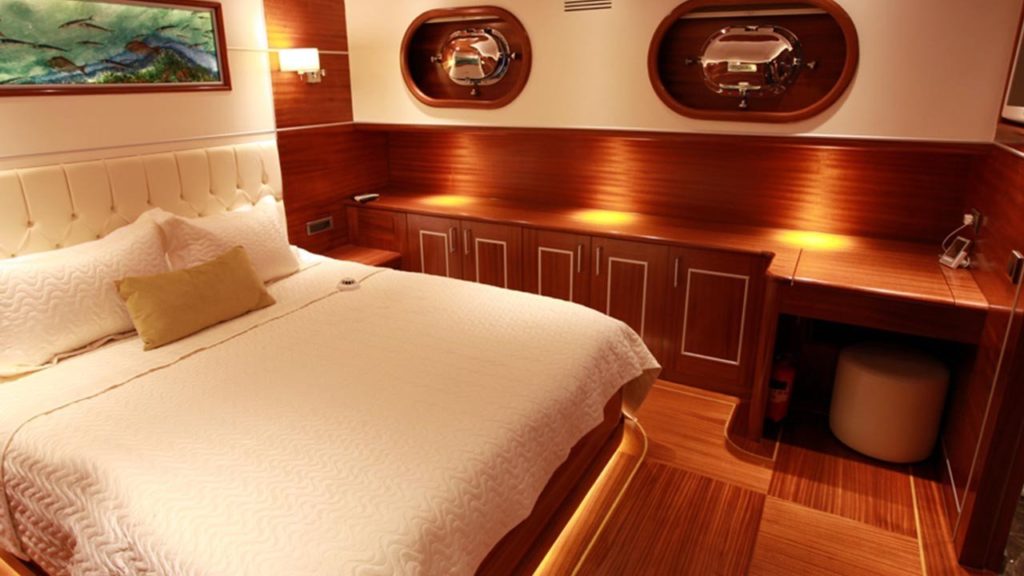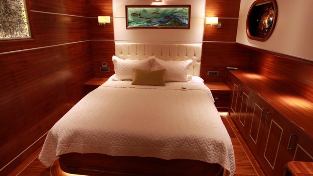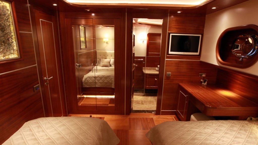 Bu gulet o kadar büyük ve o kadar geniş ki sanki bir gulet yerine butik bir otelde kalıyormuşsunuz gibi görünüyor. Teknede 2’si master, 2’si double ve 2’si twin olmak üzere tümü en modern ve gerekli imkanlarla donatılmış 6 kabin bulunmaktadır. 7 kişilik ekip, profesyonel olmaktan daha fazlasıdır ve ne yaptıklarını ve sizi mutlu etmek için ne yapmaları gerektiğini tam olarak bilirler.