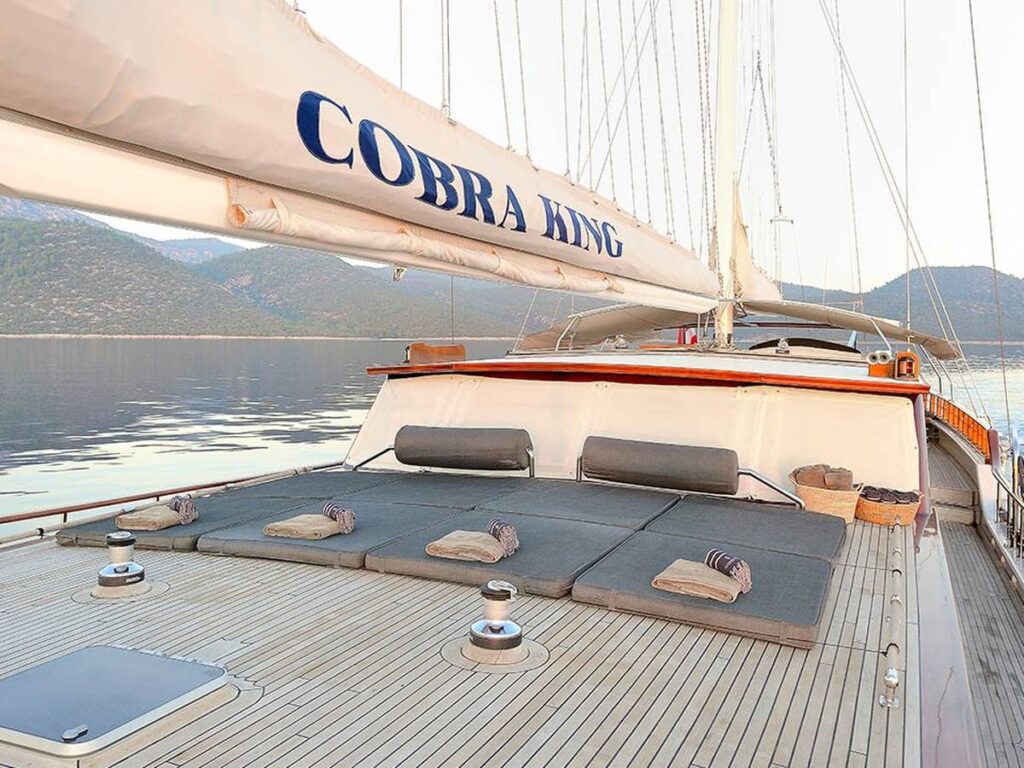 Şık ve zarif tasarımıyla Gulet Cobra King, seçkin misafirlerine beş yıldızlı konforla üst düzey bir özel yelken gezisinin keyfini çıkarma fırsatı sunuyor. 34 metrelik, beş kabinli bu VIP lüks yat, Ege Denizi’nde tekne yapım deneyimi ve zanaatkarlığının merkezi olan Bodrum’da geleneksel gulet tasarımına göre inşa edilmiştir. Altı kişilik mürettebat, daha önce gördüğünüz veya deneyimlediğiniz hiçbir şeye benzemiyor ve bu yolculuğu gerçekten unutulmaz kılıyor.