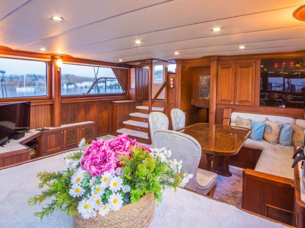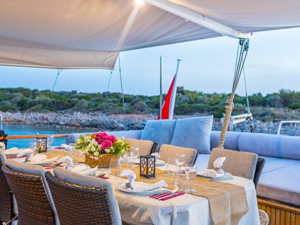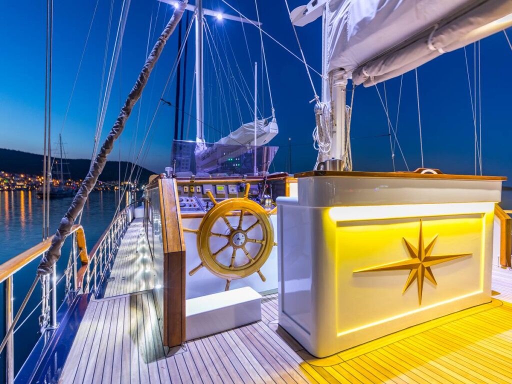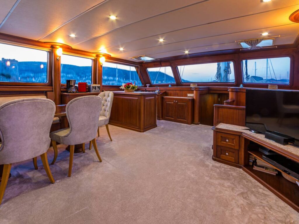Konforlu ve şık iç dizaynı ile göze çarpan gulet, Bodrum çıkışlı turlarınız için idealdir. Açık ve kapalı yemek alanları, tarz salonu, güvertesi kaliteden ödün vermeden hazırlanmış, Mavi yolculuk için tasarlanmıştır.
