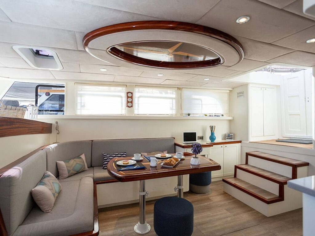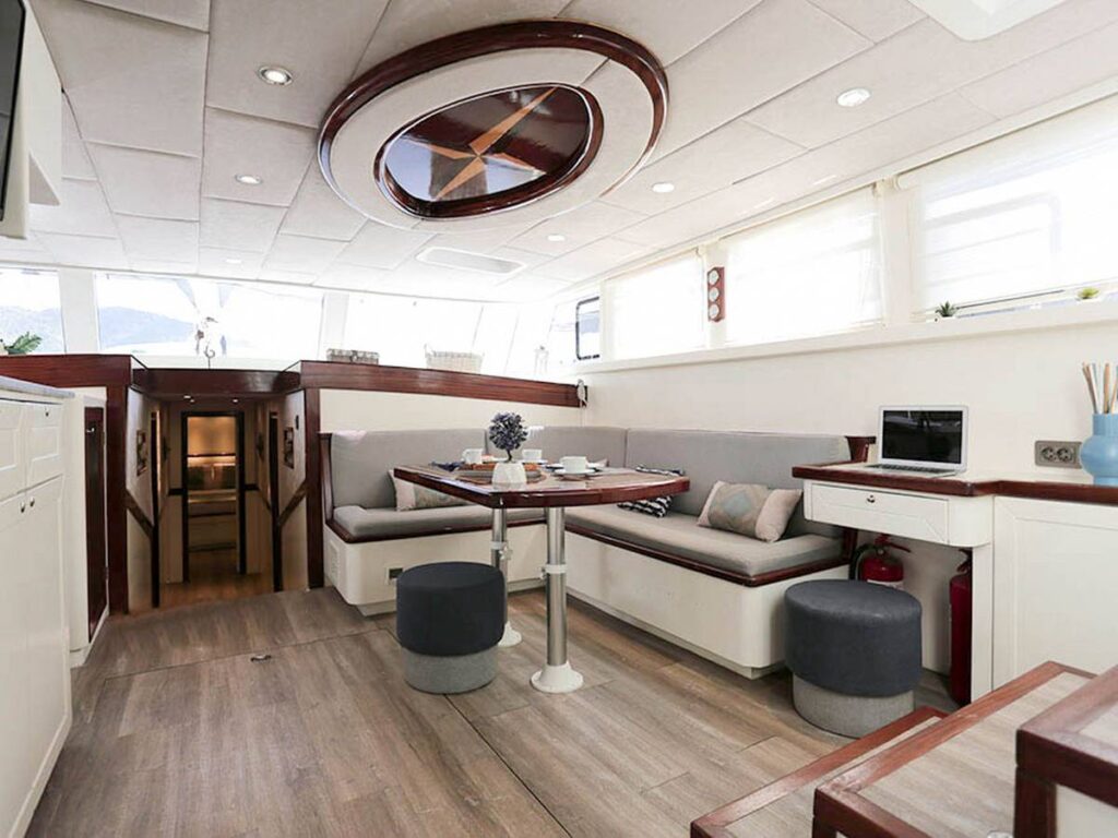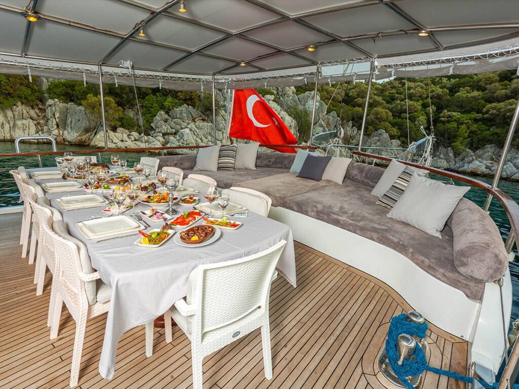 Teknenin arkasında minderli geniş bir oturma alanı, yemek masası ve yemek alanı bulunmaktadır. Gulet, salonda ayrı bir yemek masasına sahiptir ve yemekleriniz tam donanımlı ayrı bir mutfakta hazırlanmaktadır. Derya Deniz Gulet, tüm misafirler için bol miktarda uzanma minderi ve alana sahiptir. 3 kişilik mürettebat deneyimli ve çok profesyonel ve hiçbir şeyden mahrum kalmayacaksınız.