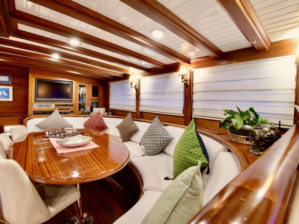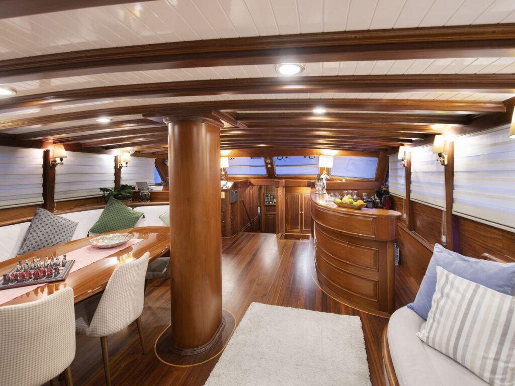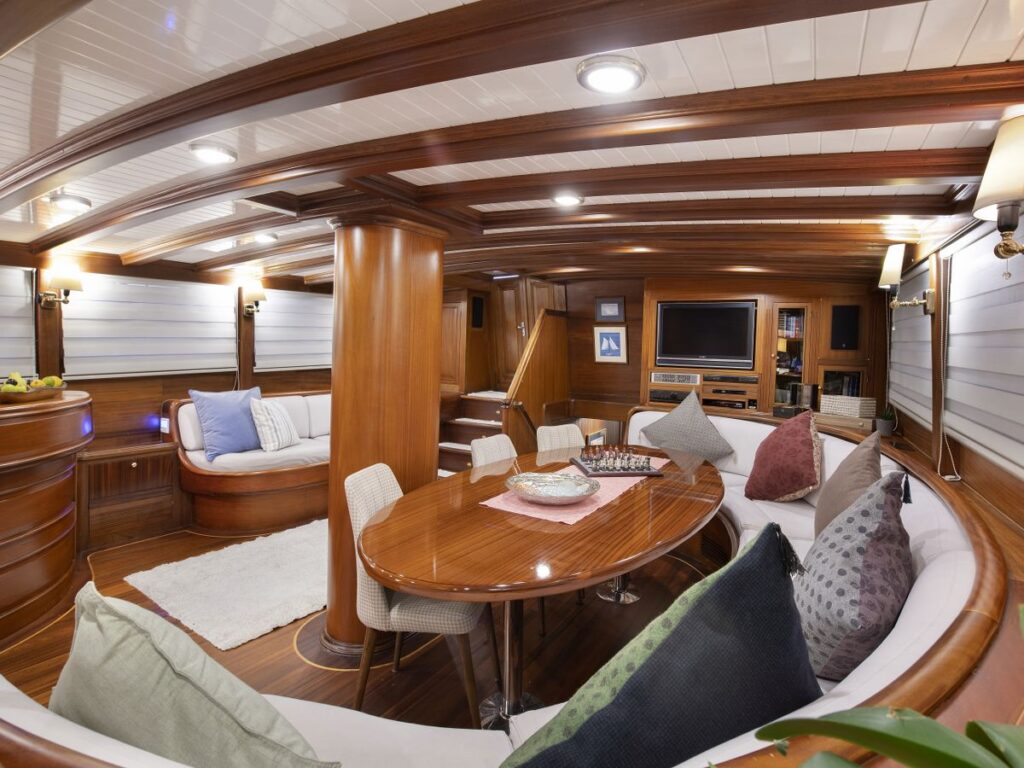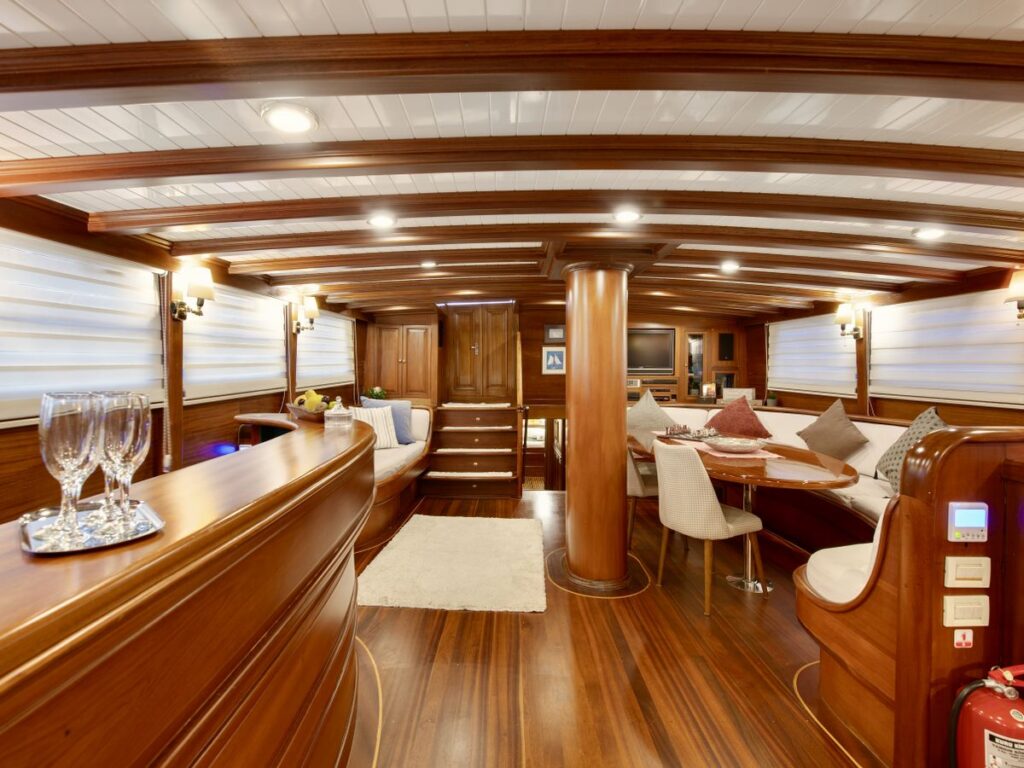 Tam donanımlı bir mutfak, kapalı ve açık yemek alanı ve klimalı bir salon bulunmaktadır. Salonda ve tüm kabinlerde TV, DVD ve müzik sistemi bulunmaktadır. Ayrıca herkes için bol miktarda şezlong bulunan geniş bir güneşlenme terası da vardır. 5 kişilik ekip çok deneyimli ve her şeyde bunu fark ediyorsunuz. Bu mavi yolculuk sırasında hiçbir şeyden mahrum kalmayacaksınız.