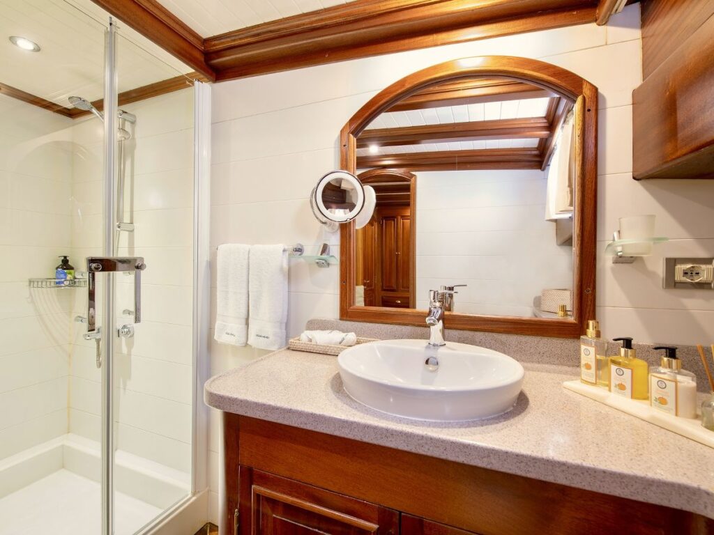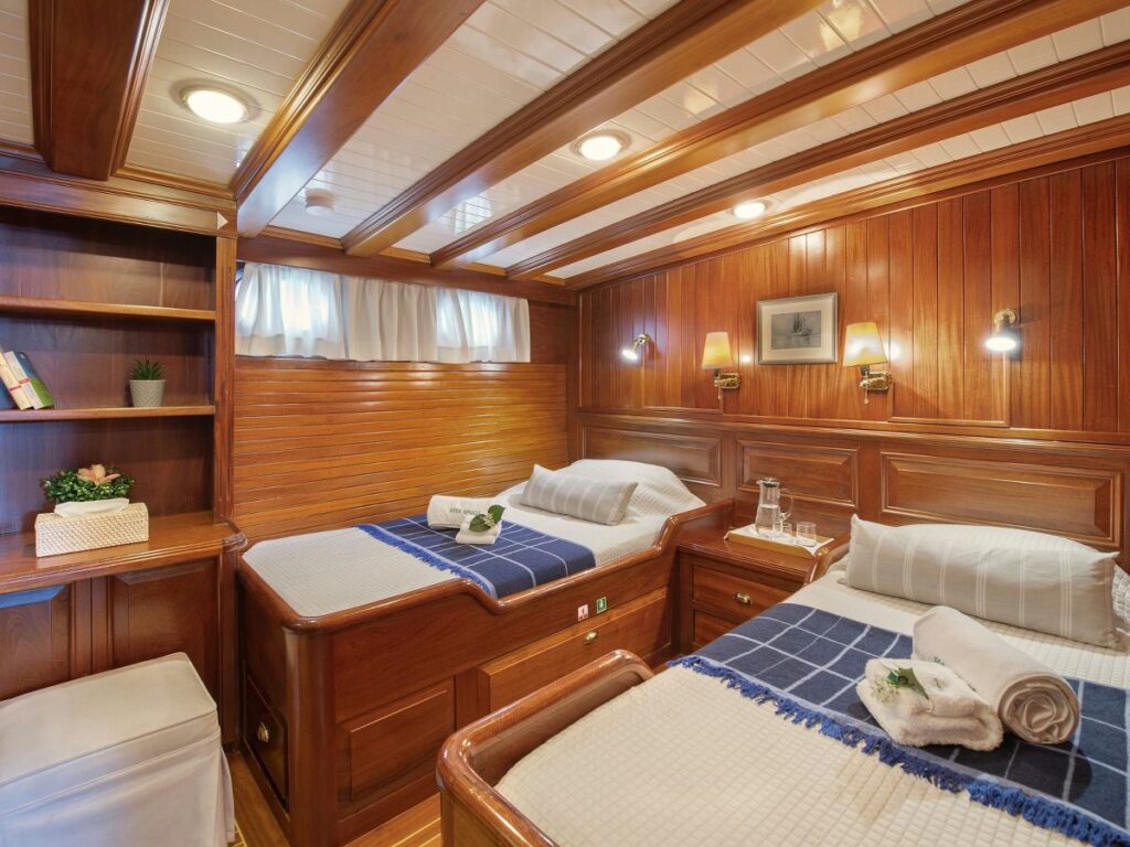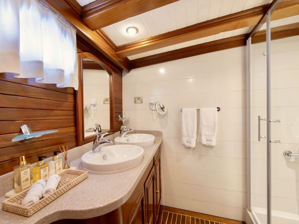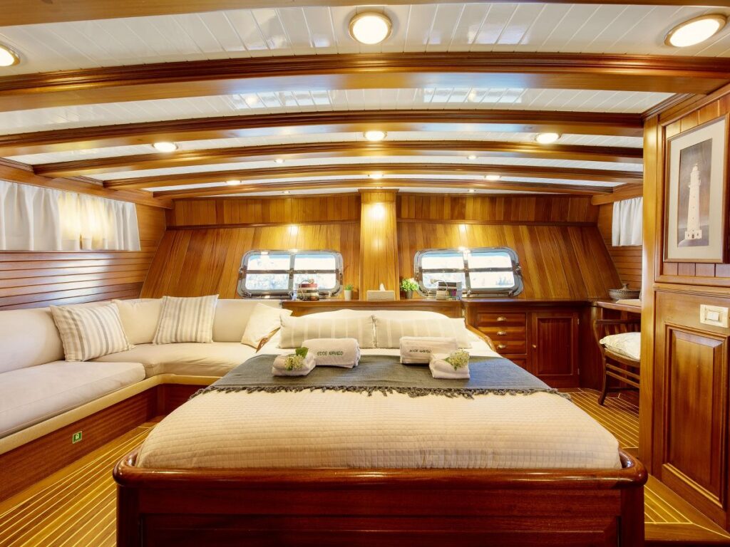 Tam donanımlı bir mutfak, kapalı ve açık yemek alanı ve klimalı bir salon bulunmaktadır. Salonda ve tüm kabinlerde TV, DVD ve müzik sistemi bulunmaktadır. Ayrıca herkes için bol miktarda şezlong bulunan geniş bir güneşlenme terası da vardır. 5 kişilik ekip çok deneyimli ve her şeyde bunu fark ediyorsunuz. Bu mavi yolculuk sırasında hiçbir şeyden mahrum kalmayacaksınız.