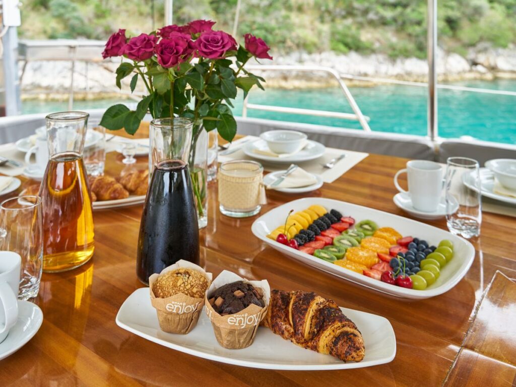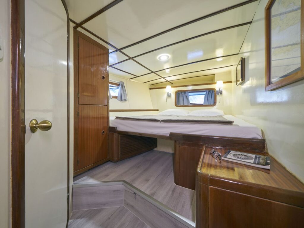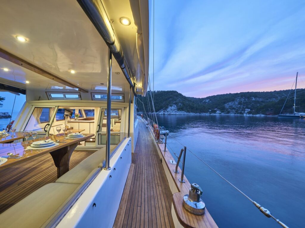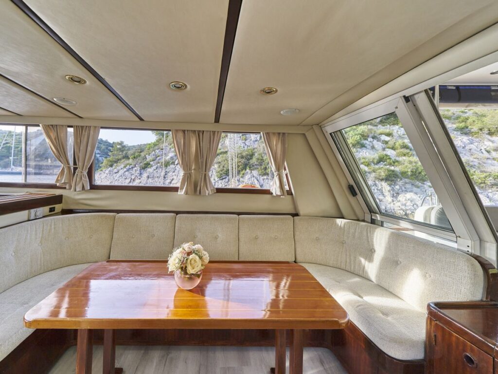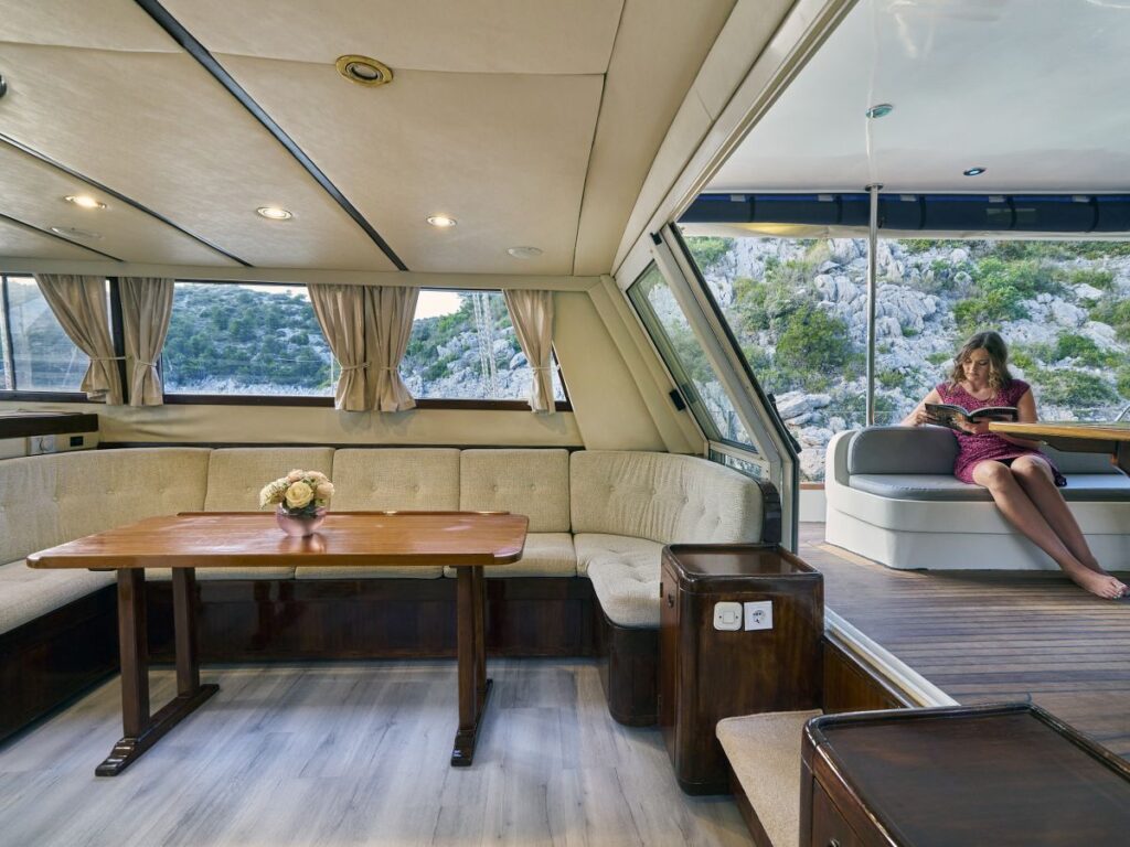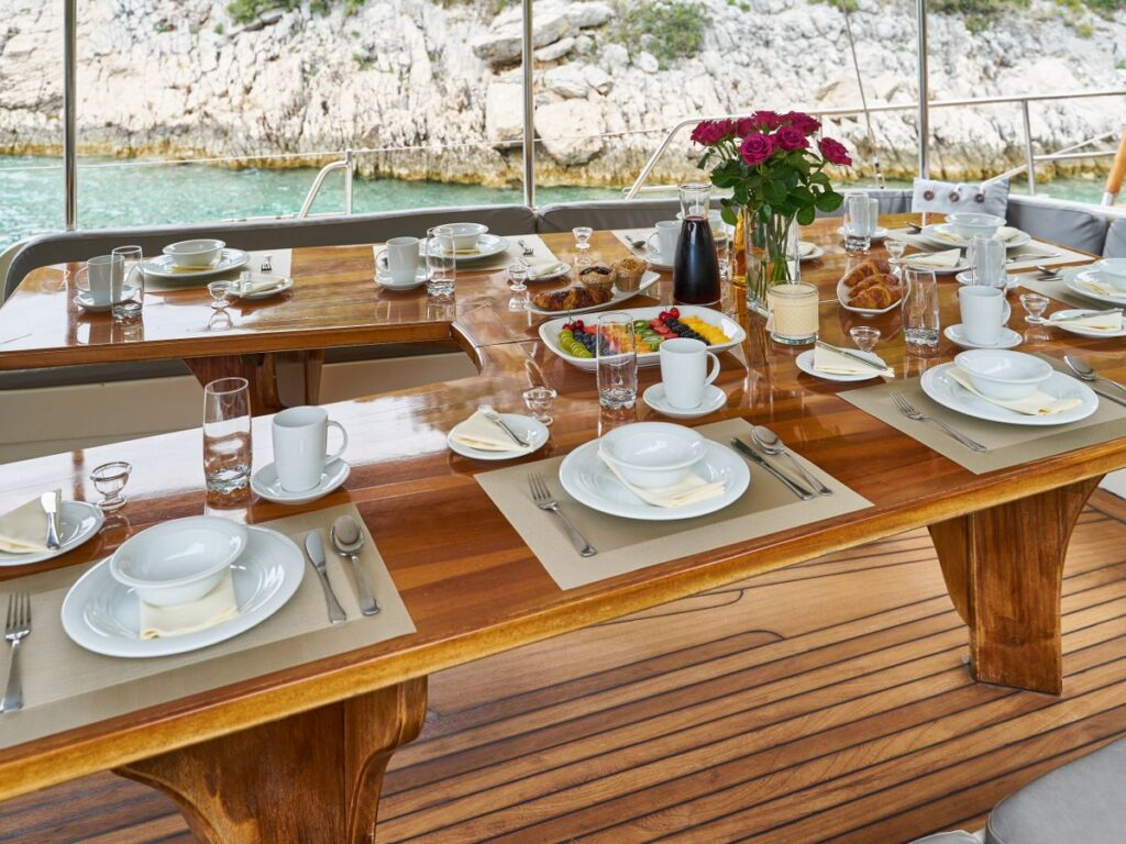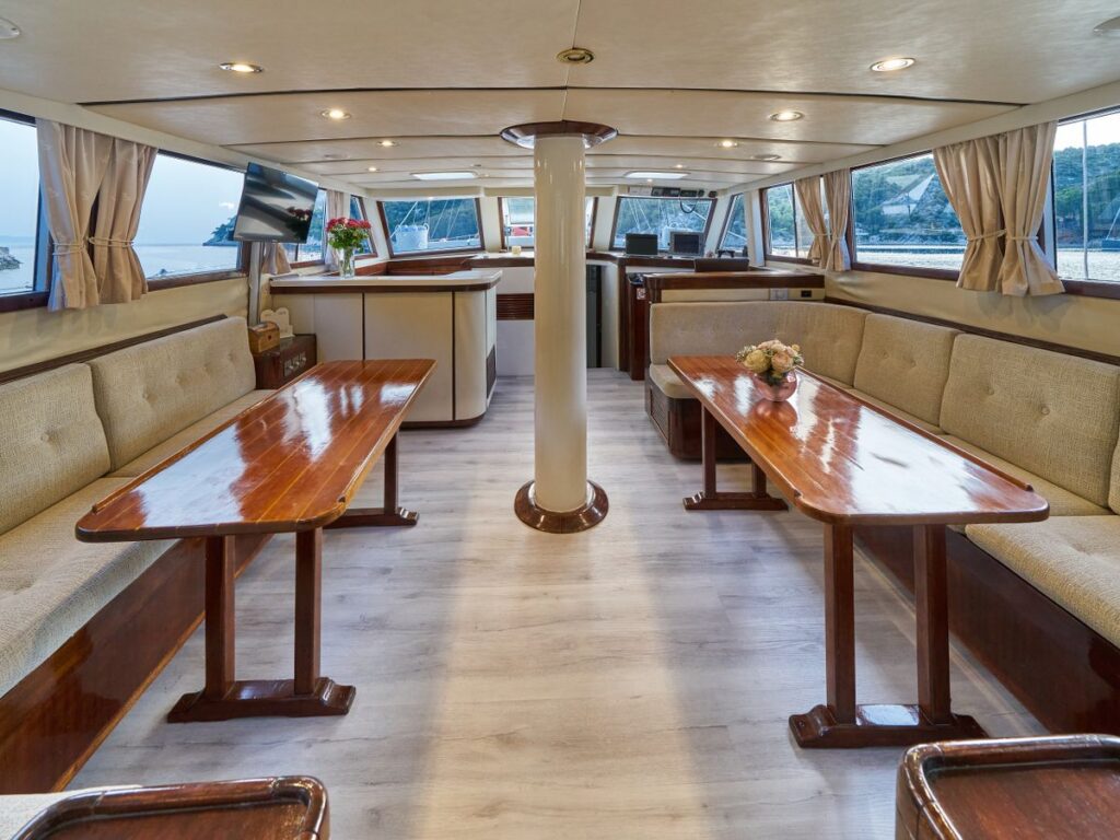 Kıç güvertede minderli geniş bir oturma alanı, yemek masası ve yemek alanı bulunmaktadır. Oturma odasında ayrı bir yemek masası vardır ve yemekler tam donanımlı ayrı bir mutfakta hazırlanmaktadır. Fortuna guletinde güneşlenmek ve dinlenmek için fazlasıyla alan mevcuttur. Salonda TV, DVD ve müzik sistemi bulunmaktadır.