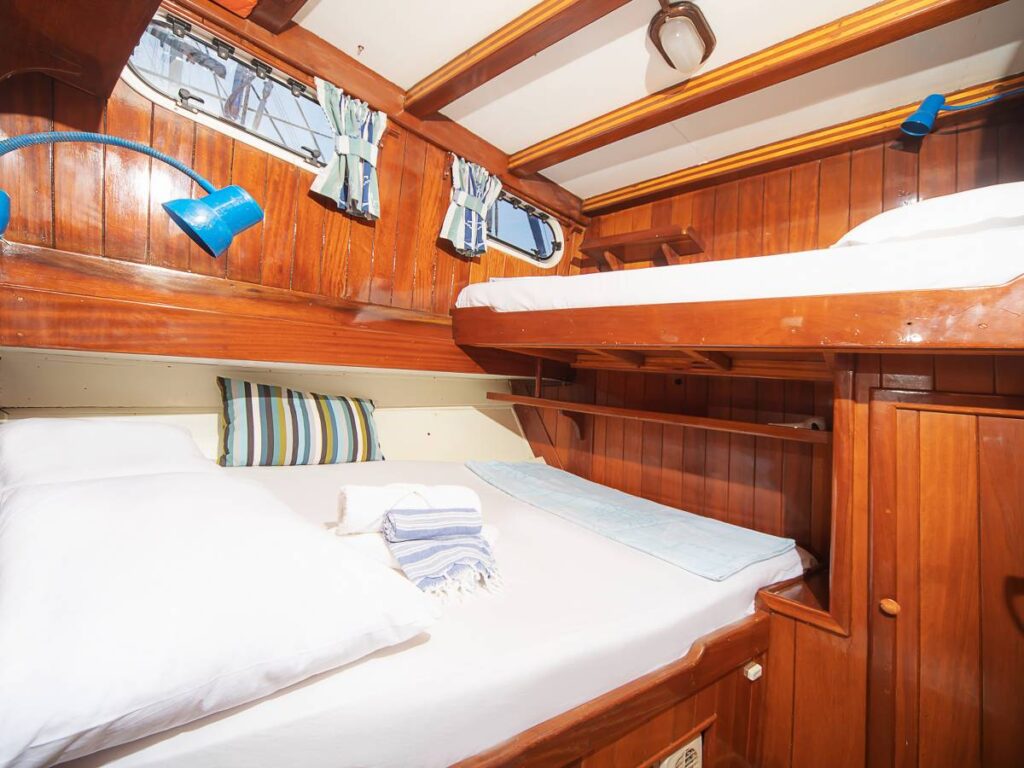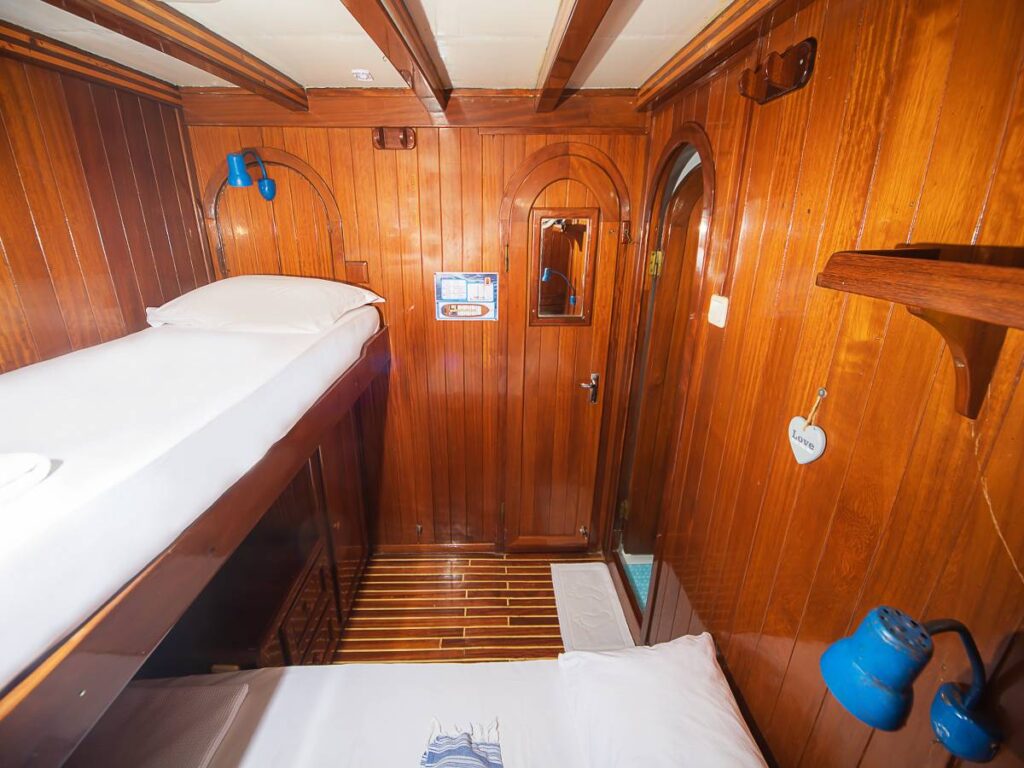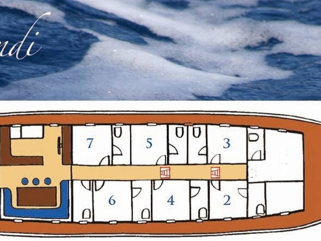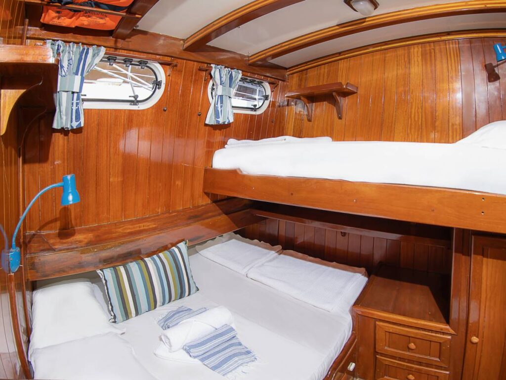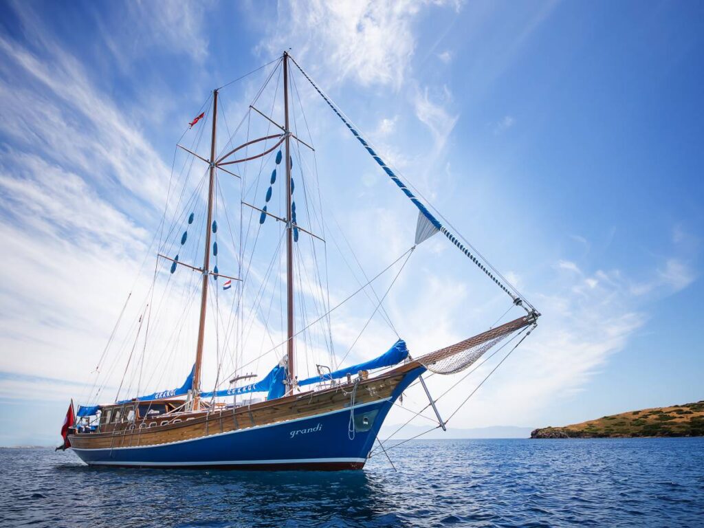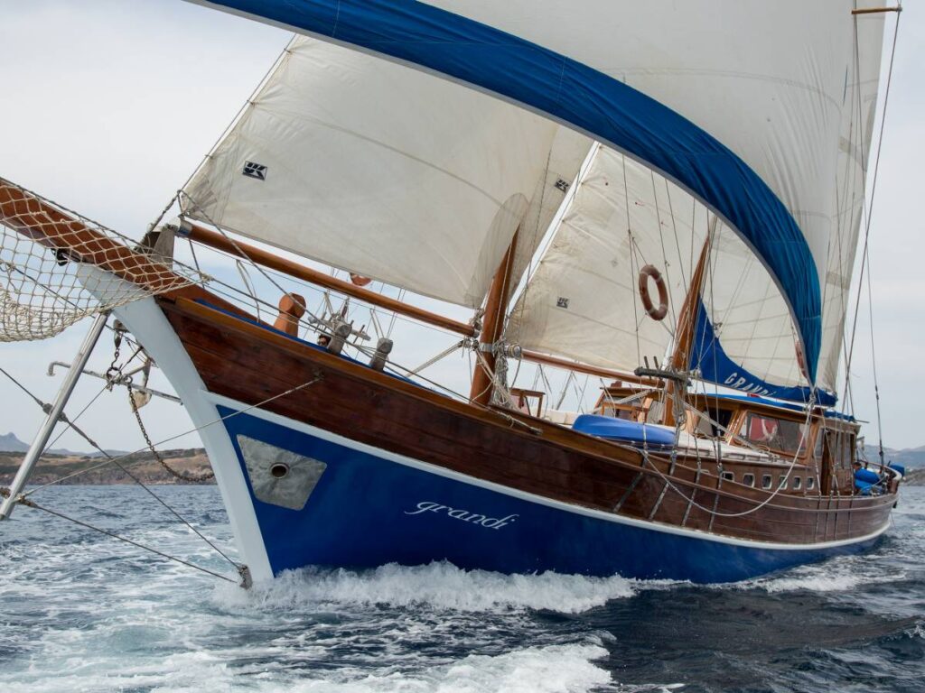 6 çift kabinli 26 metre uzunluğundaki bu gulet maksimum 12 kişi için uygundur ve Standard Plus kategorisine girer. Ancak ekonomik fiyatlı bu guletten beklediğinizden çok daha fazlasını alacağınızı temin ederim. Tüm kabinlerin kendi duşu, tuvaleti ve kliması vardır (gün içinde 4 saat) ve teknede dinlenmek ve güneşlenmek için fazlasıyla yeterli alan vardır. 4 kişilik mürettebat deneyimli ve profesyoneldir ve her şeyde bunu fark edersiniz. Diğer birçok guletten farklı olarak bu güzel yat her gün denize açılıyor! Yelkenleri kaldırmak, mürettebatın eğitim aldığı bir şeydir ve bu farkı fark edersiniz! Mümkün olduğunda, motor üzerinde değil, koydan körfeze yelken açıyoruz. Bu nedenle Grandi guleti, Bodrum’da her yıl düzenlenen uluslararası yelken yarışması olan Bodrum Cup ta her yıl çok yüksek seviyelerde tamamlanır.