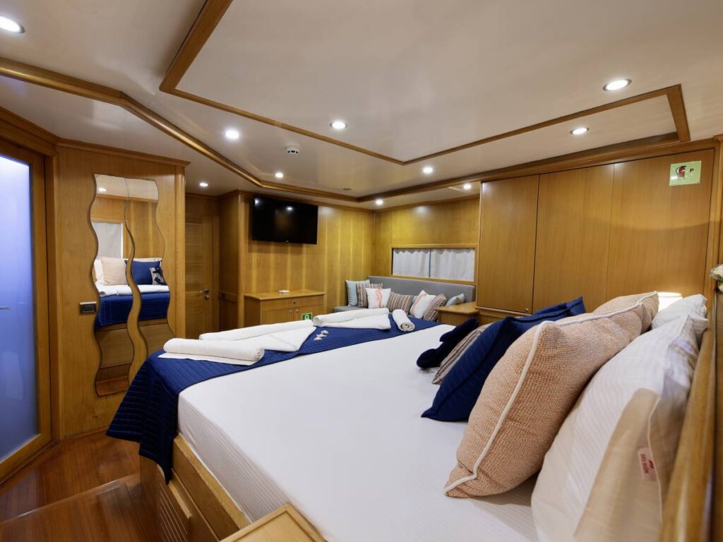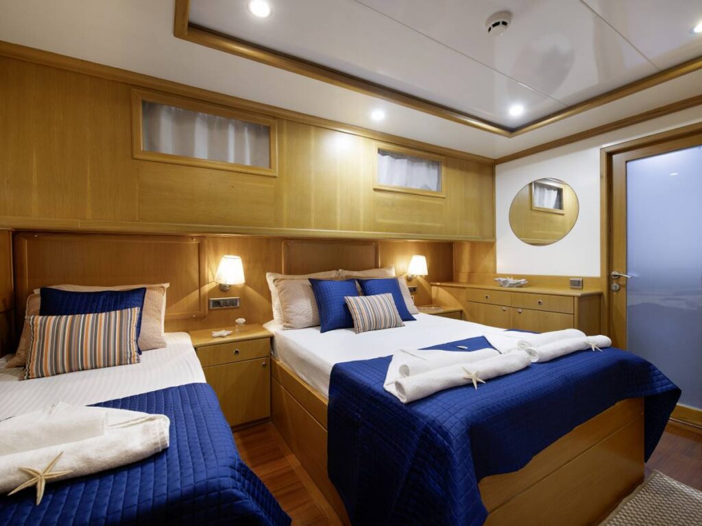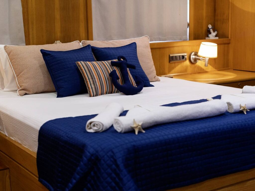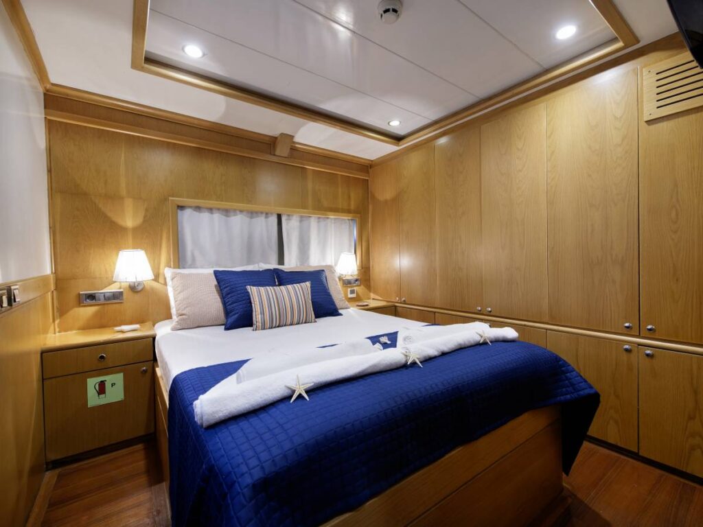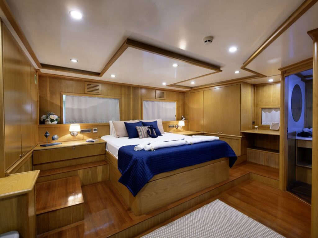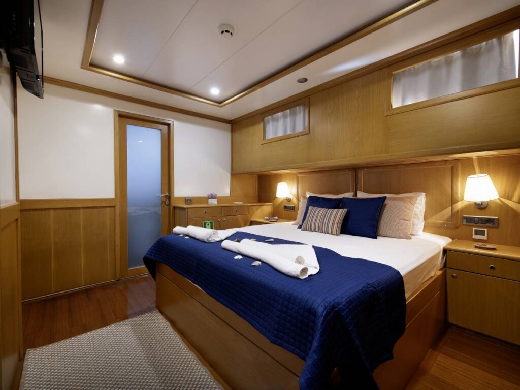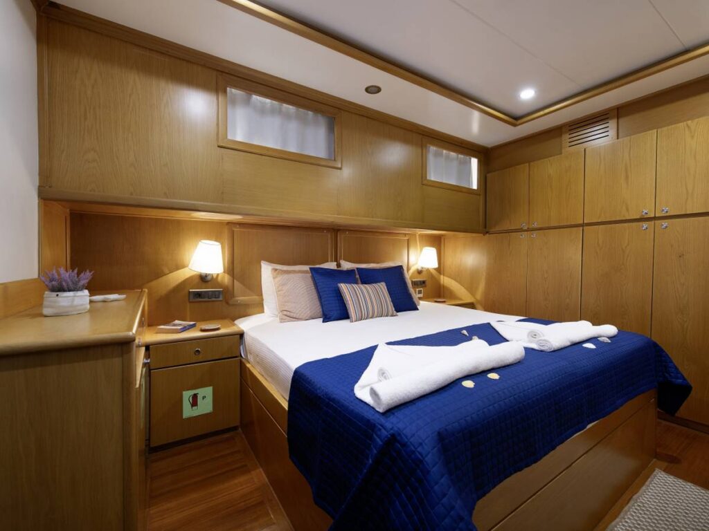 5 kabini bulunan teknemizin kapasitesi 12 kişiliktir. Tüm kabinler ve salon klima ile donatılmıştır. 24 saat Klima hizmeti sunuyor teknemiz. Güvertede yemek alanları, güneşlenme alanları özenle hazırlanmıştır. Kabinler modern tarzda döşenmiştir ve her zaman konfor ilk plandadır.