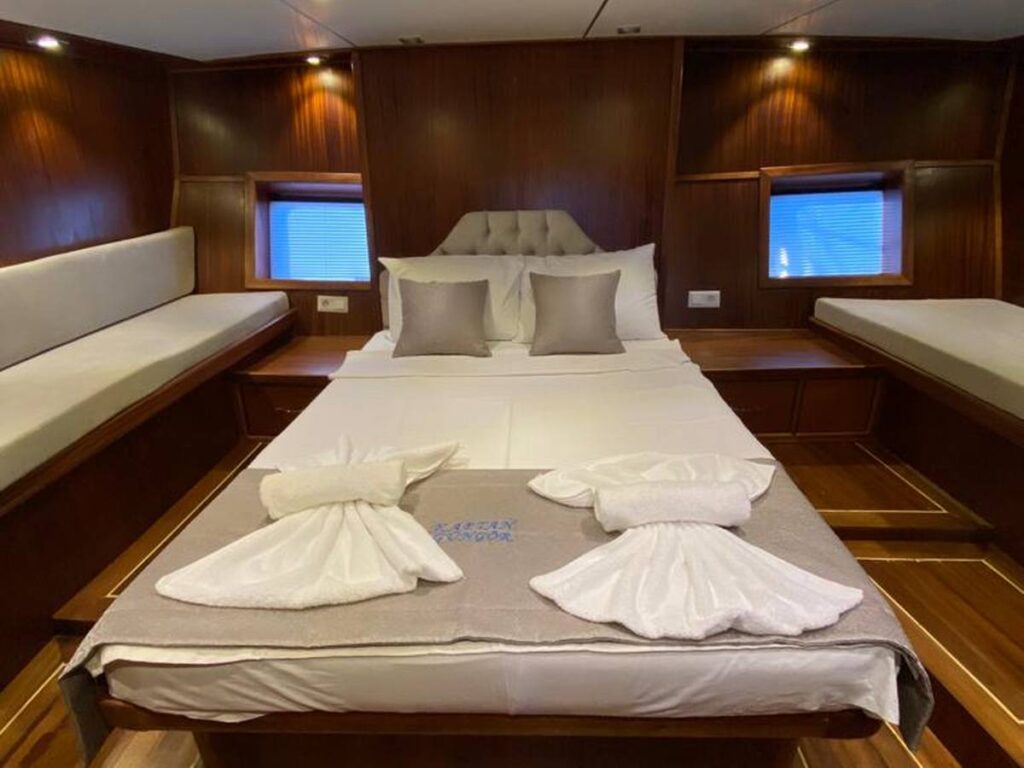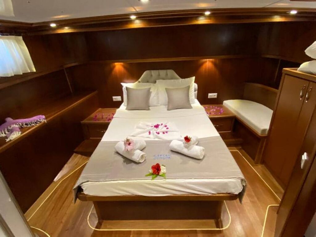 4 şık kabini bulunan teknemiz, 8 kişilik kapasiteye sahiptir. Mavi yolculukta küçük gruplar için idealdir. Kullanışlı ve rahat güverteleri, konforlu kabinleri ile doğru bir seçim. Güzel yemekleri ise cabası.