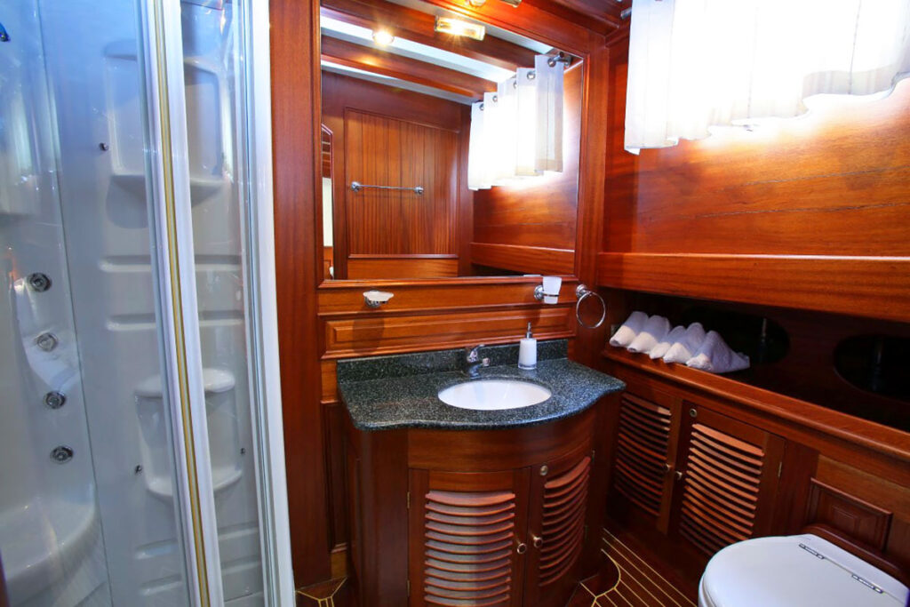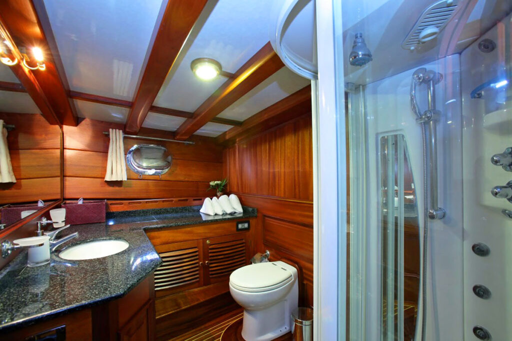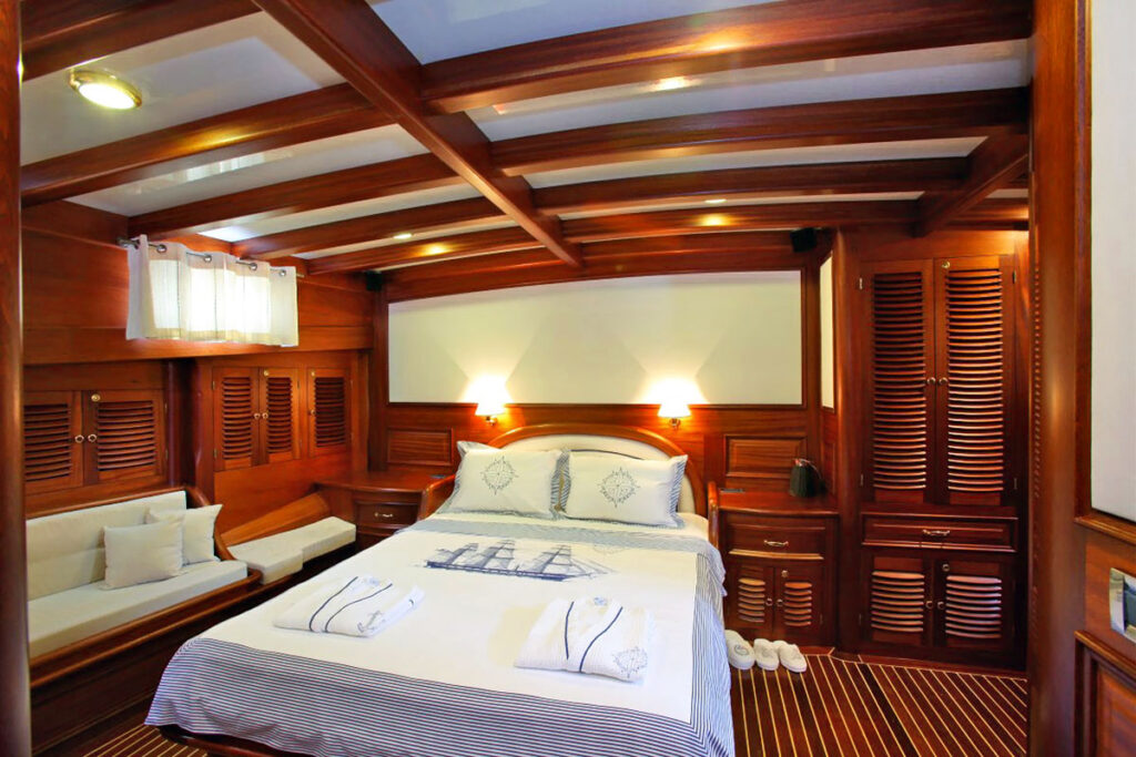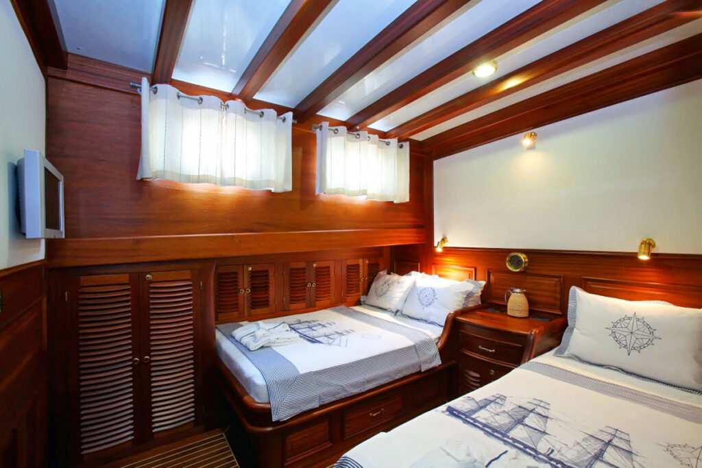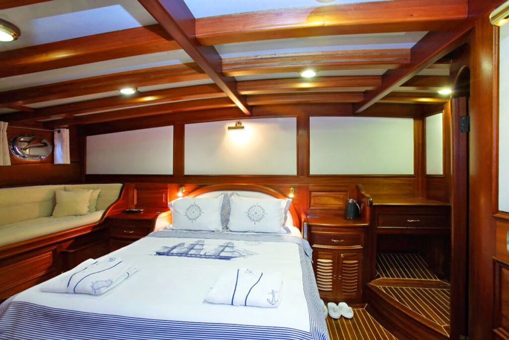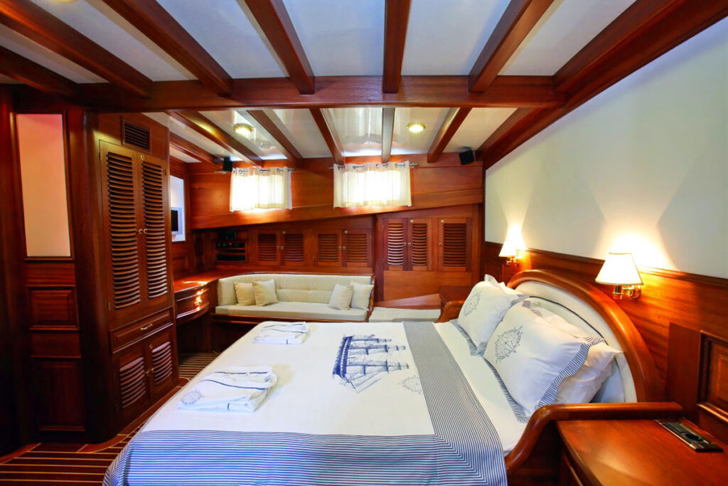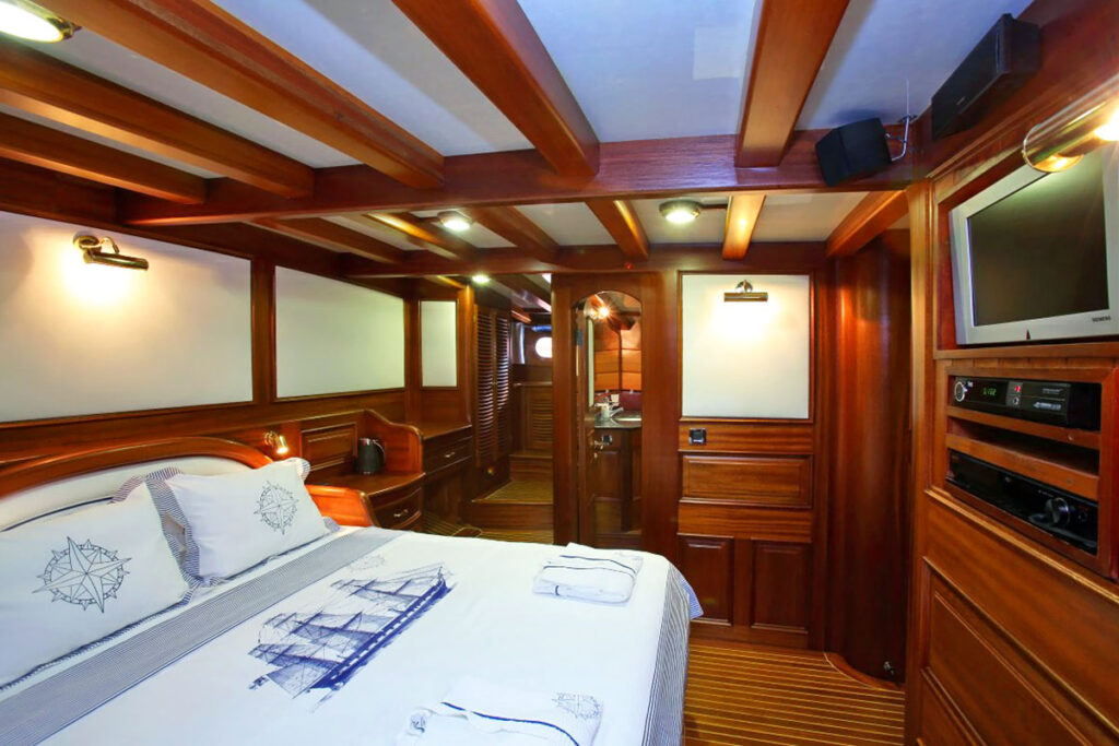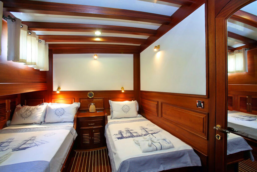 2 master, 2 double, 2 twin kabini ile 12 kişilik kapasitesi bulunmaktadır. Tam bir Mavi yolculuk için donatılan gulette her detay özenli bir şekilde düşünülmüştür. Tüm kabinlerinde klima, özel duş ve tuvalet ayrıca TV bulunmaktadır. Kendinizi denizde ama beş yıldızlı otel konforunda hissedeceğiniz bu tekne size rüya gibi bir tatil sunuyor.