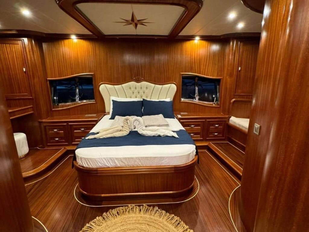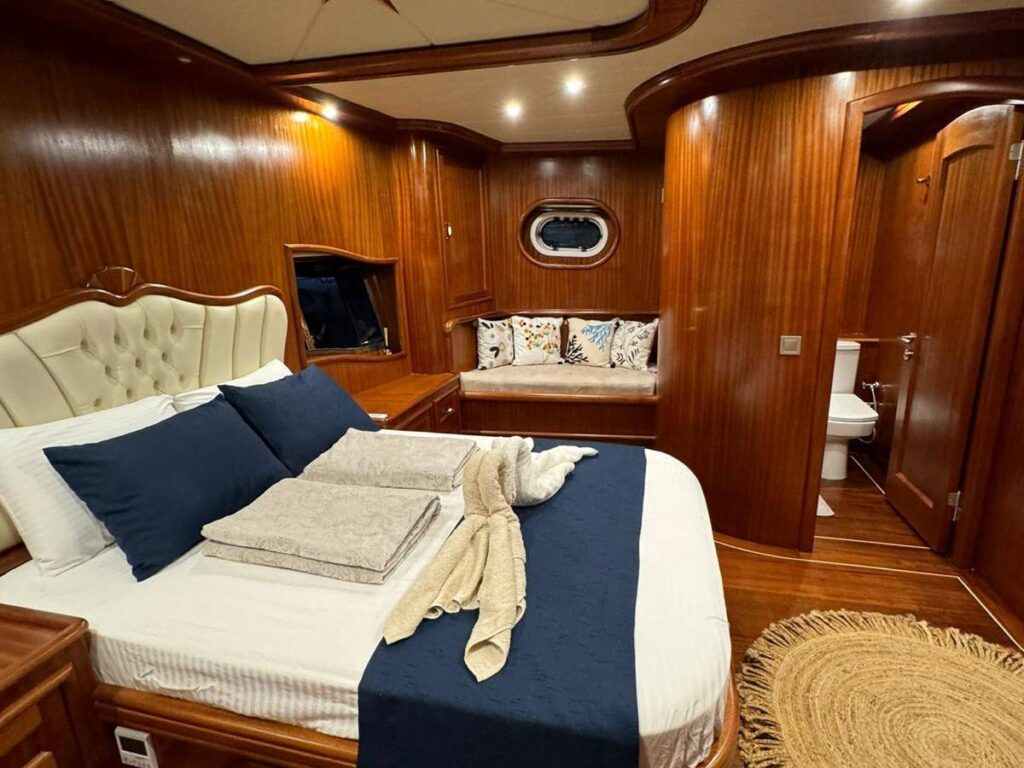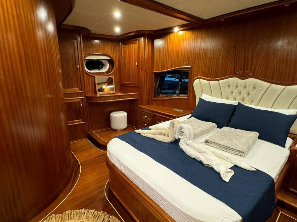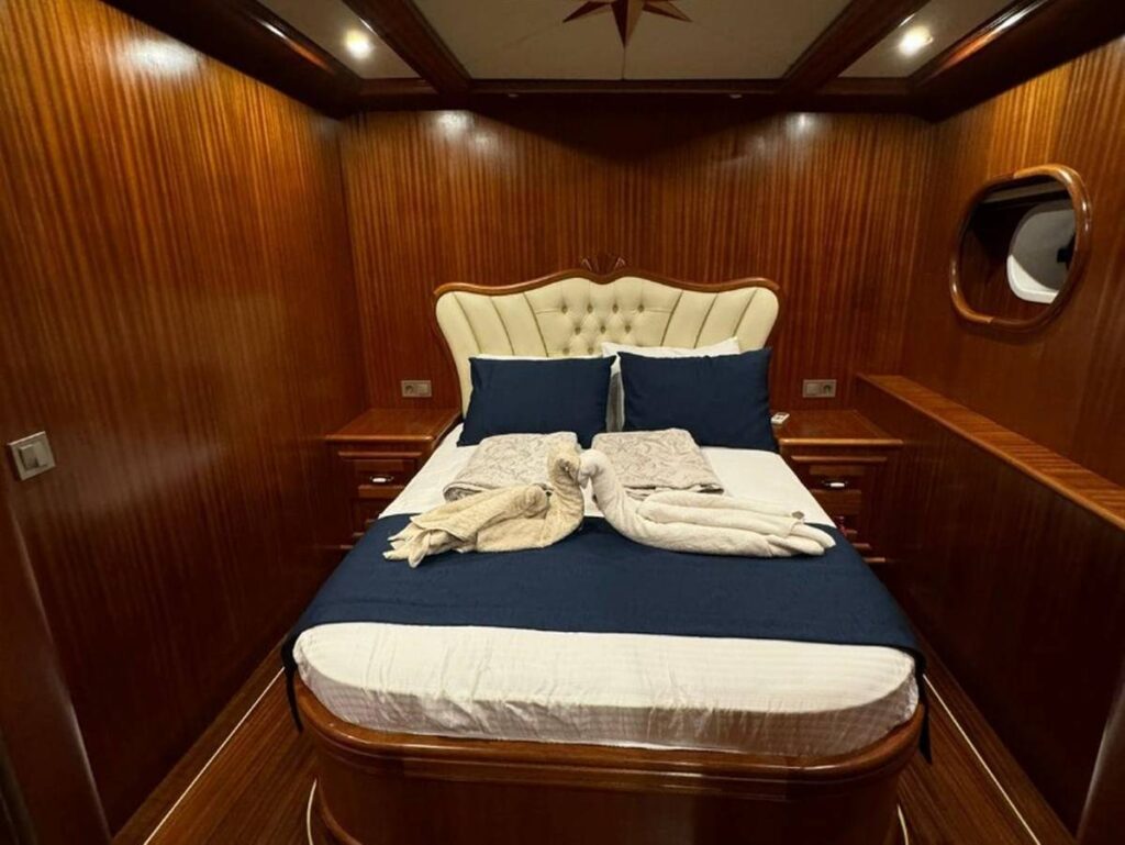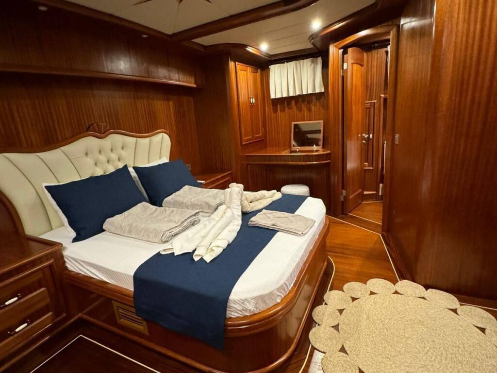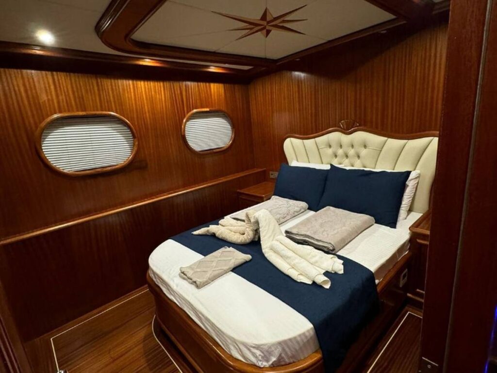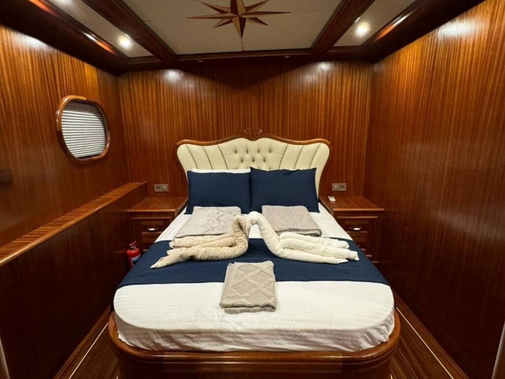 Guletin iç tasarımı modern ve ferah bir anlayışla hazırlanmıştır. Her biri konfor düşünülerek düzenlenmiş 5 kabin, misafirlere rahat bir konaklama sunarken geniş güverte alanları gün boyu dinlenmek, güneşlenmek ve manzaranın keyfini çıkarmak için ideal bir ortam sağlar. Açık havada yemek alanı ise Hisarönü’nün eşsiz manzarası eşliğinde keyifli sofralara ev sahipliği yapar.
