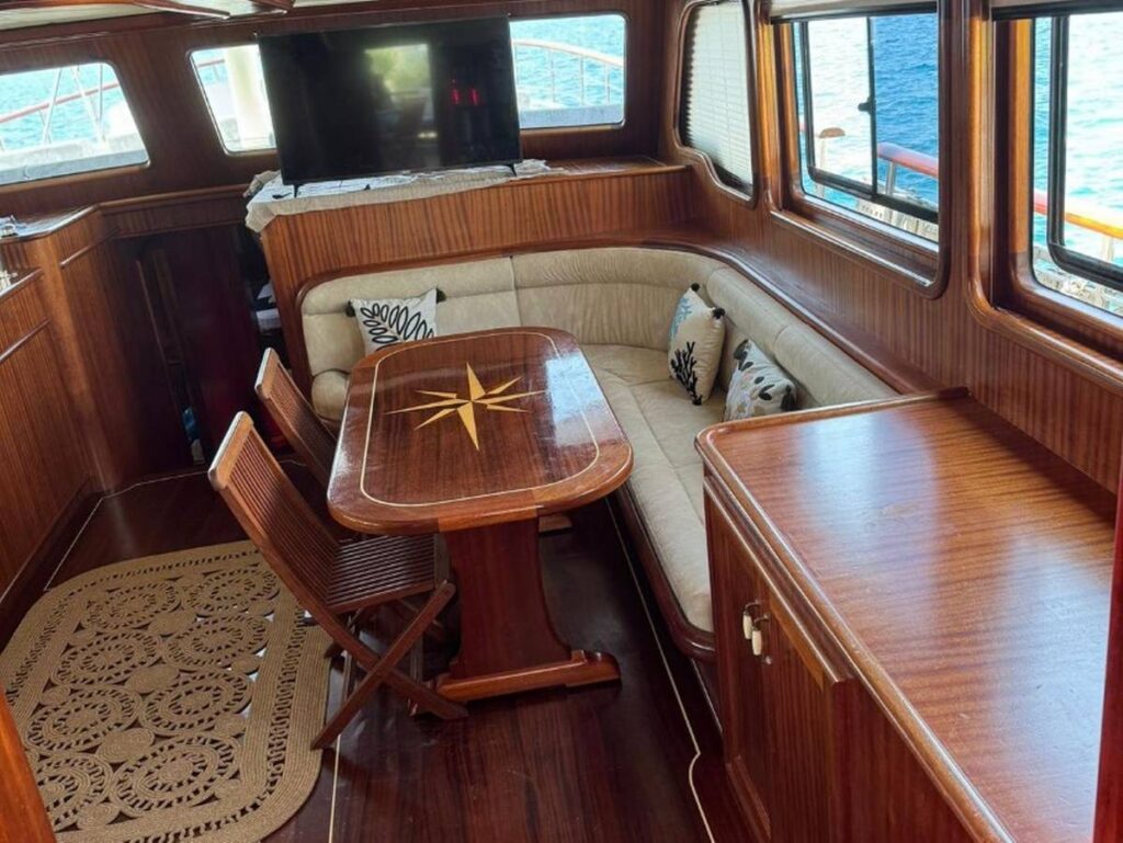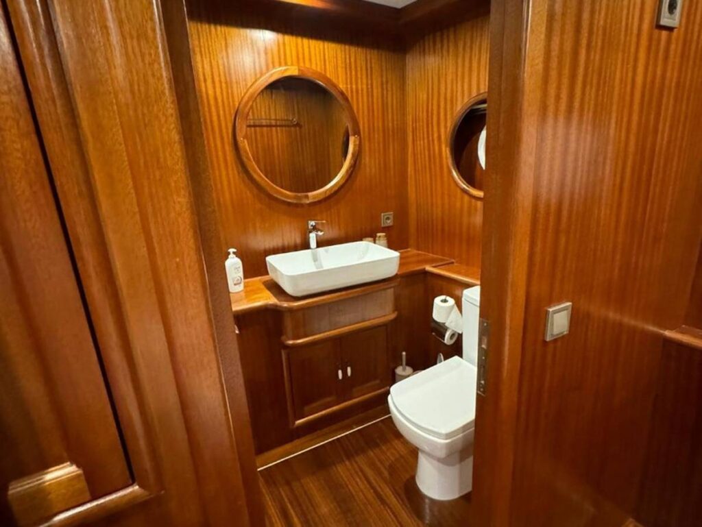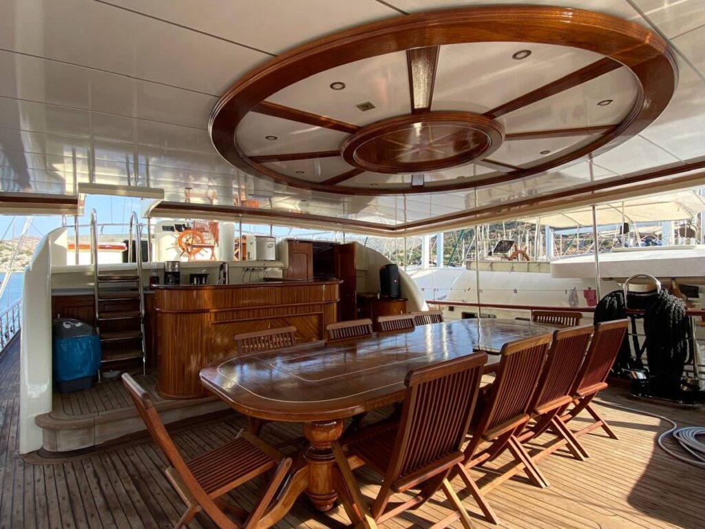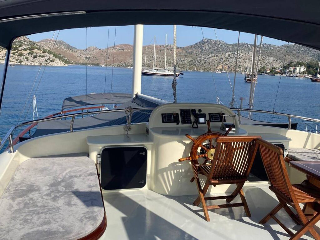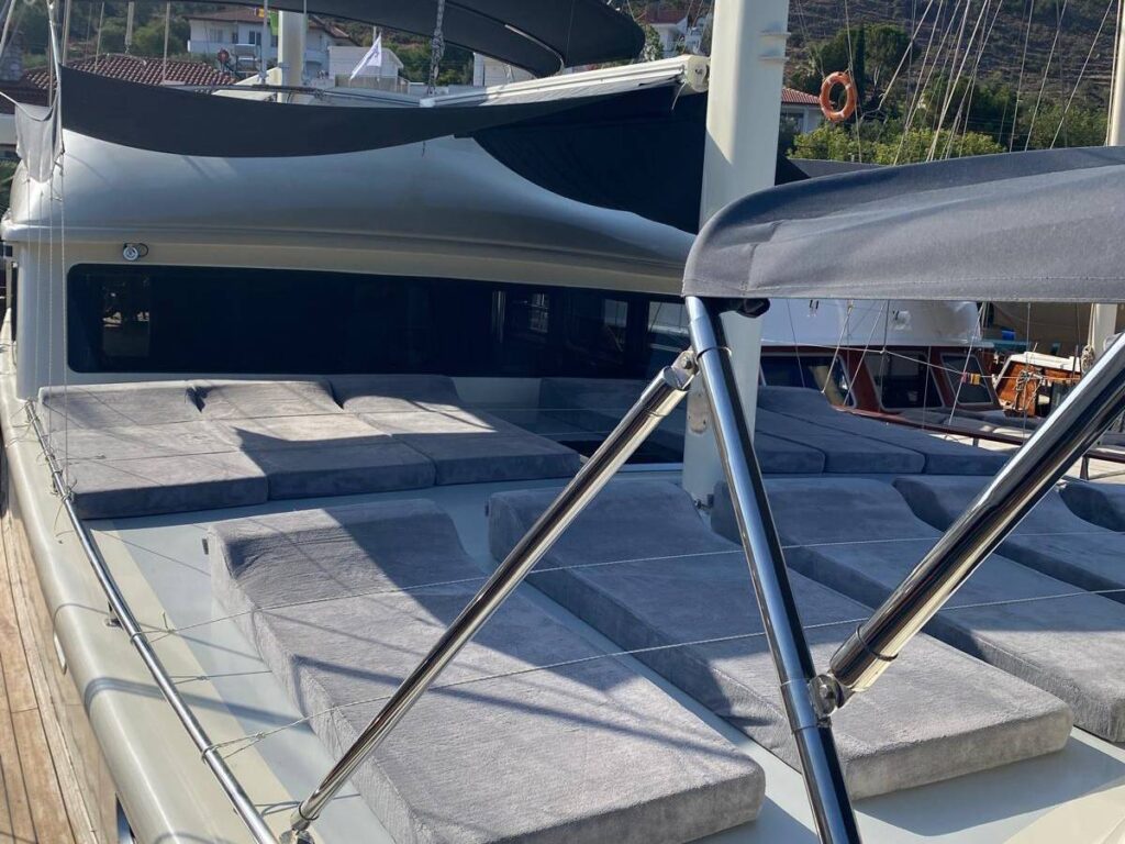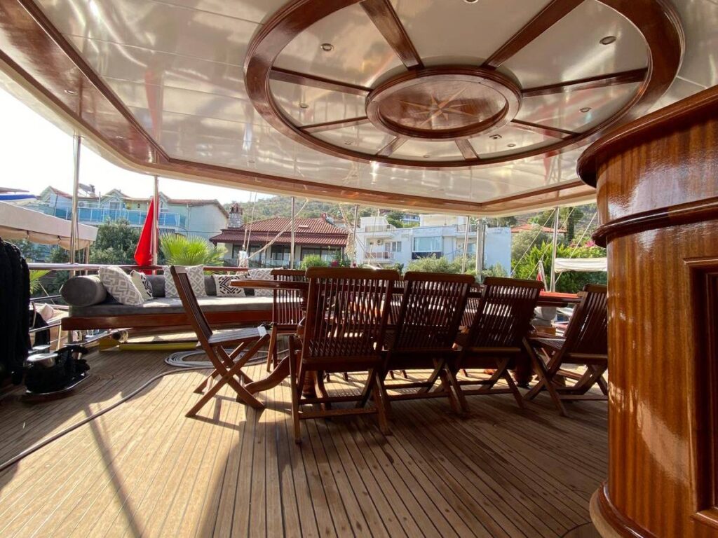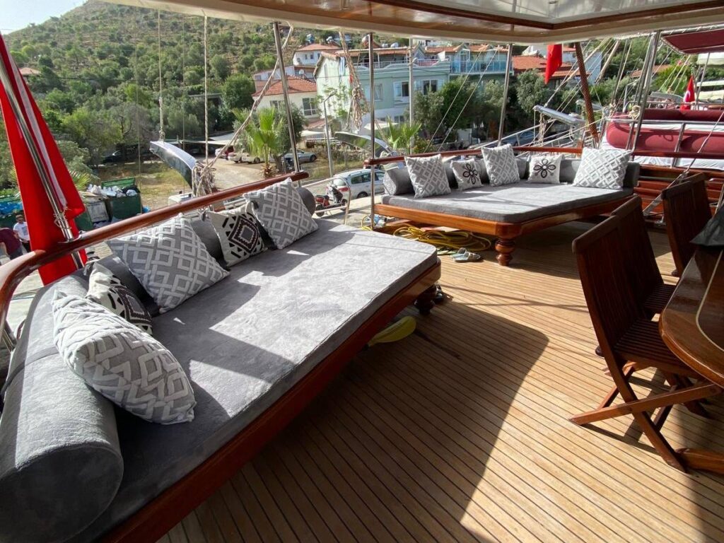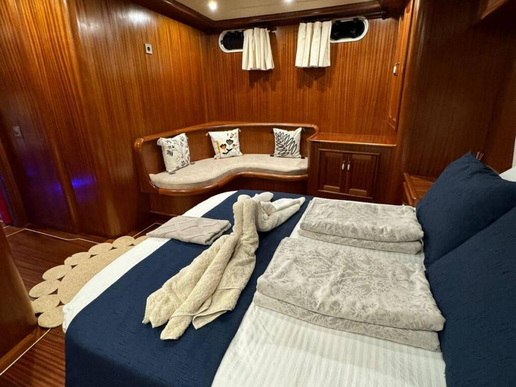 Guletin iç tasarımı modern ve ferah bir anlayışla hazırlanmıştır. Her biri konfor düşünülerek düzenlenmiş 5 kabin, misafirlere rahat bir konaklama sunarken geniş güverte alanları gün boyu dinlenmek, güneşlenmek ve manzaranın keyfini çıkarmak için ideal bir ortam sağlar. Açık havada yemek alanı ise Hisarönü’nün eşsiz manzarası eşliğinde keyifli sofralara ev sahipliği yapar.