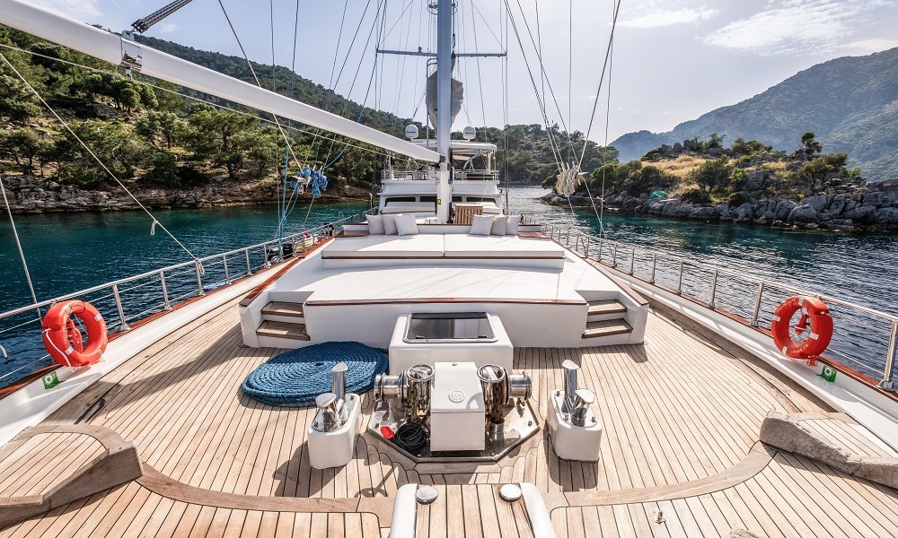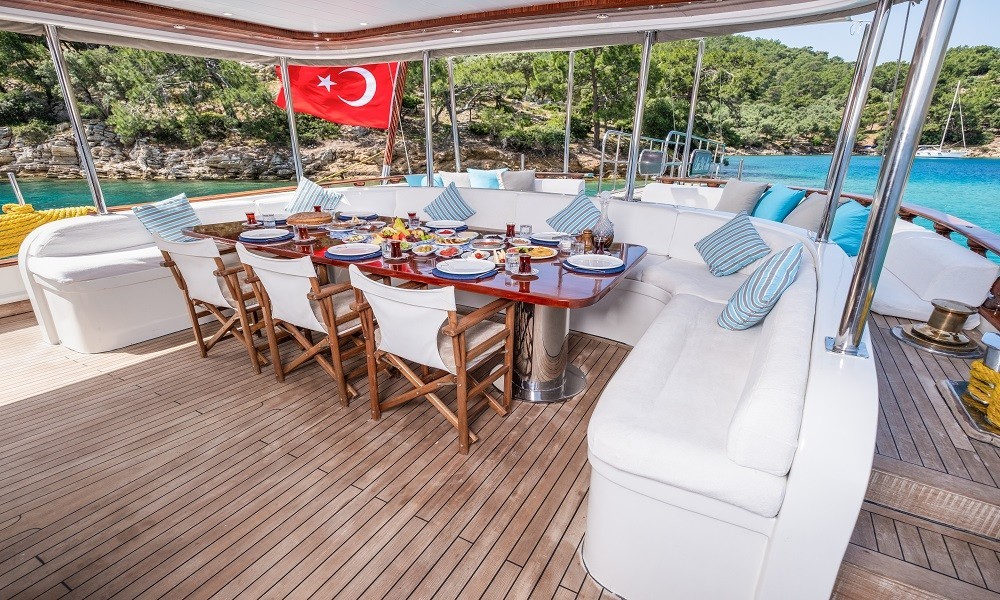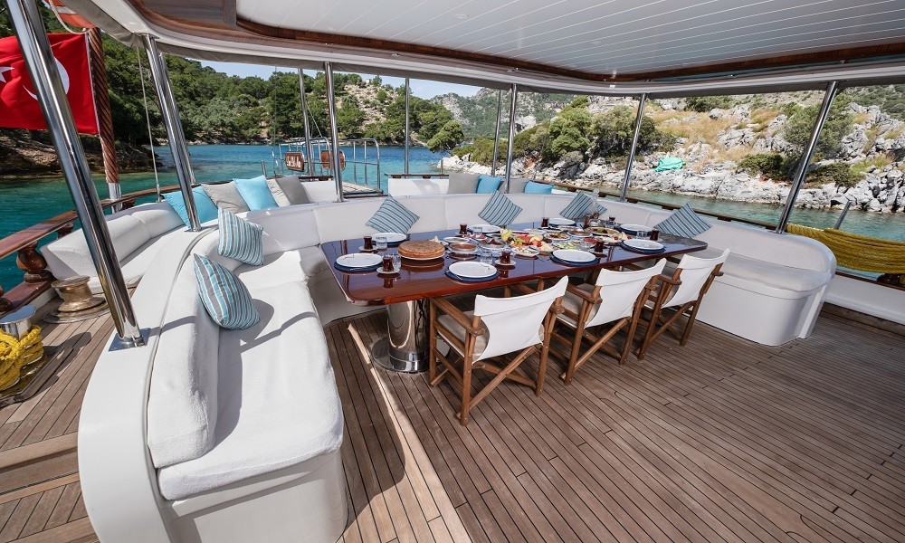 Ön ve arka güvertede yemek ve oturma alanları, üst katta Flybridge kısmı bulunmaktadır. Bol miktarda güneşlenme alanları ve su sporları da bulunan teknemizde 5 deneyimli ekip görev yapmaktadır.
