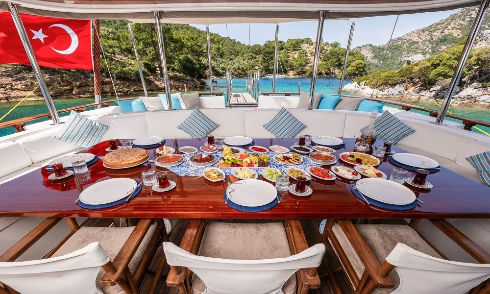 Tam donanımlı iyi bir mutfağı bulunan teknemizde, enfes yemekler hazırlanırken şık sofralar sizin için hazırlanır.