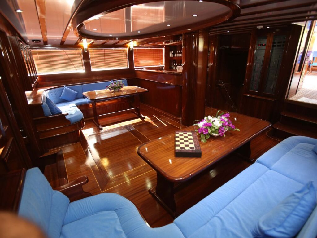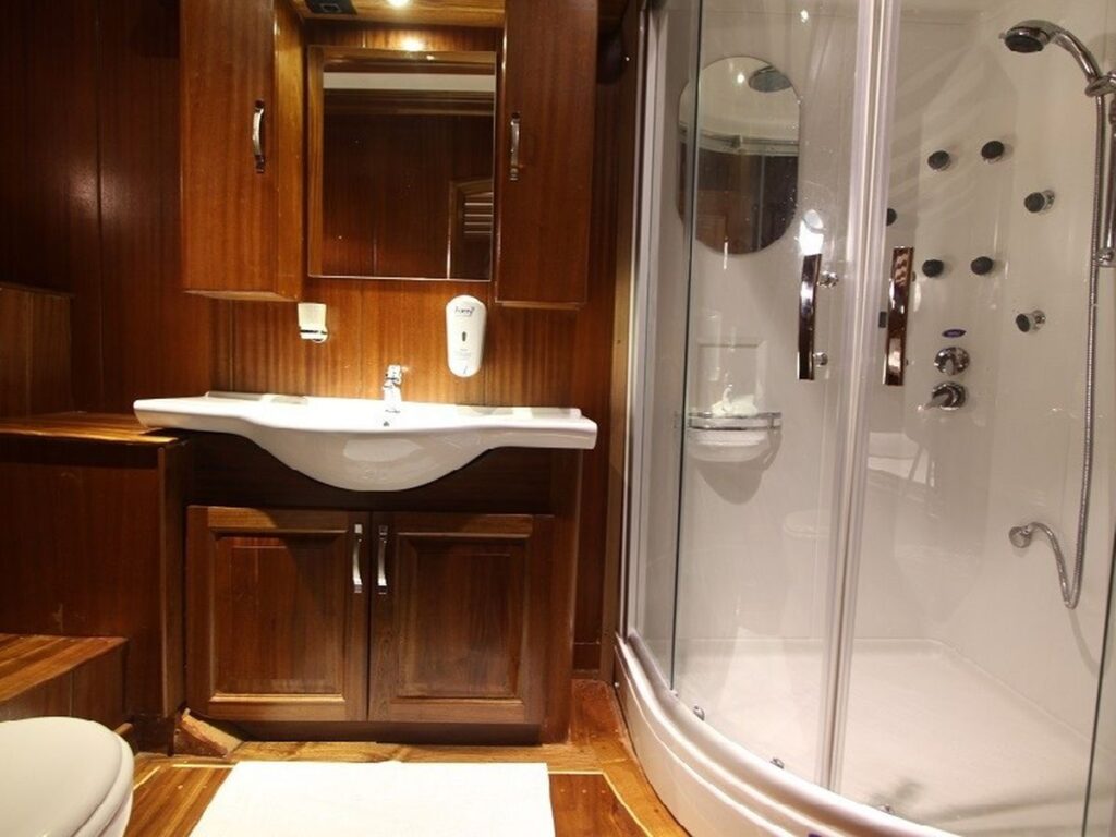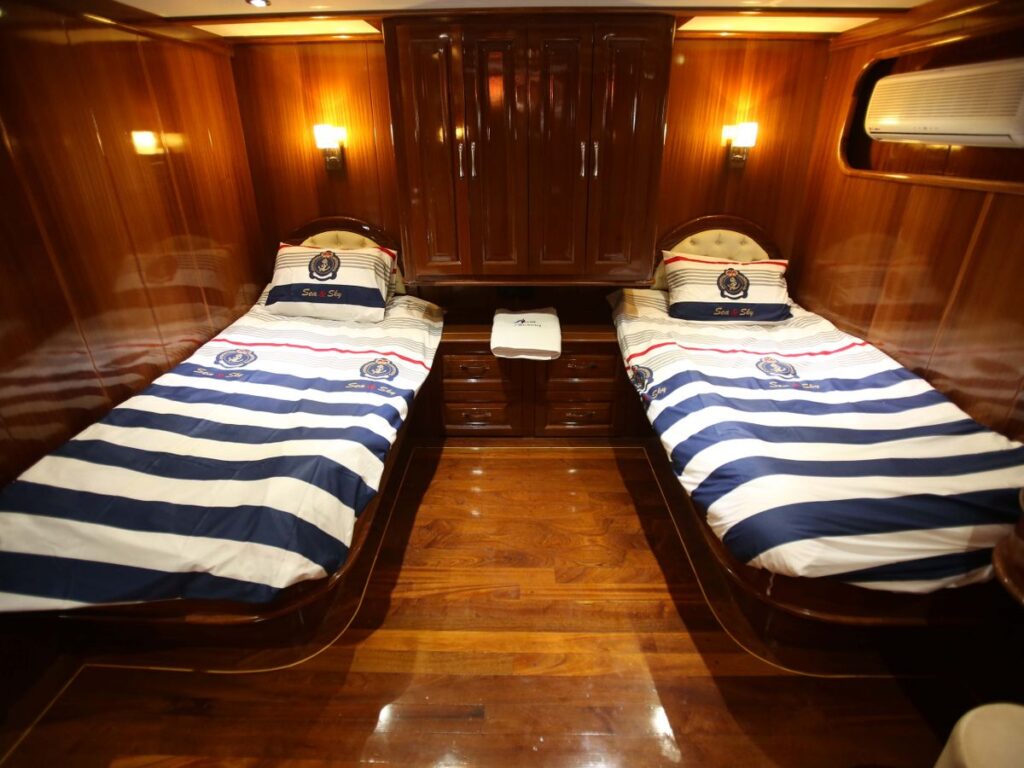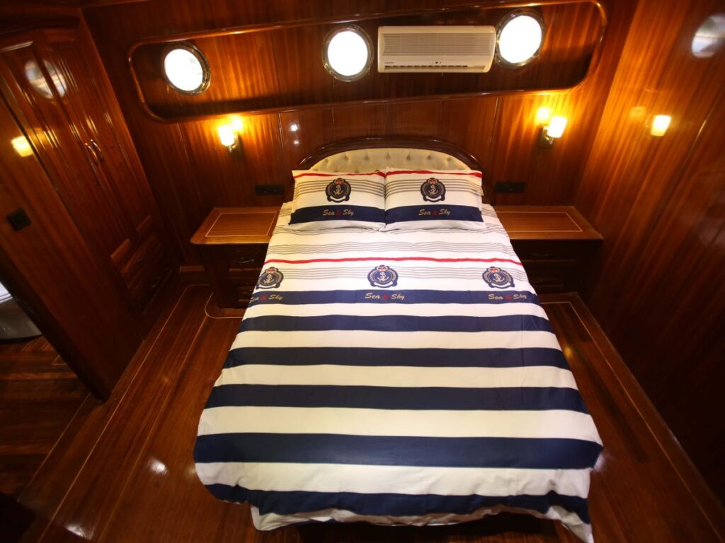 Modern ve ferah kabinler, salon ve güverte misafirlerin konforu için özel olarak tasarlanmıştır. Teknemizde 9 double ve 1 twin kabin bulunmakta olup, mavi yolculuk tatili için her detay düşünülmüştür. Tüm kabinlerde özel duş ve tuvalet vardır ve tüm kabinler klimalıdır. Ayrıca teknenin 20 kişilik bir grupla Yunan adalarına gidebilmesi de bir diğer avantajı. Tam donanımlı güzel bir mutfak, kapalı ve açık yemek alanı ve klimalı bir salonu vardır. Salonda TV, DVD ve müzik sistemi bulunmaktadır. Ön güvertede geniş bir alanda yeteri kadar güneş yatağı bulunmaktadır.