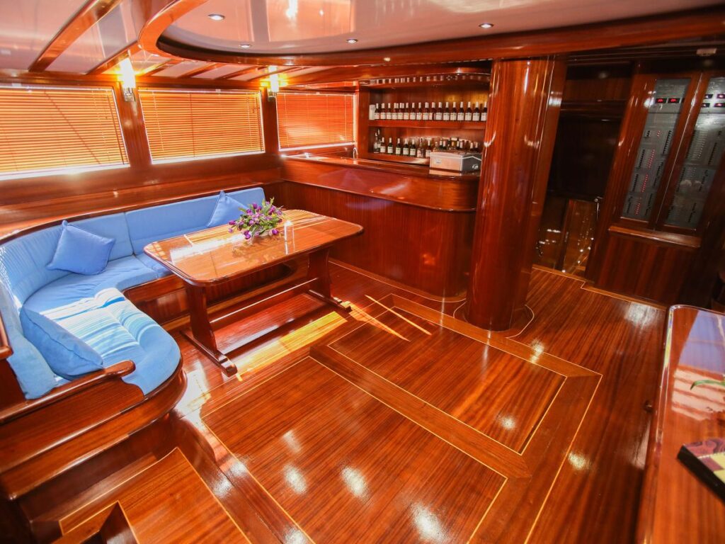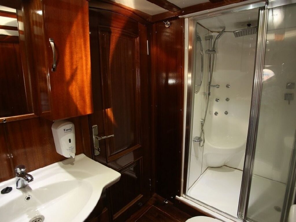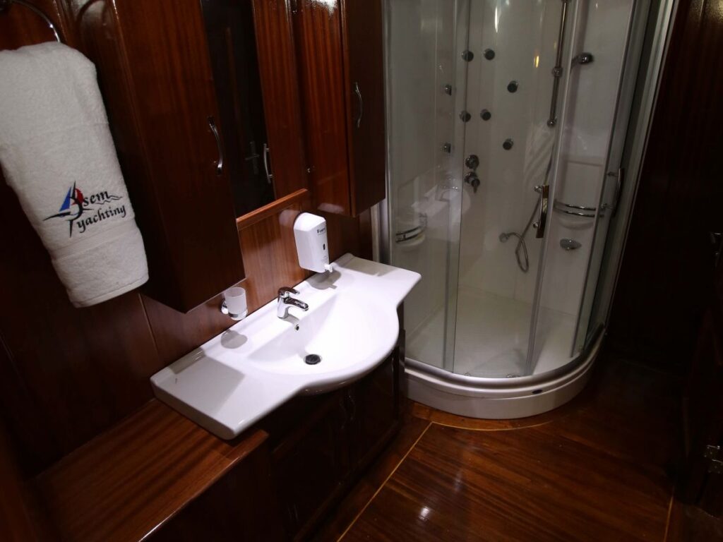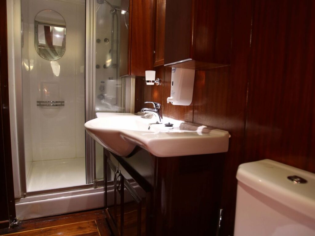 Modern ve ferah kabinler, salon ve güverte misafirlerin konforu için özel olarak tasarlanmıştır. Teknemizde 9 double ve 1 twin kabin bulunmakta olup, mavi yolculuk tatili için her detay düşünülmüştür. Tüm kabinlerde özel duş ve tuvalet vardır ve tüm kabinler klimalıdır. Ayrıca teknenin 20 kişilik bir grupla Yunan adalarına gidebilmesi de bir diğer avantajı. Tam donanımlı güzel bir mutfak, kapalı ve açık yemek alanı ve klimalı bir salonu vardır. Salonda TV, DVD ve müzik sistemi bulunmaktadır. Ön güvertede geniş bir alanda yeteri kadar güneş yatağı bulunmaktadır.