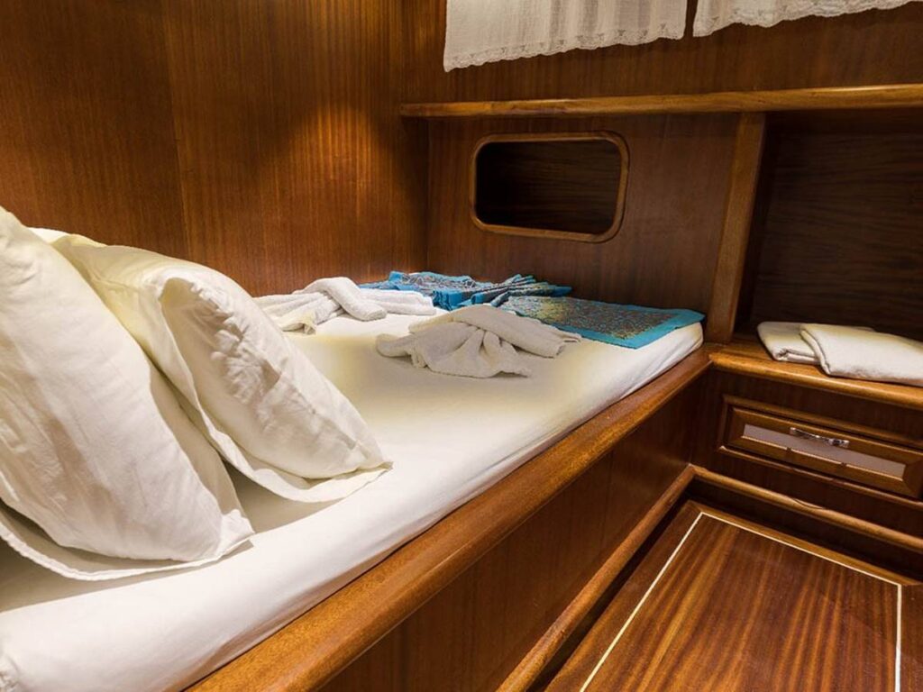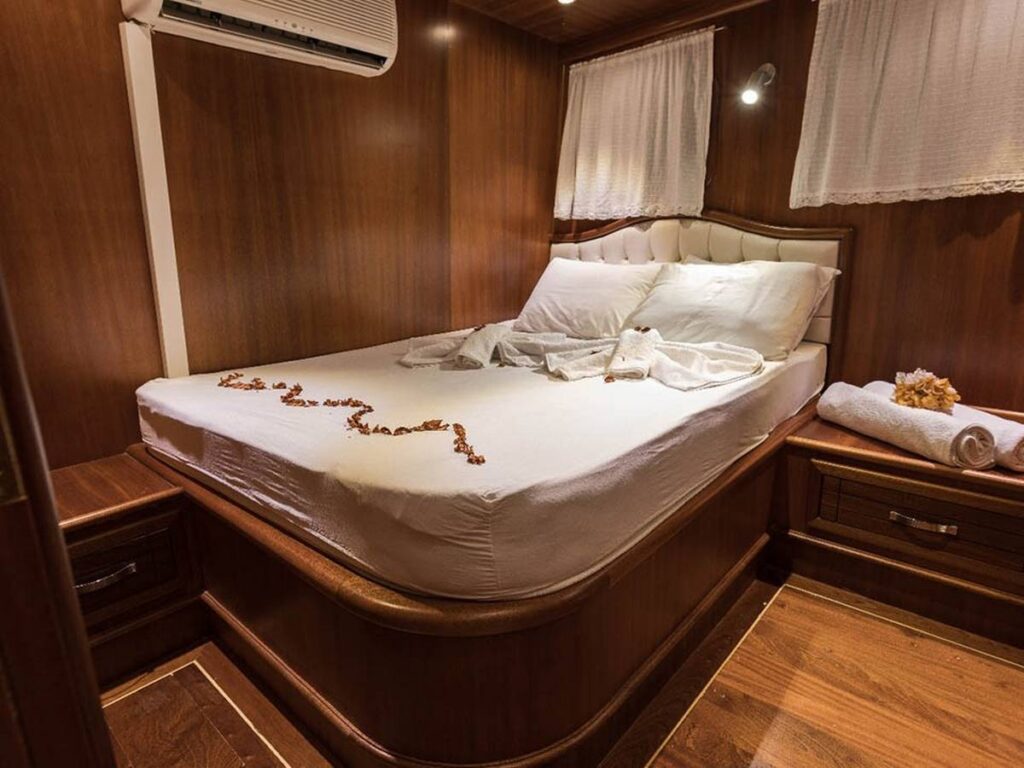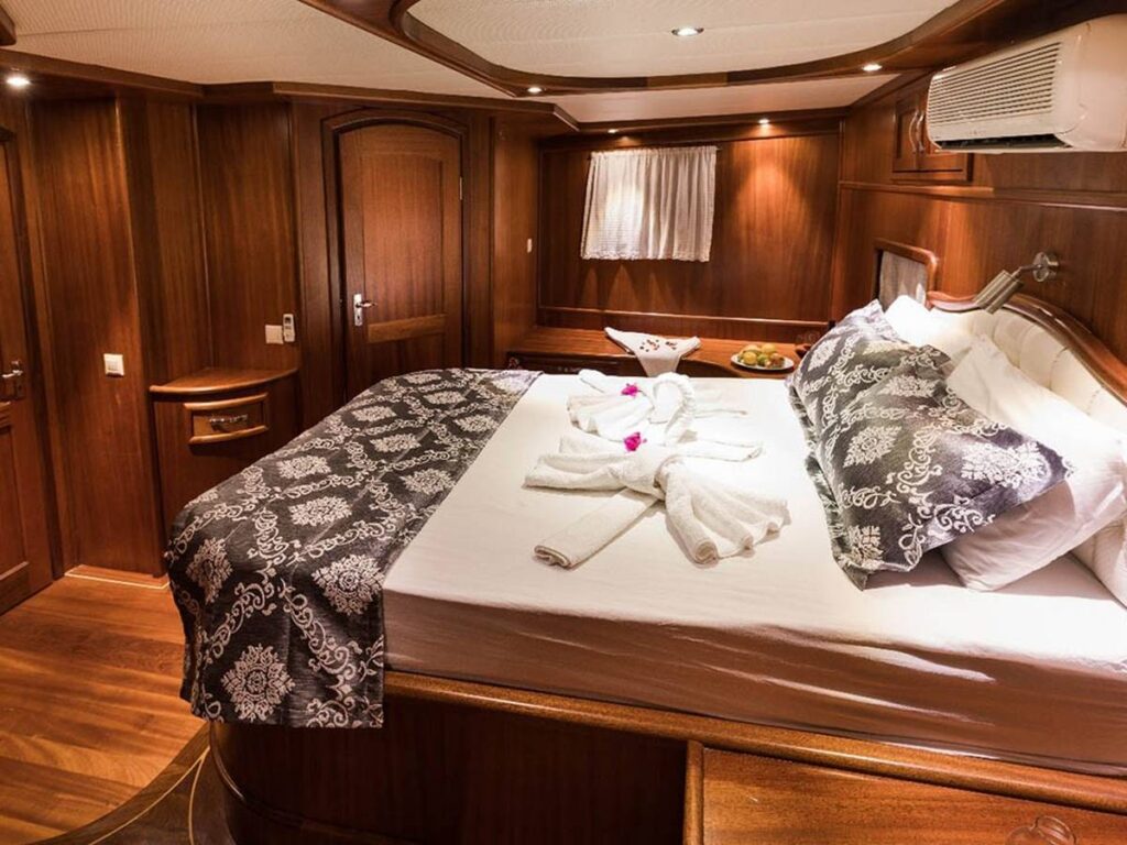 2005 yapımı olan teknemiz, 2019 da tamamen yenilenmiştir. 6 kabini ile 12 kişilik misafir kapasitesine sahiptir. Şık ve zevkli döşenmiş kabinlerin tümü klimalıdır. Ahşap işçiliğinin ön planda olduğu kabinlerinin hepsinin özel duş ve tuvaleti bulunmaktadır. Klimalı salonunda sıcak yaz günlerinde yemeklerinizi rahatlıkla yiyebilir, akşamın hafif serinliğinde güvertede ailenizle güzel anılar biriktirebilirsiniz. Gündüzleri kendinizi ön güvertede bulunan güneşlenme minderlerine atıp, masmavi koyların tadını çıkarabilirsiniz.