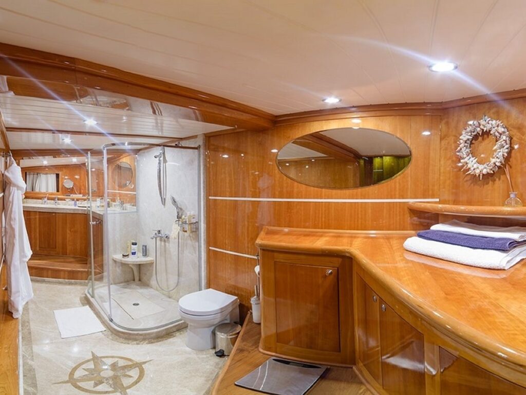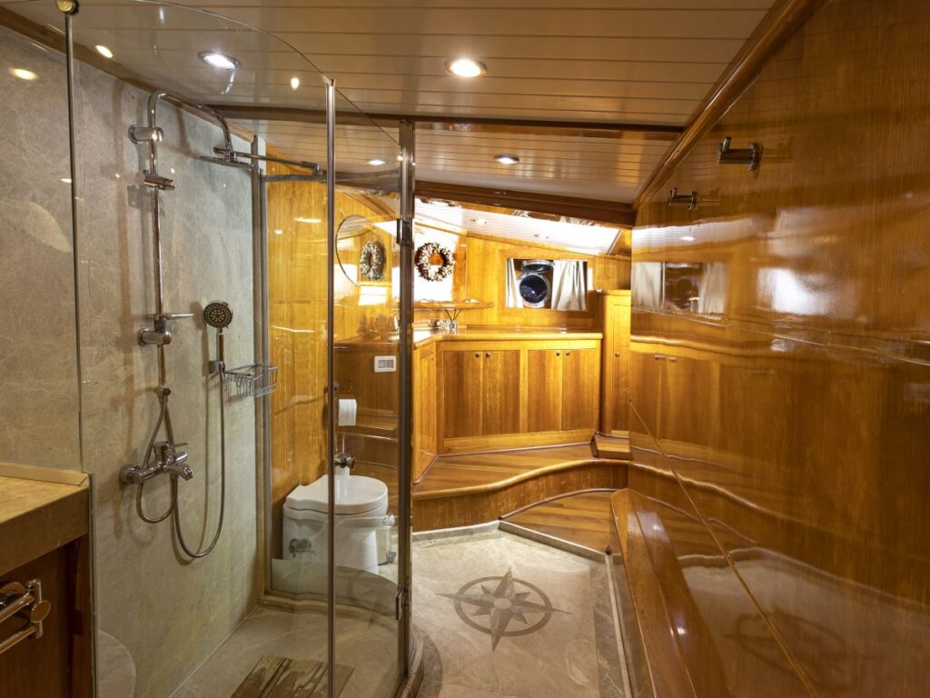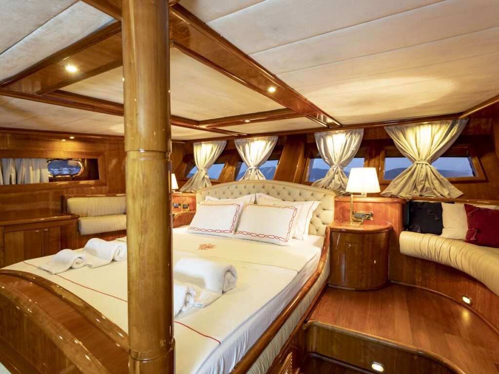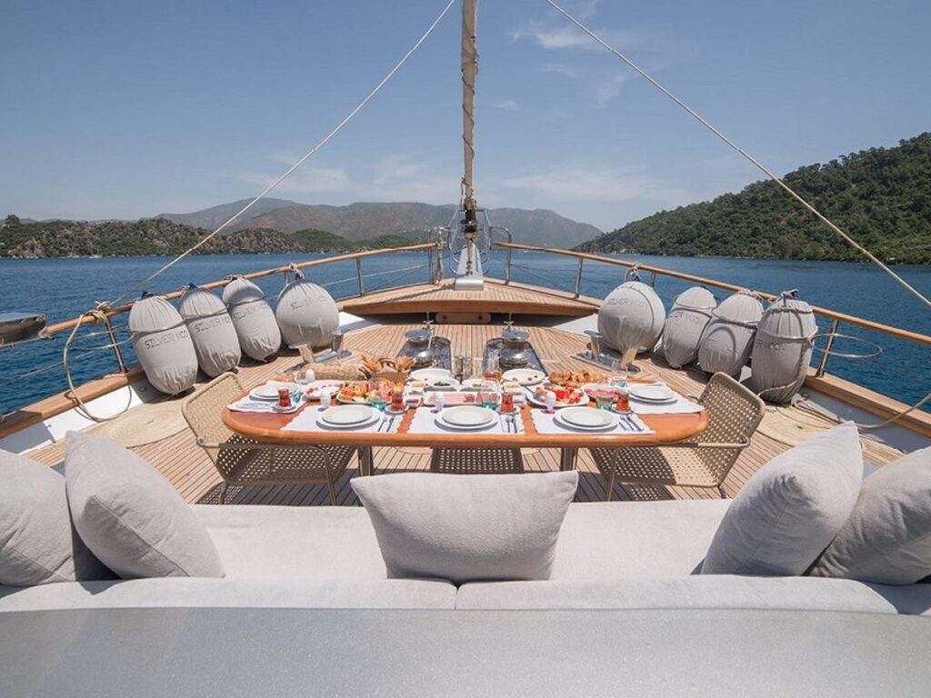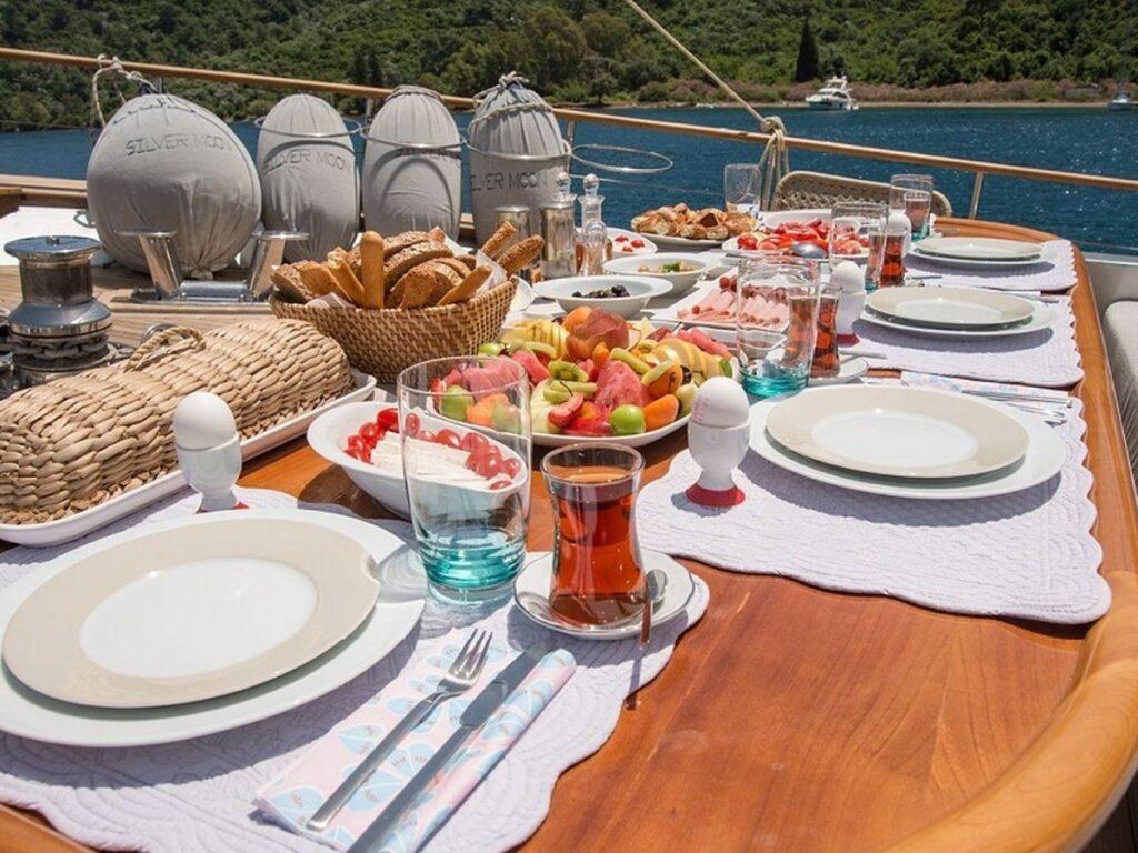 Tüm kabinler ve tüm yat, her kabinde özel duş ve tuvalet imkanı ile sıcak yaz günlerinde konforlu bir konaklama için klima ile donatılmıştır. Tüm kabinlerde TV, DVD ve müzik sistemi vardır. 5 deneyimli ekibi ile mavi yolculuğunuz sırasında en iyi hizmeti alacağınız bu muhteşem teknede lüksü yaşayacaksınız. Silver Moon Gulet’in iç tasarımı da oldukça şıktır. Salonda ve güvertede yemek masalarında göz alıcı sofralar kurulurken siz de farklı lezzetlerin tadını çıkarıyorsunuz. Salonda TV, DVD ve müzik sistemi bulunmaktadır. Yemekleriniz tam teşekküllü ayrı bir mutfakta sizin için hazırlanırken, tüm misafirlerimiz için yeterli güneşlenme alanları ve minderlerde güneşin tadını çıkarabilirsiniz.