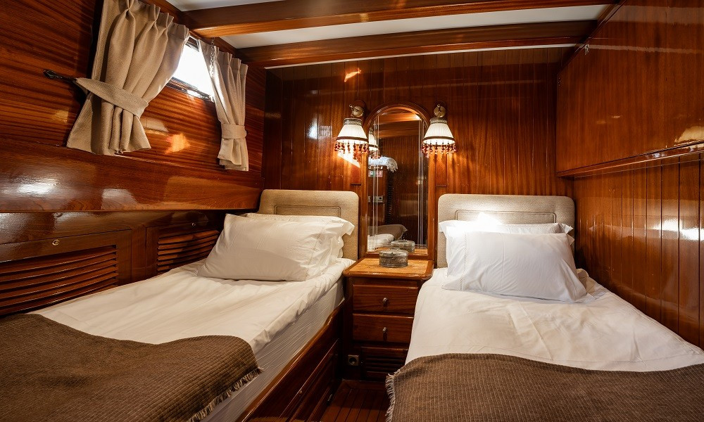 Salon ve güverte ile özel olarak tasarlanmış modern ve ferah kabinler bulunmaktadır. 1 Master, 1 VIP Double, 1 Double ve 2 Twin Kabinlerde her biri kendi duşu ve tuvaleti bulunan 10 + 2 misafirini ağırlayabilir. Tüm kabinler klimalıdır. Hem iç hem de dış mekan zevk ve tarzla tasarlandı. Tam donanımlı bir mutfak, kapalı ve açık yemek alanı ve klimalı bir salon bulunmaktadır. Salonda TV, DVD ve müzik sistemi bulunmaktadır. Ayrıca herkes için bol miktarda şezlong bulunan geniş bir güneşlenme terası da vardır.