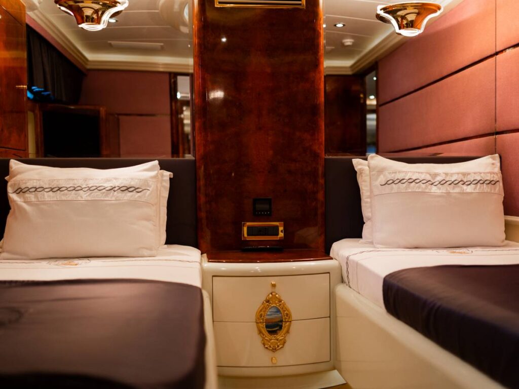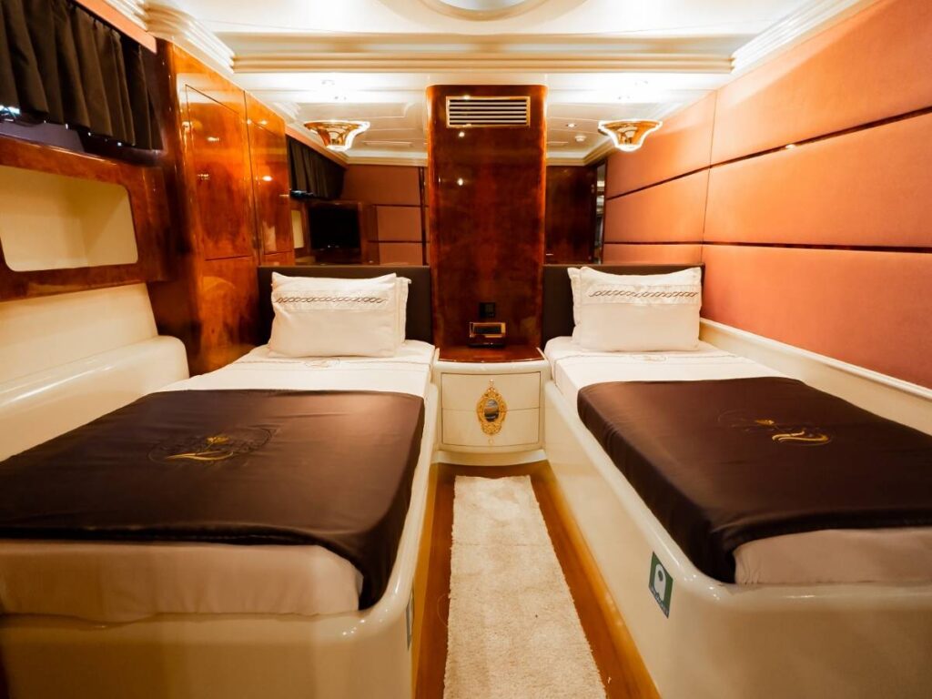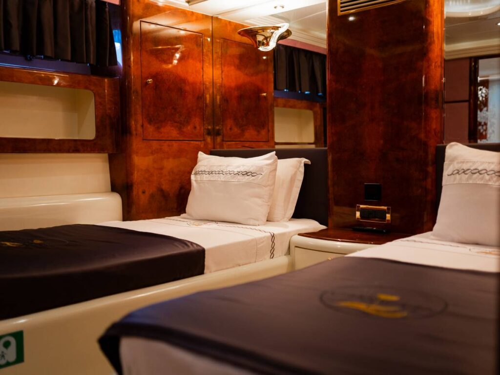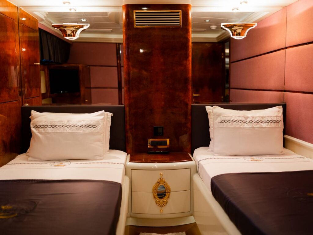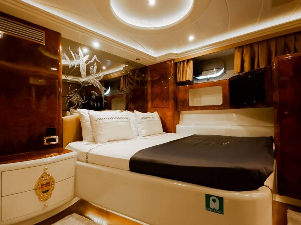 6 kabini ile 12 kişilik kapasitesi vardır. Tüm yat klima ile donatılmıştır. Kabinlerde hem konfor, hem de rahatlık ön plandadır. Kabinlerin hepsinde Uydu TV-Apple TV-Ip TV sistemi vardır. Ayrıca master kabin ve Vip kabin jakuzilidir.
