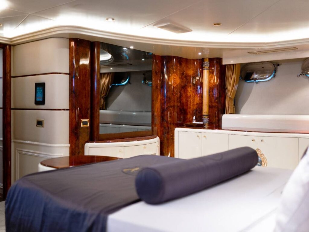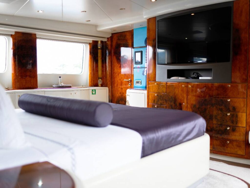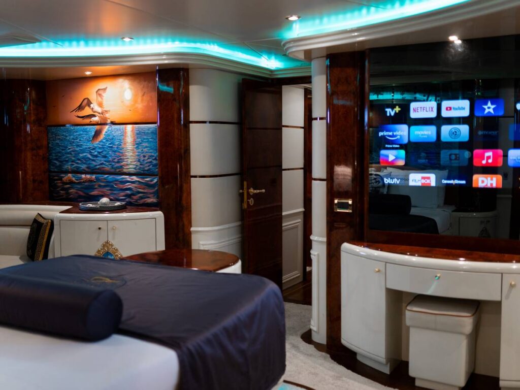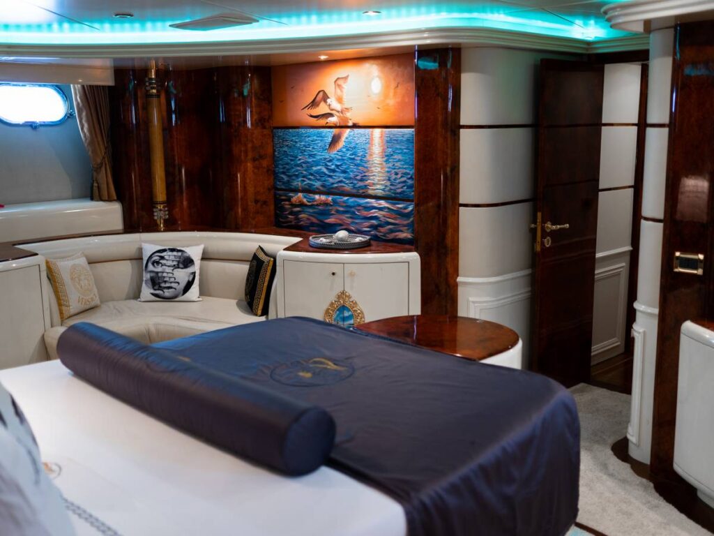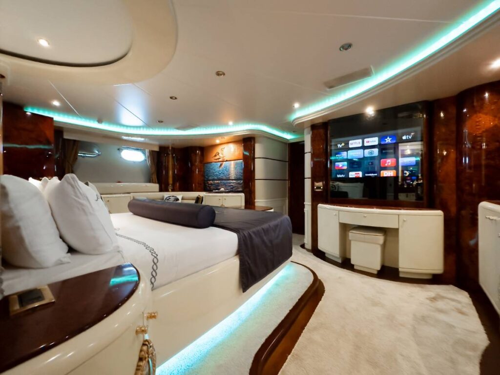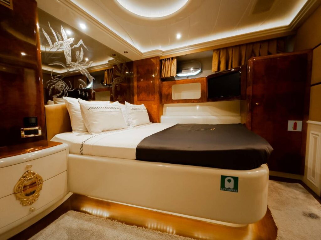 6 kabini ile 12 kişilik kapasitesi vardır. Tüm yat klima ile donatılmıştır. Kabinlerde hem konfor, hem de rahatlık ön plandadır. Kabinlerin hepsinde Uydu TV-Apple TV-Ip TV sistemi vardır. Ayrıca master kabin ve Vip kabin jakuzilidir.