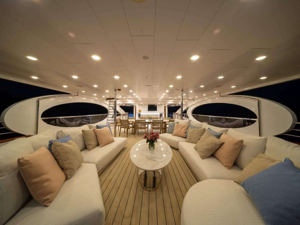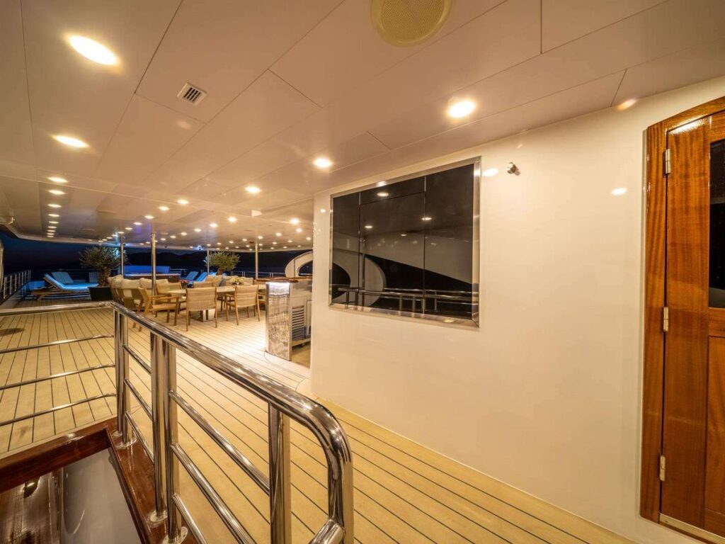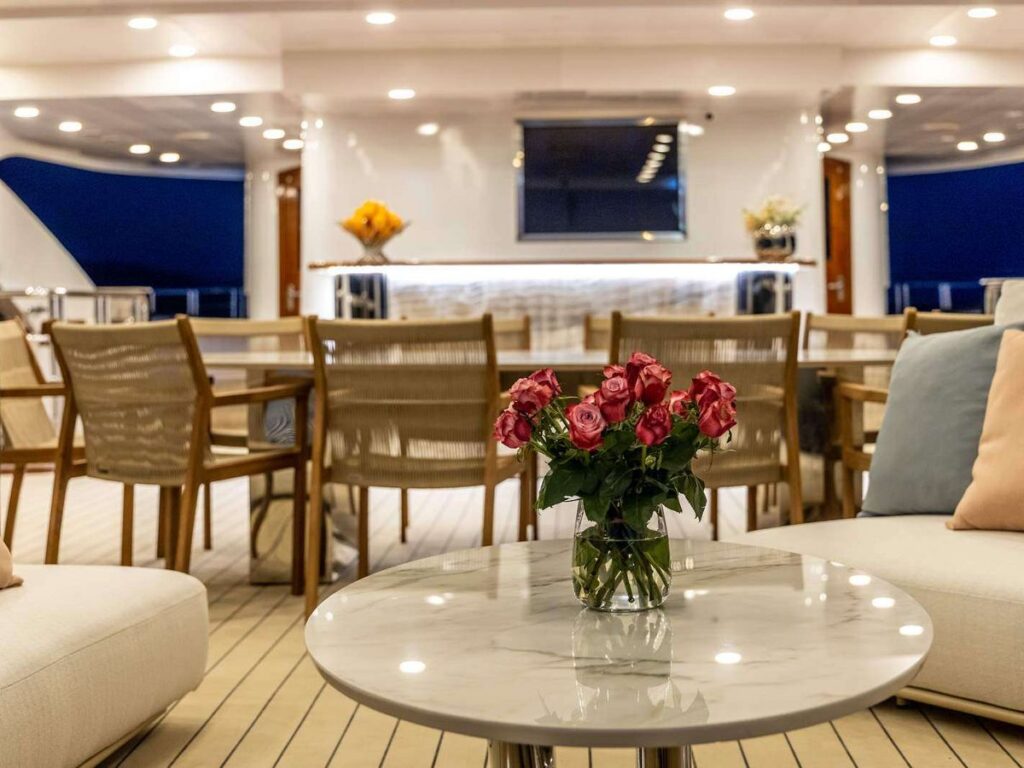 Güneşe tapan herkes için geniş bir üst güverte, D vitamininin tadını çıkarmak için ideal bir yerdir. Şık bir açık hava barı ve bir sonraki varış noktanıza yelken açarken sabah kahvenizi yudumlamak için mükemmel olan gölgeli bir dinlenme alanı ile.