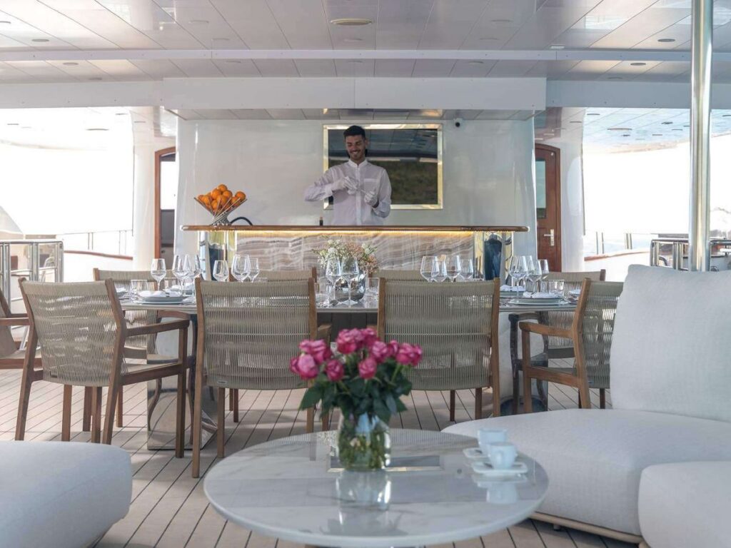 Olimp’in ana güvertesinde zarif bir salon bulunmaktadır. Rahatlatıcı ve minimalist bir tasarıma sahip geniş bir alan, zevkinize uygun zengin bir gurme mutfağı eşliğinde en iyi çeşitlerden şaraplar eşliğinde bir yemek için sizi davet ediyor.