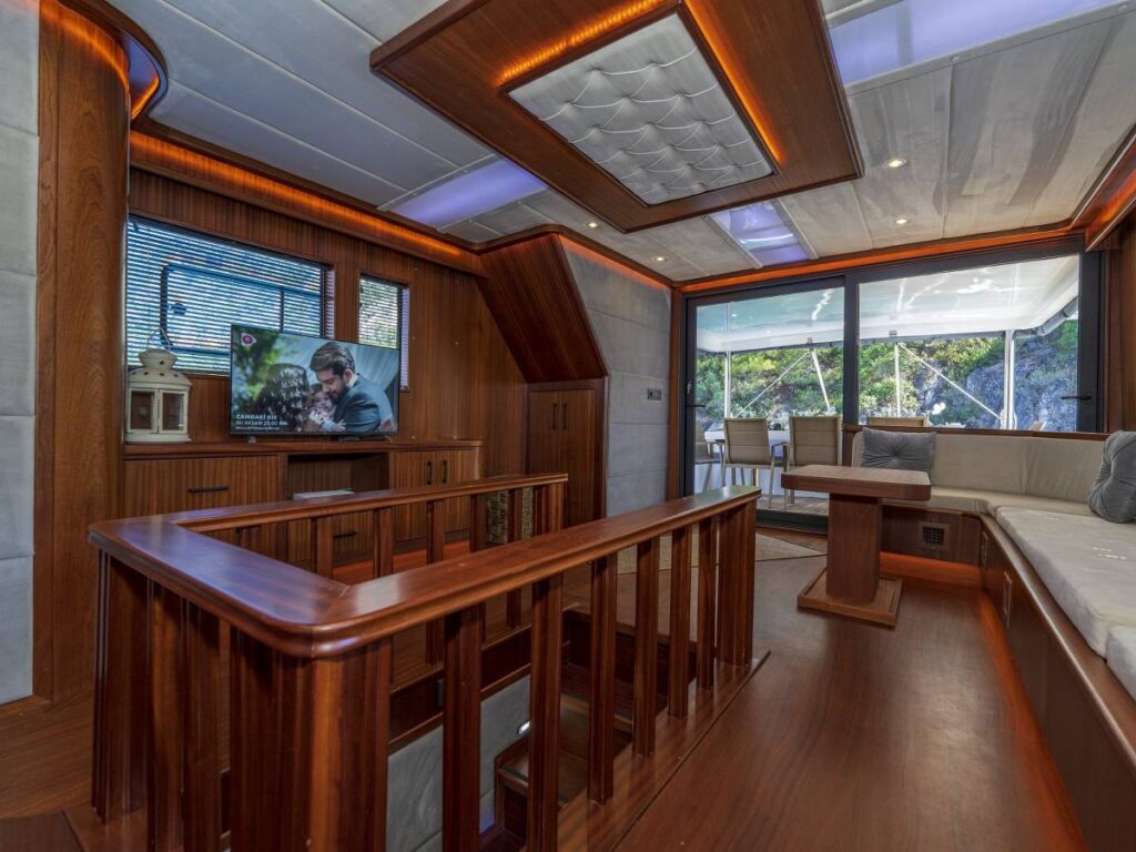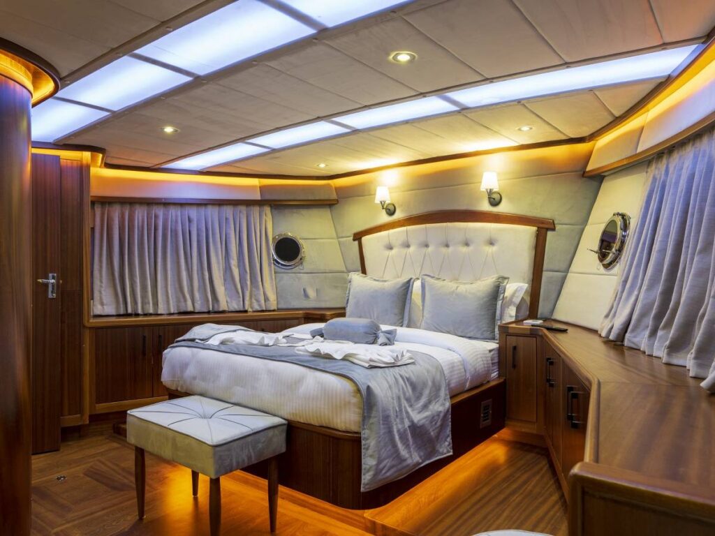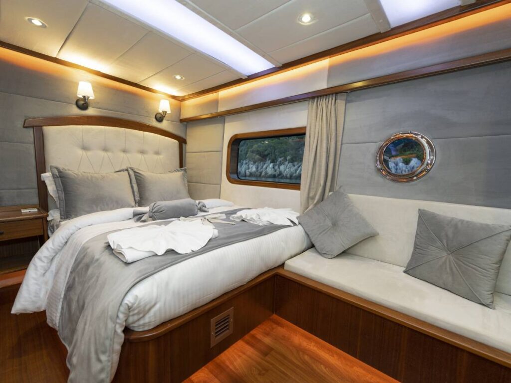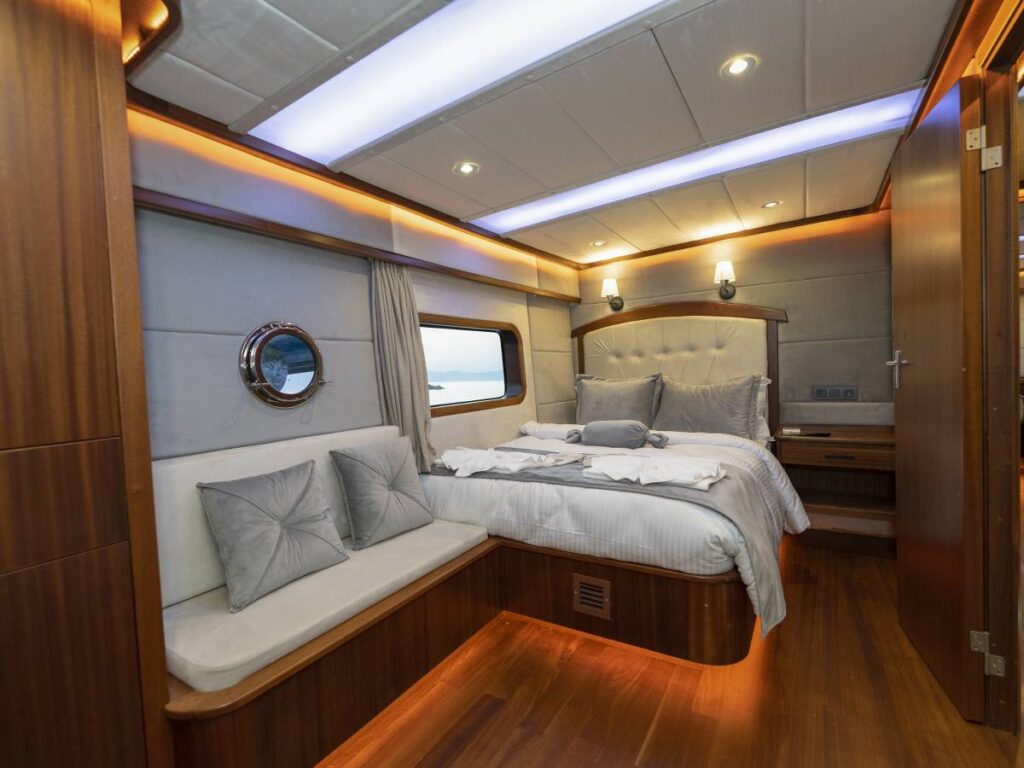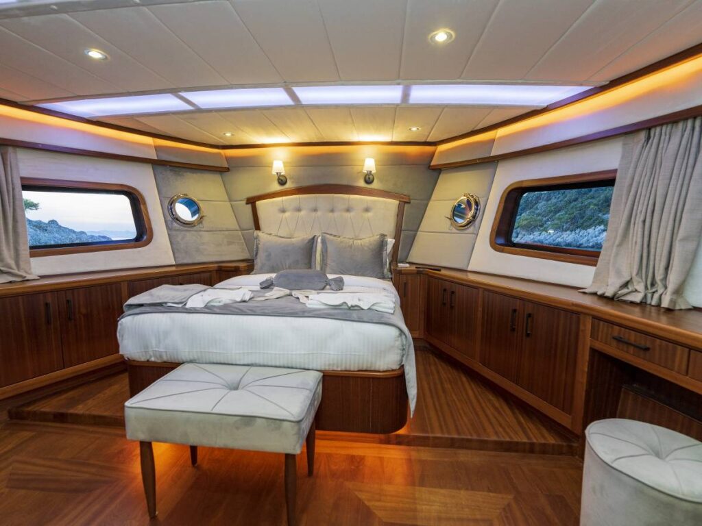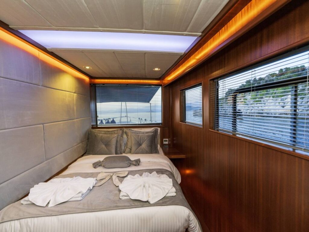4 kabini- 8 kişilik kapasitesi ile Göcek’in eşsiz sularında seyir yapmaktadır. Tüm kabinler TV-Klima-WC-Müzik sistemi ile donatılmıştır. 24 saat sıcak su bulabilirsiniz. Kabinler konforlu ve ferahtır. Güverteler şık ve kullanım rahatlığı sağlar. Flybridge ise tam bir keyif alanıdır. Gününüzün çoğunu geçirebileceğiniz bu alan aynı zamanda size özel bir yaşam alanı da sağlar.